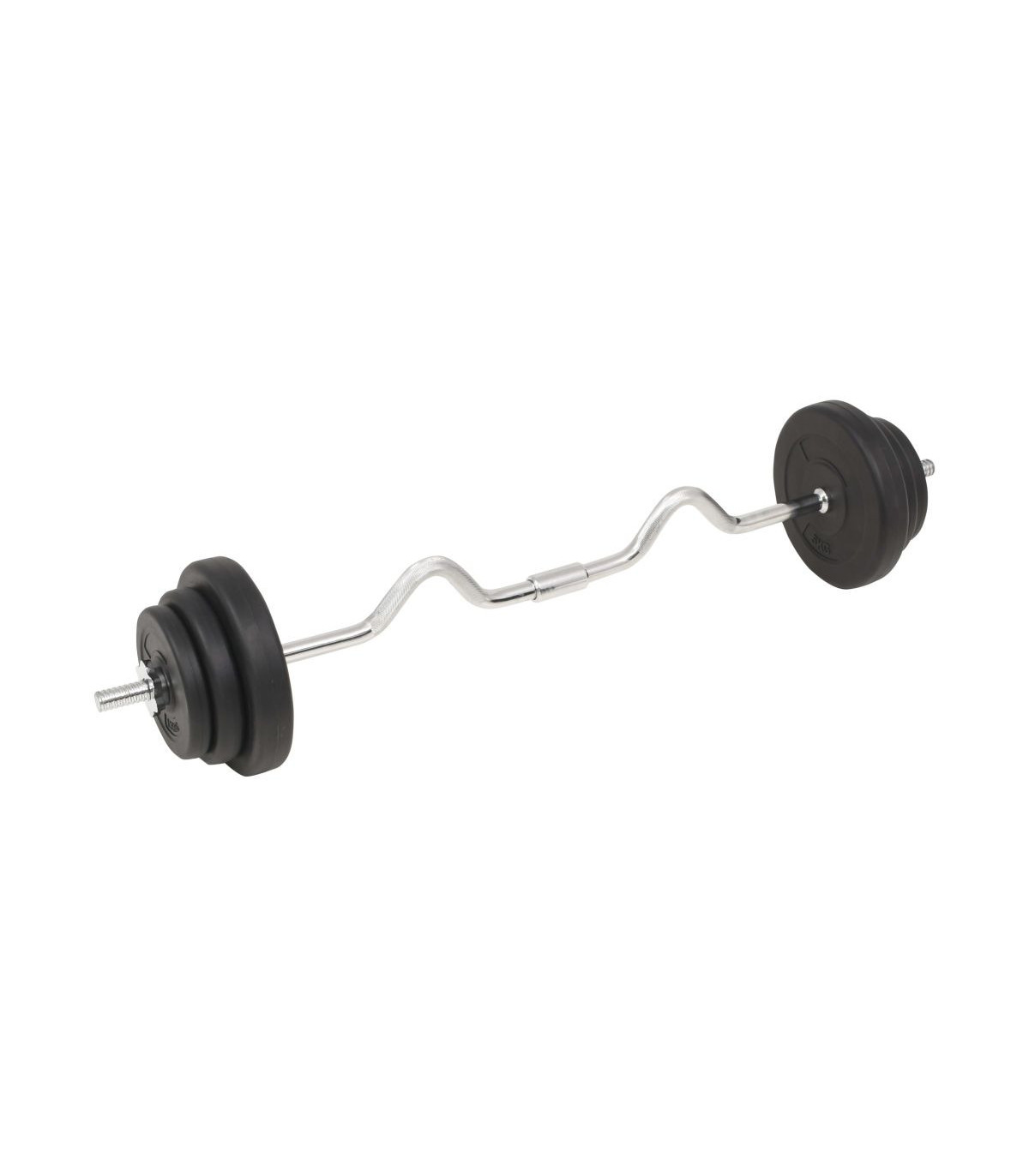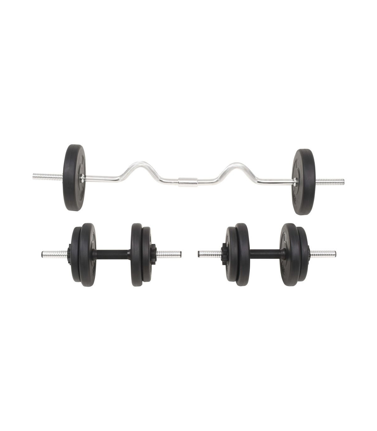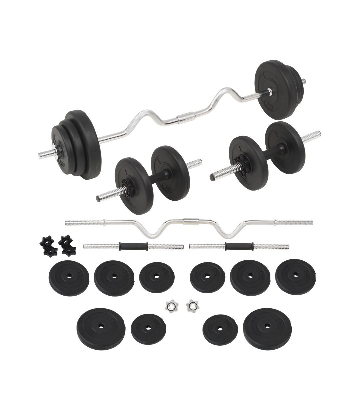 This set of ergonomically designed barbell/dumbbell set will allow you to perform a large range of exercises more easily and safely at home or in the gym. The set includes 1 barbell, 2 dumbbells, and 16 weight discs. The barbell/dumbbell set features solid chrome-plated bars with quick-action spring collars (barbell bar), non-slip grips, and fluted star-screw caps (dumb bell bar) for secure attachment of the weight discs. You can work out without worrying about safety issues. The weight discs are made with a robust PE casing. They can be combined in various ways for different training purposes. Delivery includes 1x barbell bar, 2x dumbbell bars, 6x 1.25 kg weight discs, 4x 2.5 kg weight discs, 4x 5 kg weight discs, 2x 10 kg weight discs, and 6x caps.