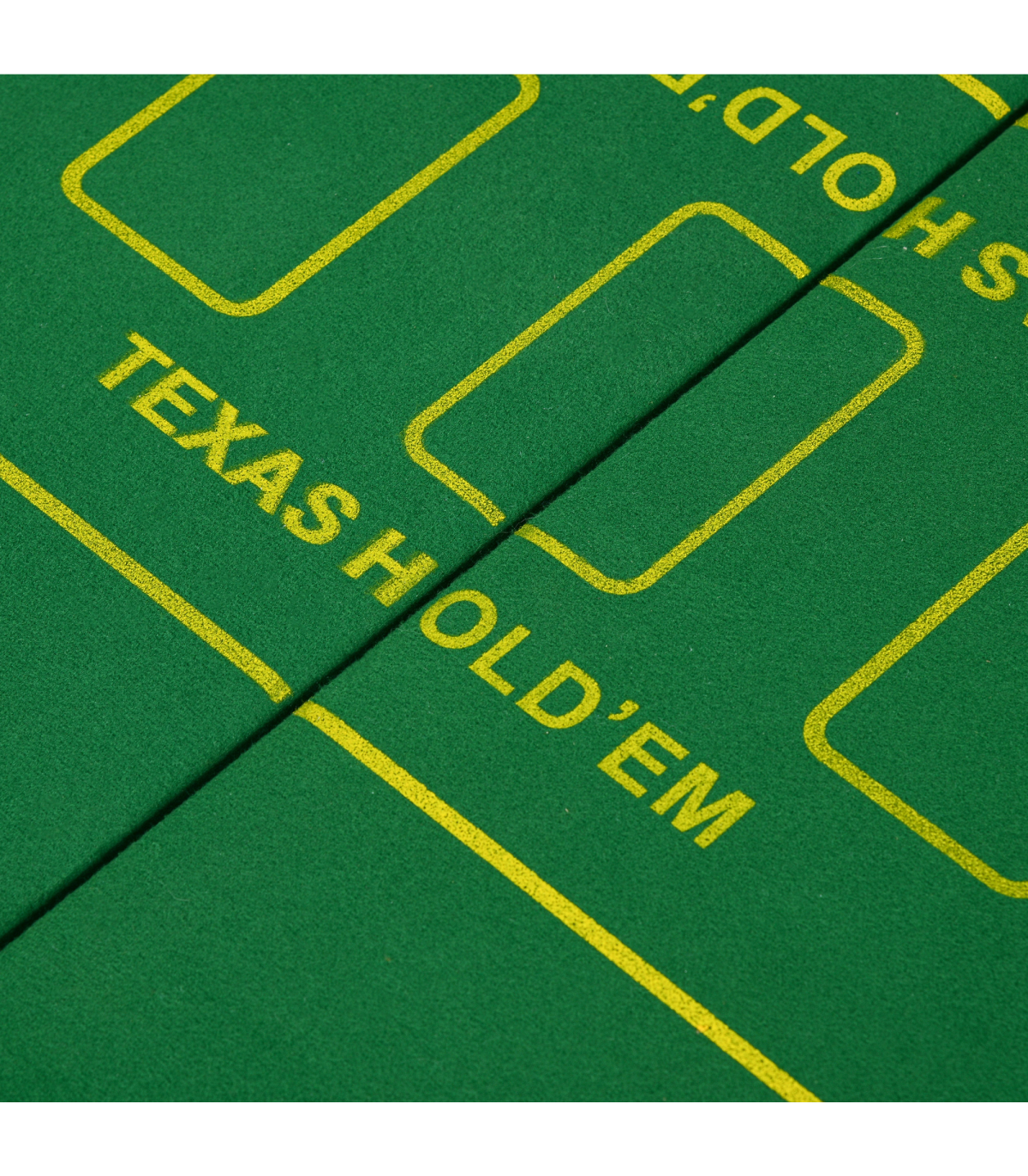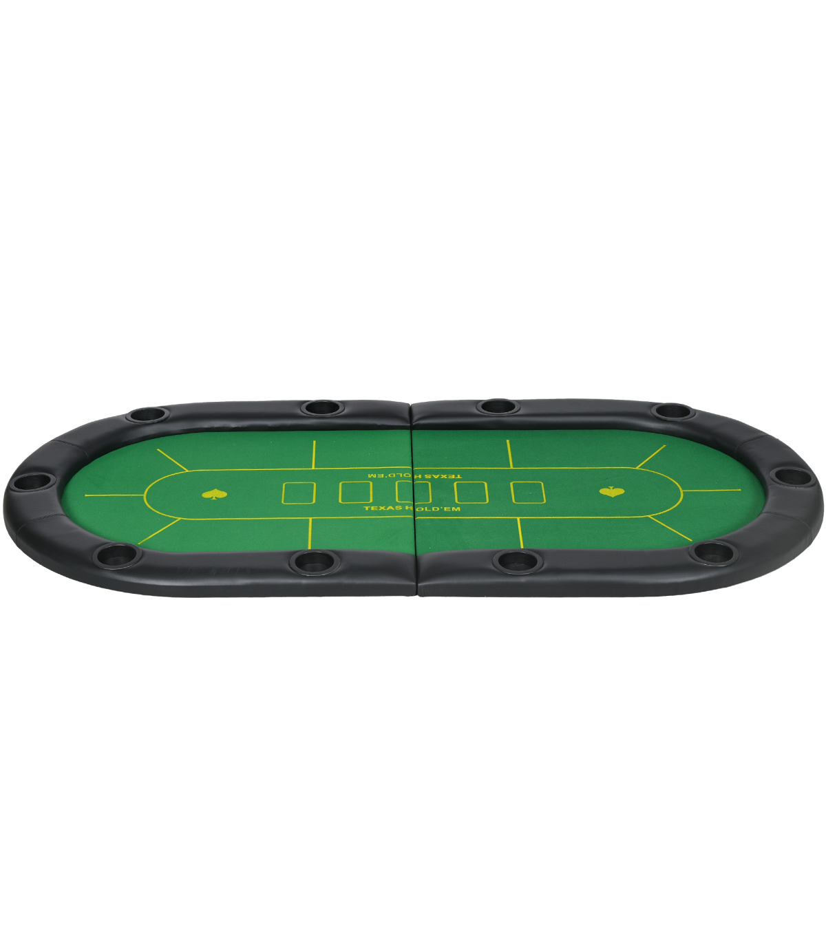 - Foldable and a carry bag included, so you can take it anywhere; - Suitable for up to 10 players; - MDF structure with a light cotton flannel cover; - Covered with a professional style green felt; - 10 built-in cup holders included; - Colour: Green and black; - Material: Cotton flannel cover and MDF board; - Overall dimensions: 180L x 90W x 3Dcm. Folded: 67L x 90W x 10Dcm. Cup holder diameter: 8cm; - Item label: A70-083V00GN; NOTE: Play cards and chips NOT included;