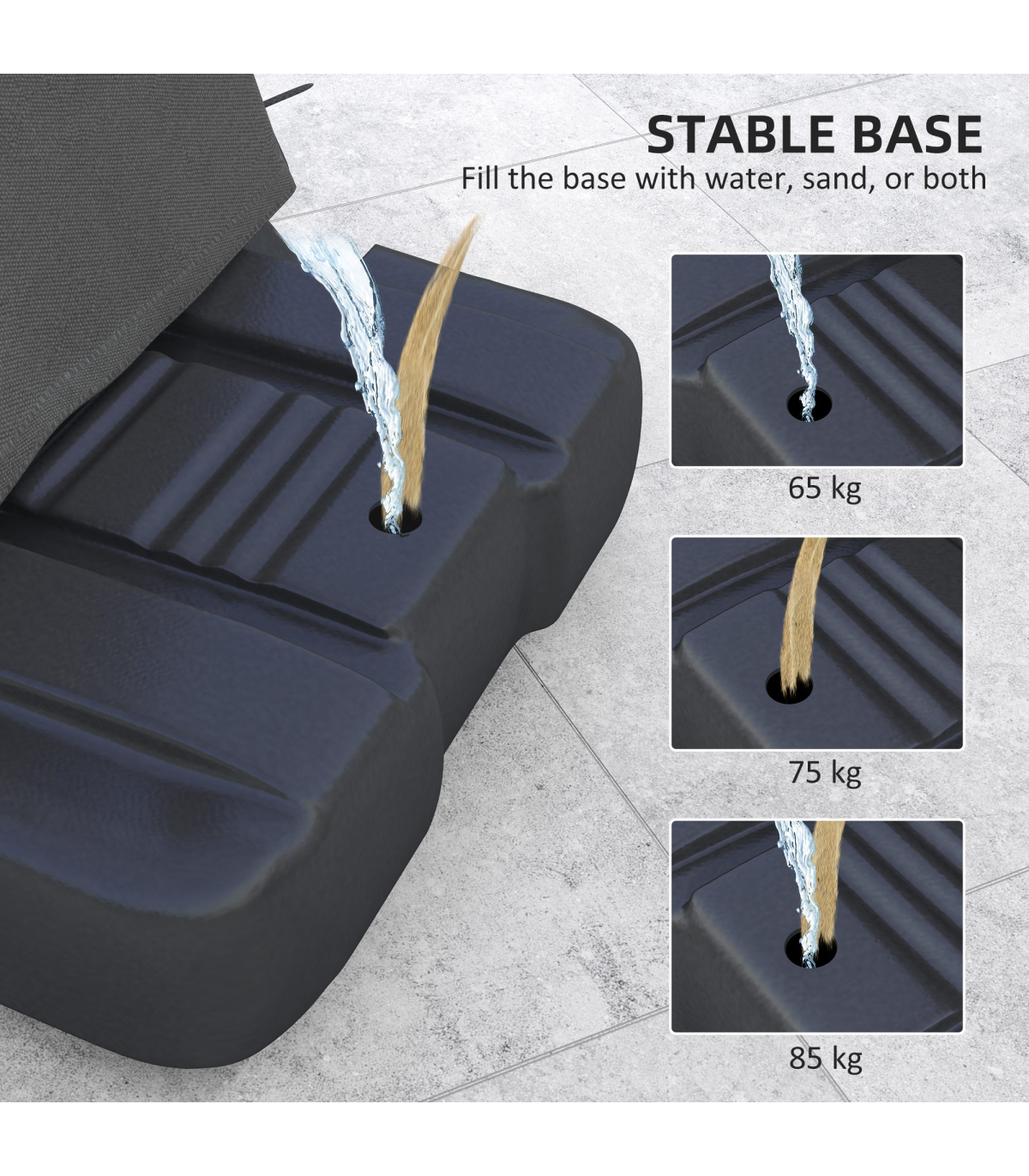 ● Base supports 65kg water, 75kg sand, or 85kg sand + water