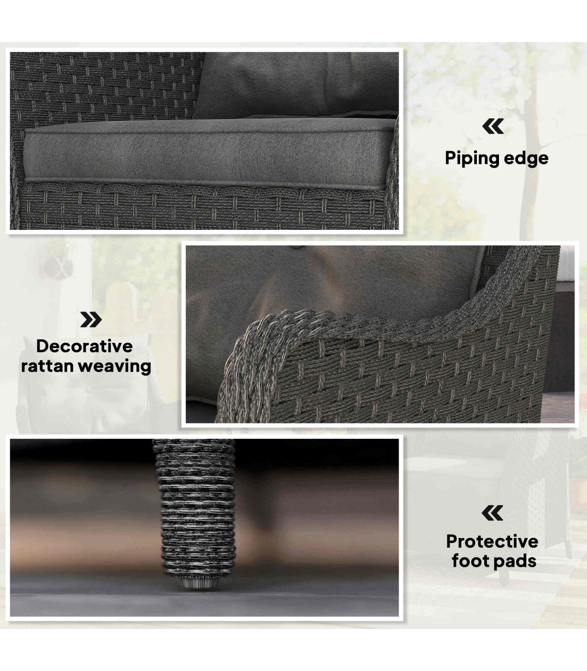 - Material: Steel, PE Rattan, Fibre Cloth (100 % Polyester), Sponge, Tiled Cotton, PP Cotton