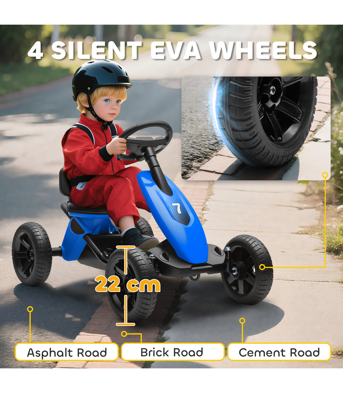 - Four 22cm EVA wheels offer quiet, non-slip rides on any surface
