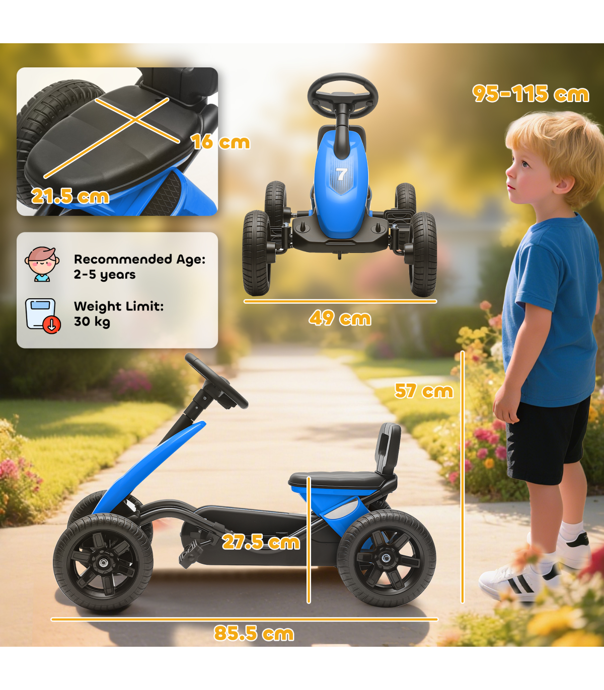 - Comfortable seat fits children 95-115cm tall