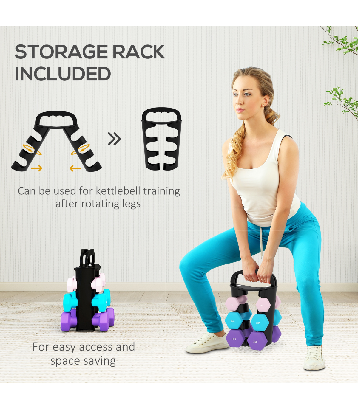 - Rotate the dumbbell stand to transform it into a kettlebell