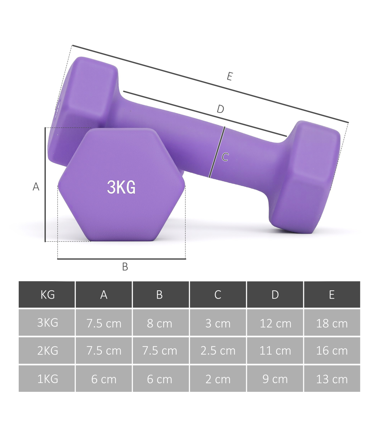 - Dumbbell dimensions: 1kg: 6H x 13L x 6Wcm. 2kg: 7.5H x 16L x 7.5Wcm. 3kg: 8H x 18L x 8Wcm