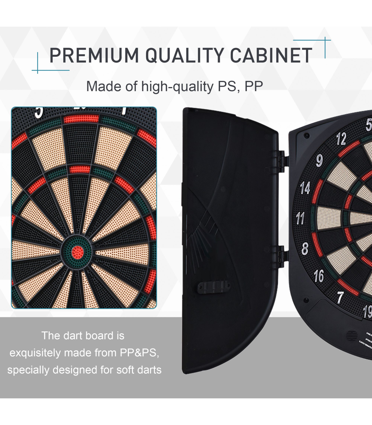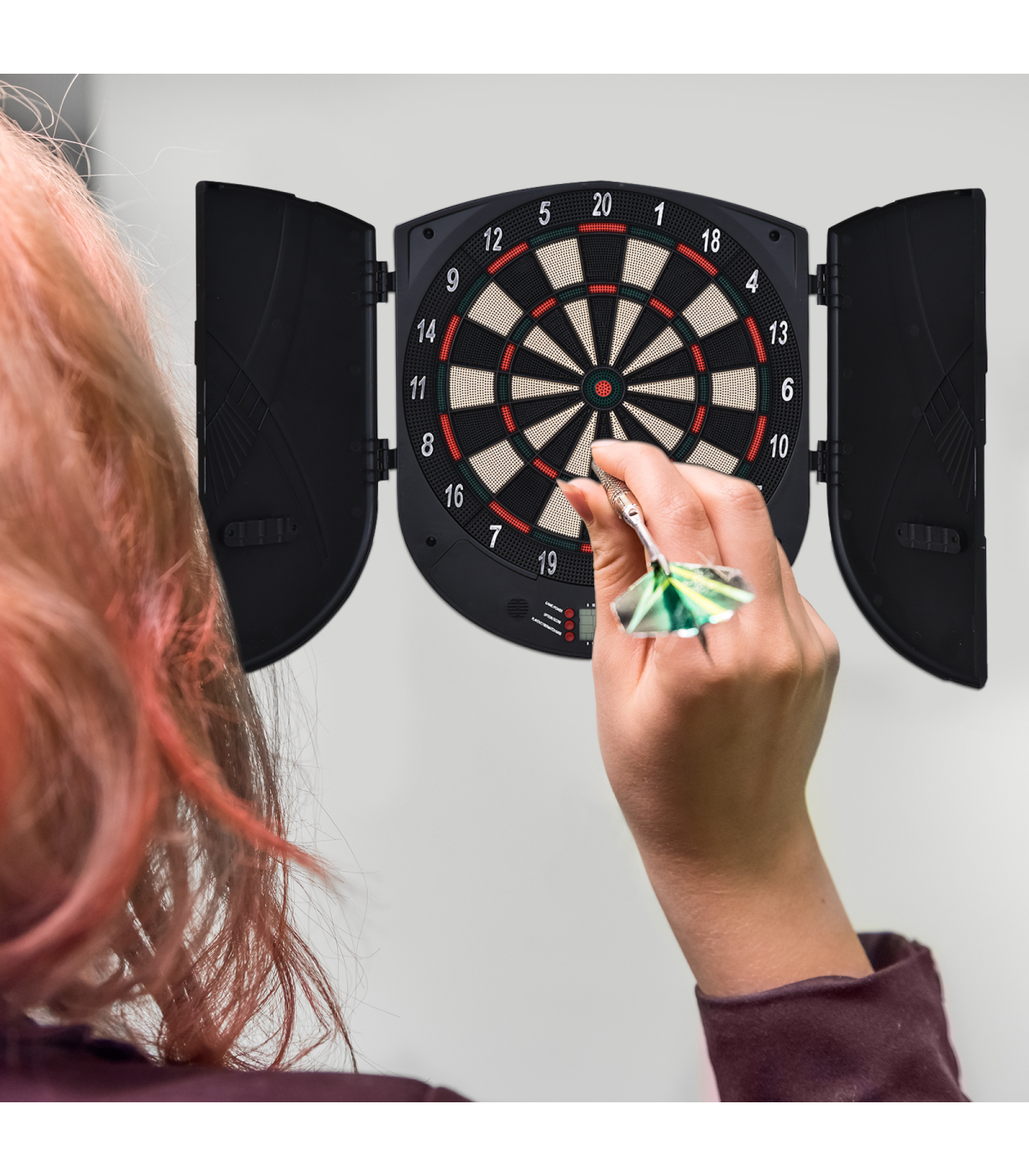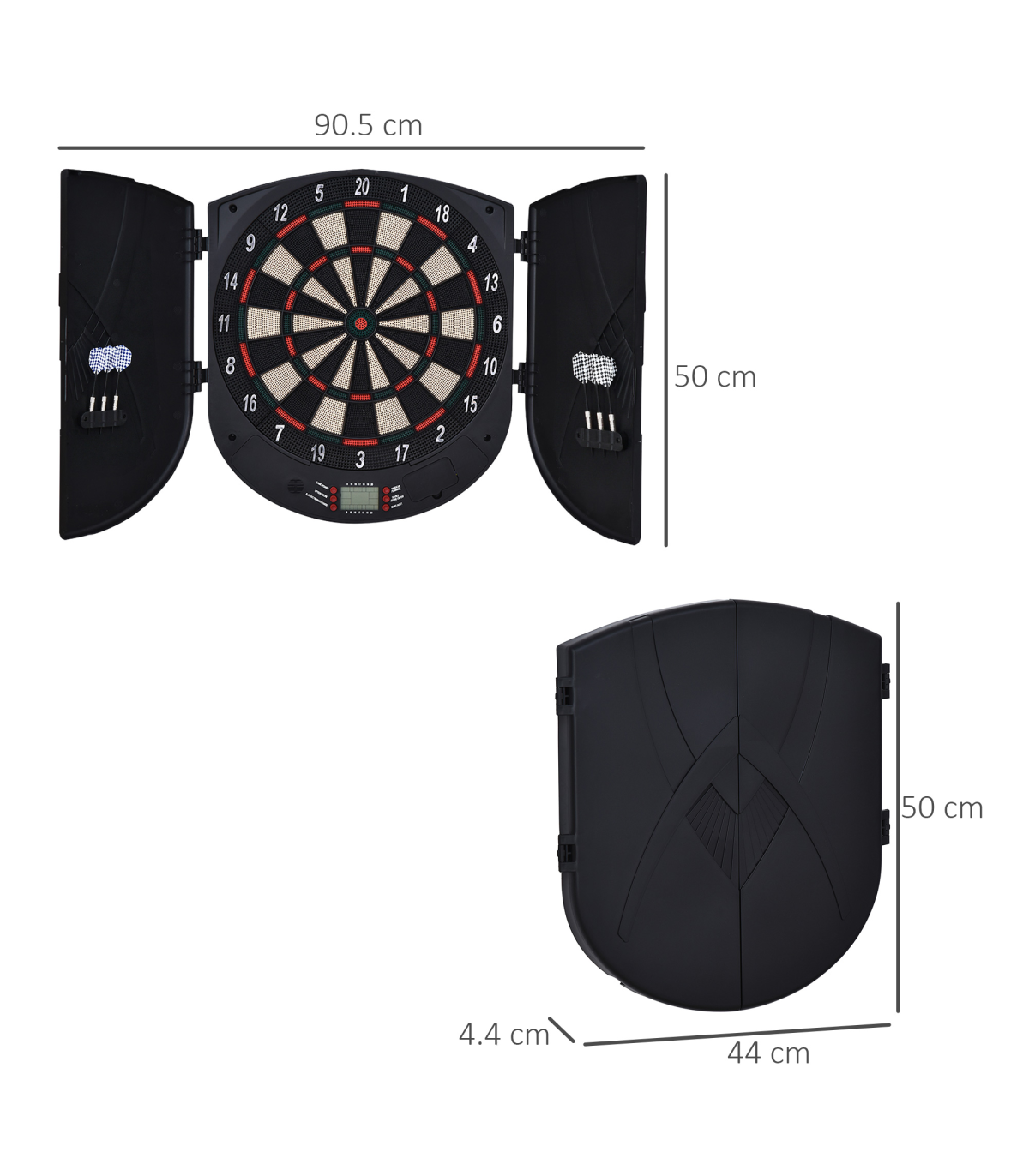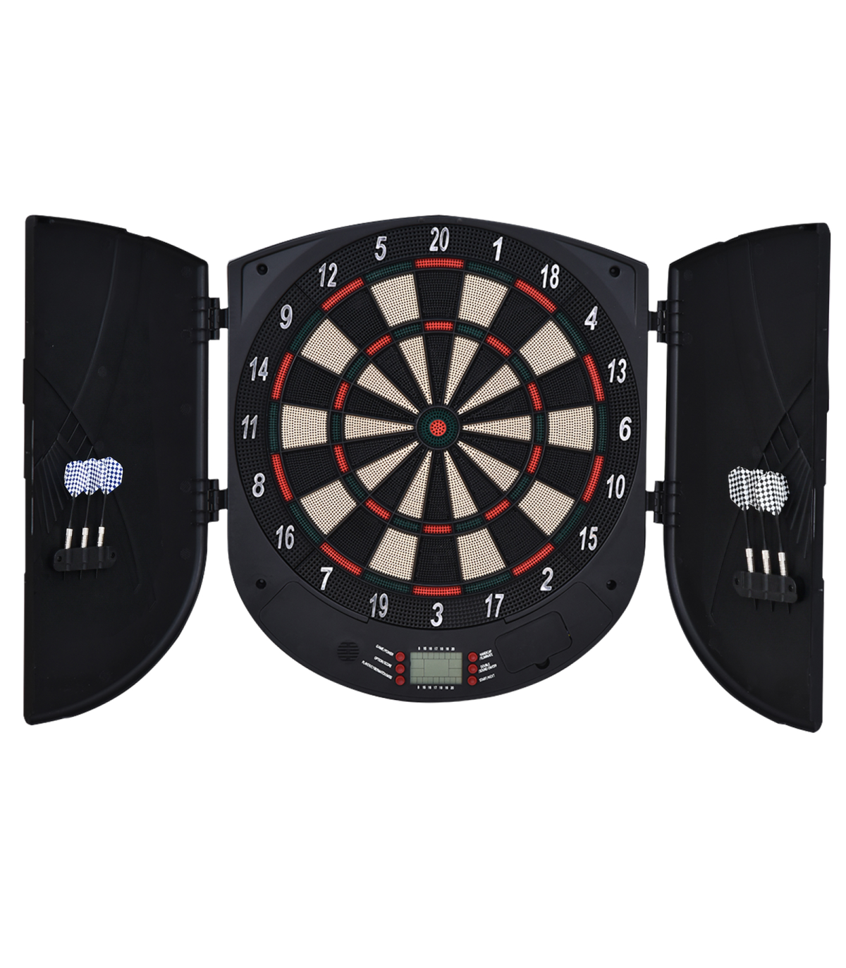 MULTI-GAME MODES: 26 games and 185 scoring options allow maximum 8 players to play at the same time, 6 darts include perfect play at home, office, and bar, and moreSCORING BOARD: Easy to read control panel with LCD display scoring and statistics. Language tips with volume control with returning darts and eliminating points, automatic scoring (it can play against computer players)HIGH-QUALITY MATERIALS: The Electronic dartboard is made from durable PS&PP boards allow you to enjoy the gameEXTRA PROTECTION: The two side doors can be open during play the game increases the surround area to protecting your walls from any missed shots and also can storage the dartsDIMENSIONS: 44 cm x 4.4 cm x 50 cm, 6 piece darts include