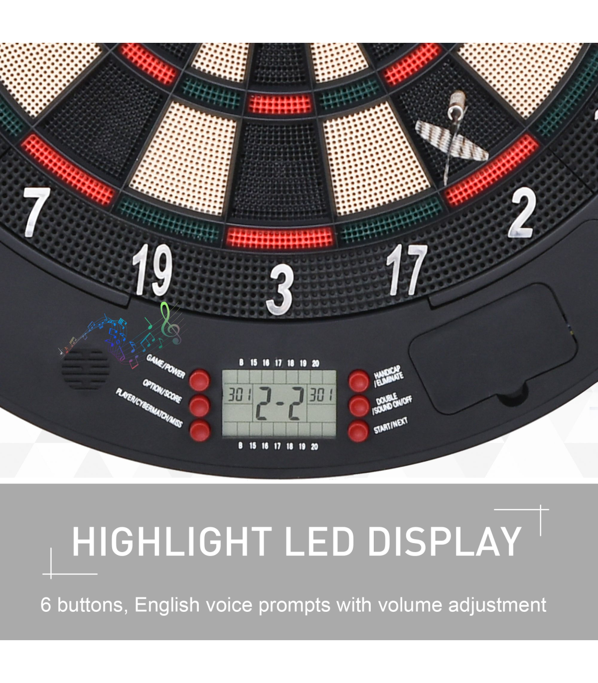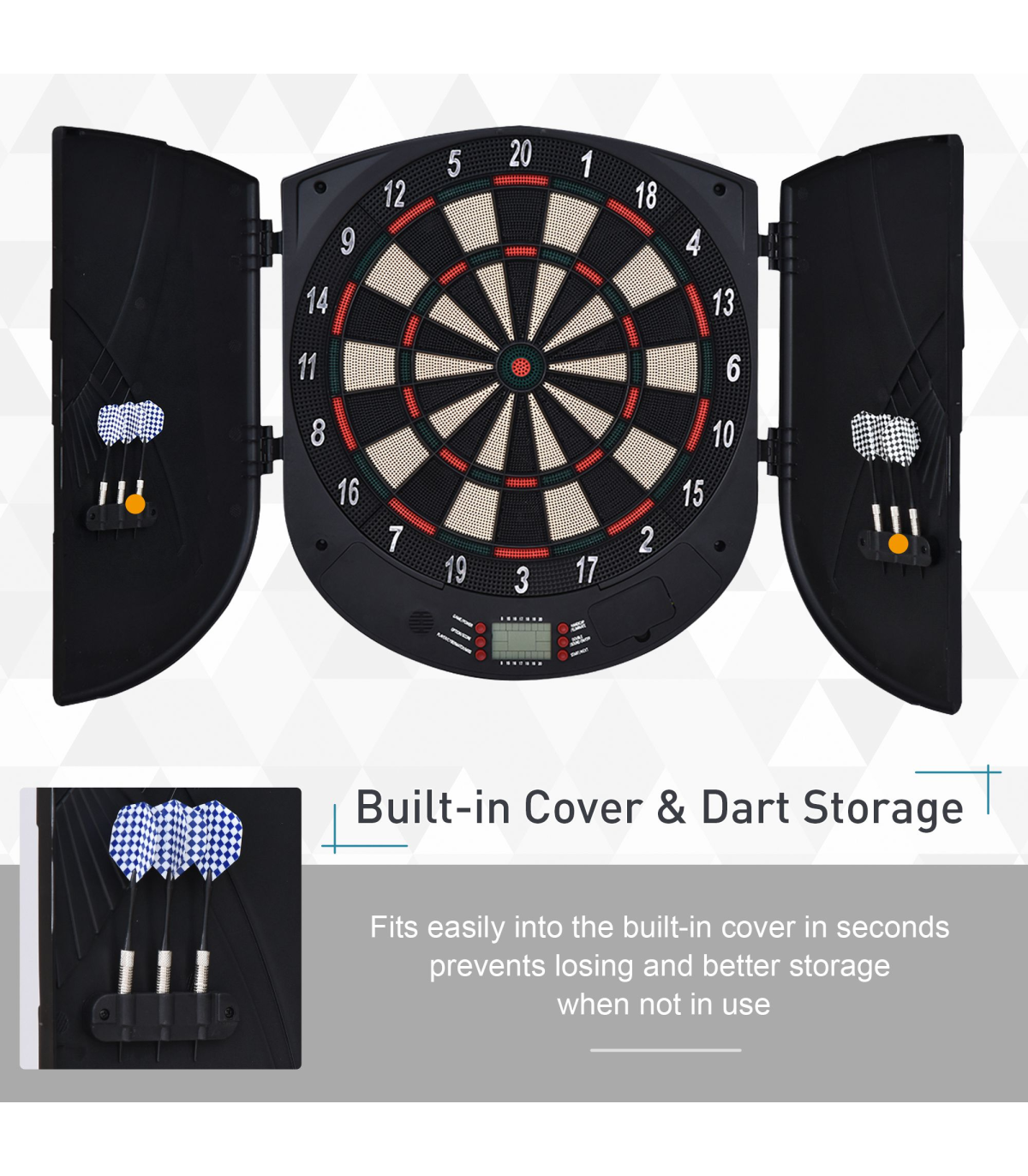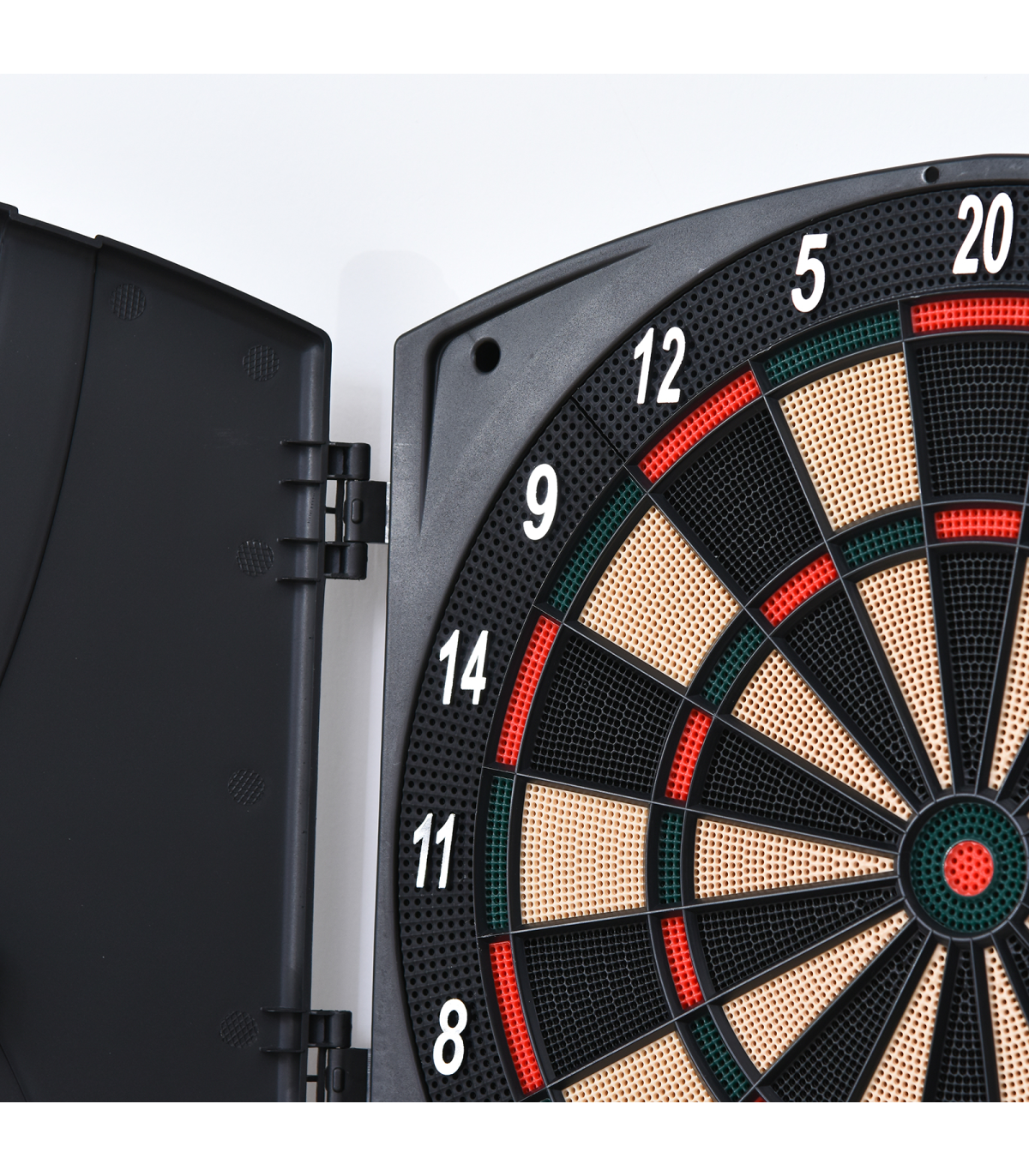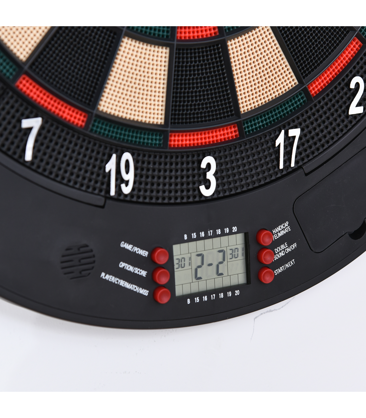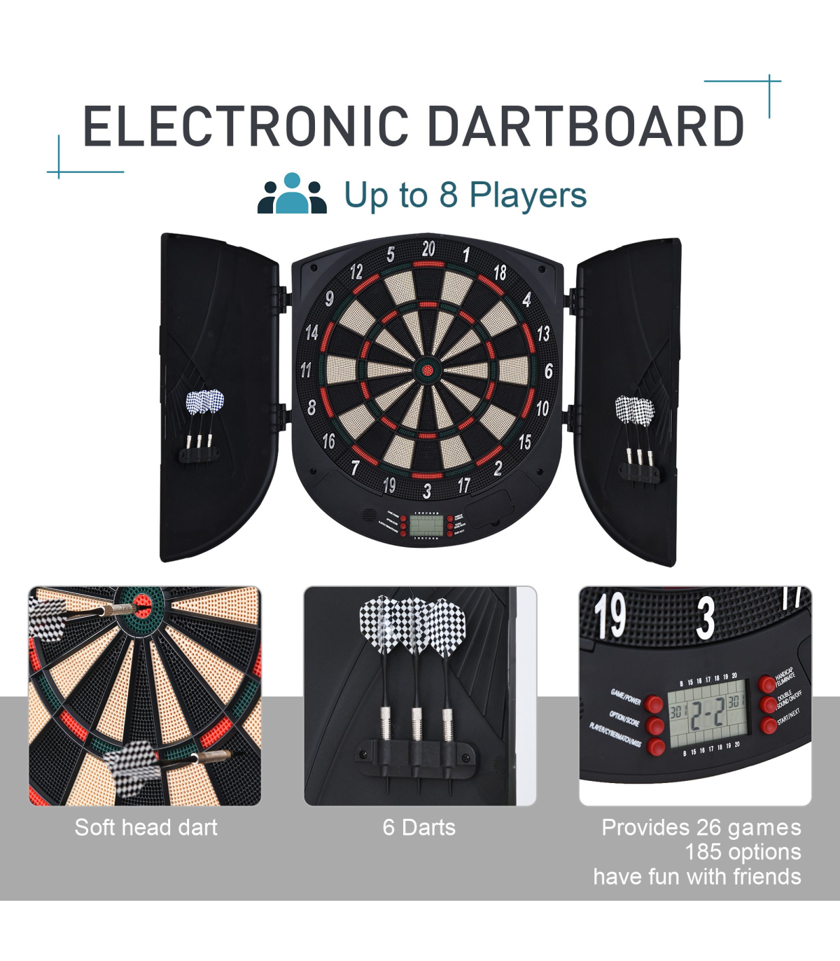 MULTI-GAME MODES: 26 games and 185 scoring options allow maximum 8 players to play at the same time, 6 darts include perfect play at home, office, and bar, and moreSCORING BOARD: Easy to read control panel with LCD display scoring and statistics. Language tips with volume control with returning darts and eliminating points, automatic scoring (it can play against computer players)HIGH-QUALITY MATERIALS: The Electronic dartboard is made from durable PS&PP boards allow you to enjoy the gameEXTRA PROTECTION: The two side doors can be open during play the game increases the surround area to protecting your walls from any missed shots and also can storage the dartsDIMENSIONS: 44 cm x 4.4 cm x 50 cm, 6 piece darts include