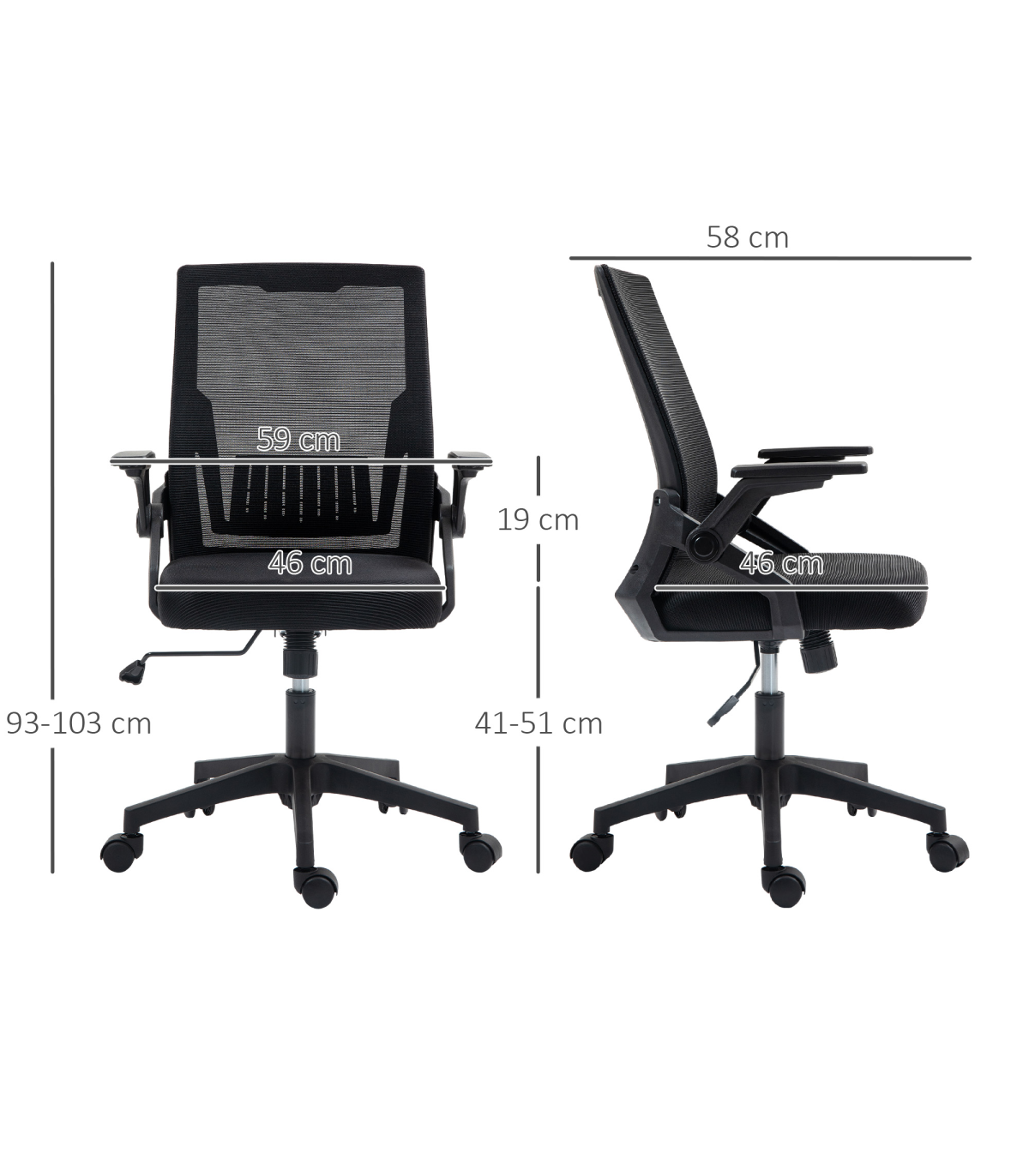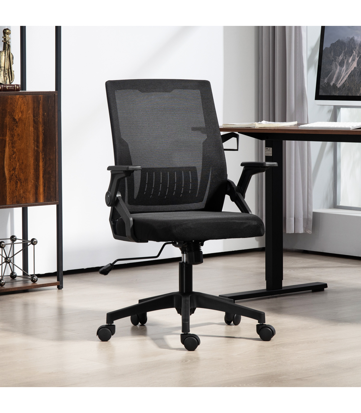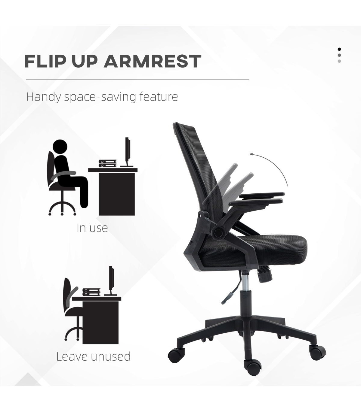 - Flip-up armrests to tuck underneath desk easily