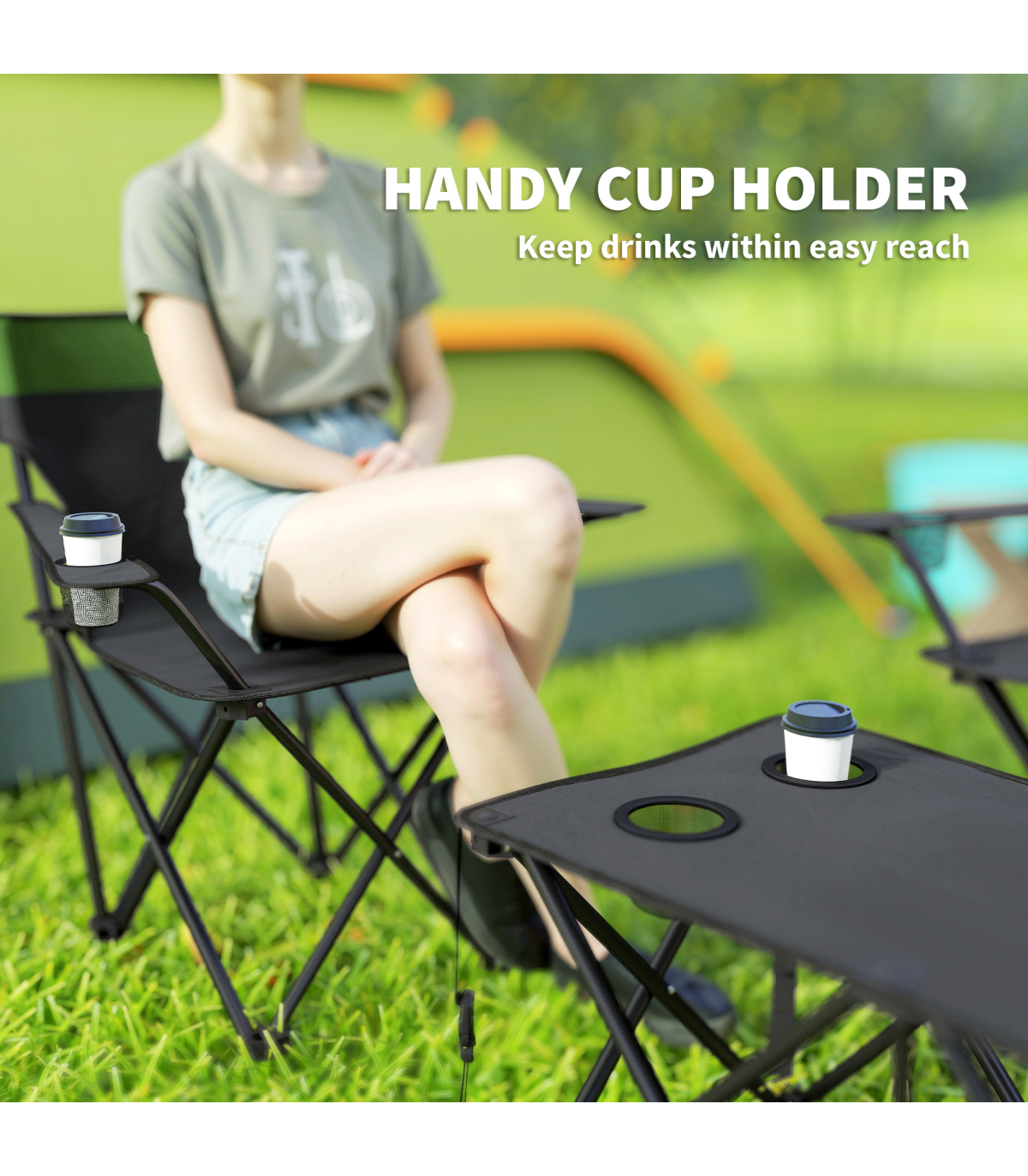 - 600D polyester fabric seat and table panels are resistant to tears and splashes