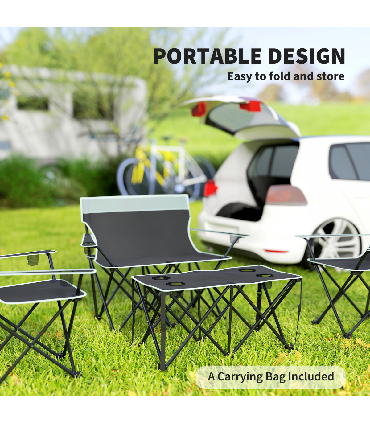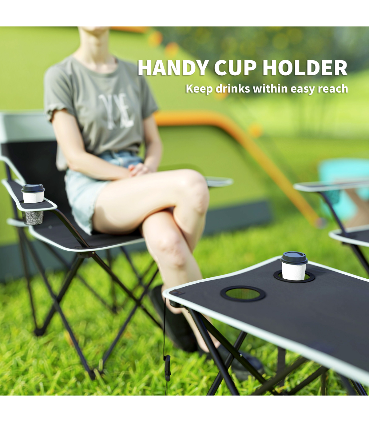 - 600D polyester fabric seat and table panels are resistant to tears and splashes