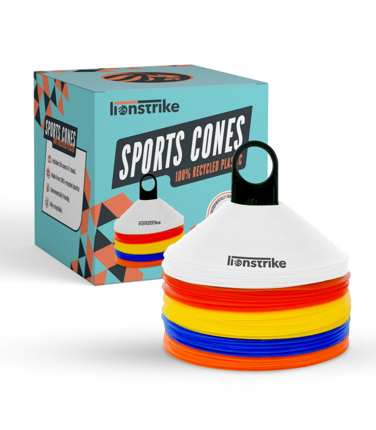 Lionstrike Football / Sports Cones Set - 50 Training Cones plus Carry Stand – Environmentally-friendly training equipment, made from 100% recycled plastic