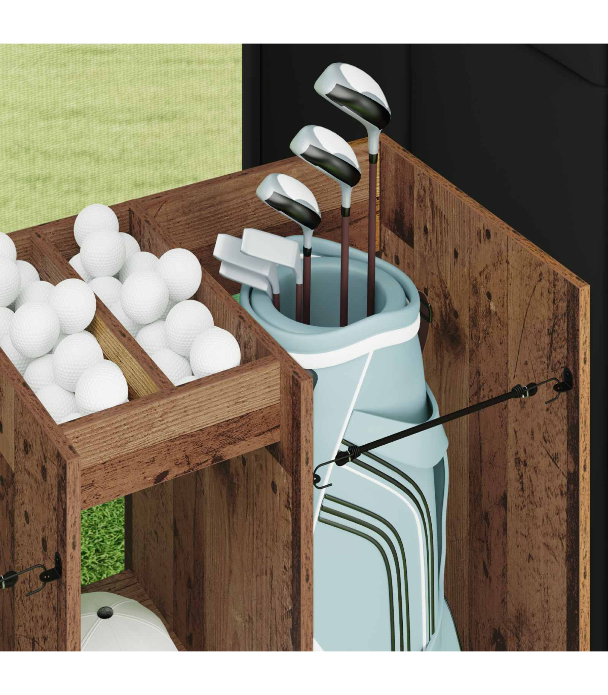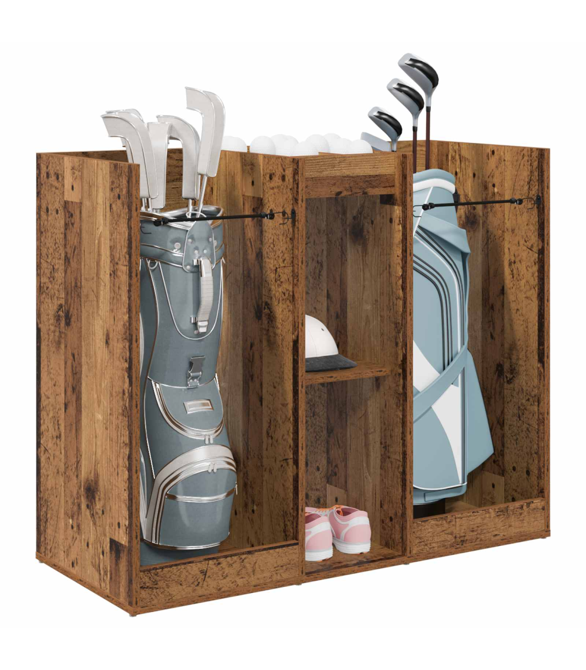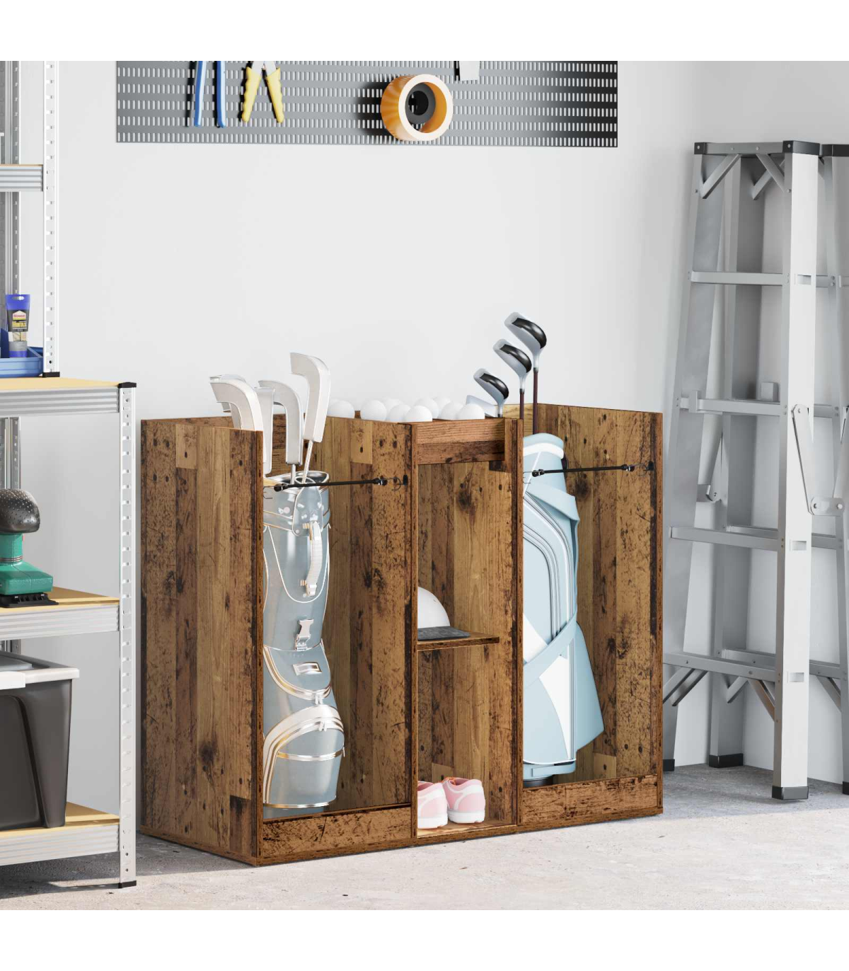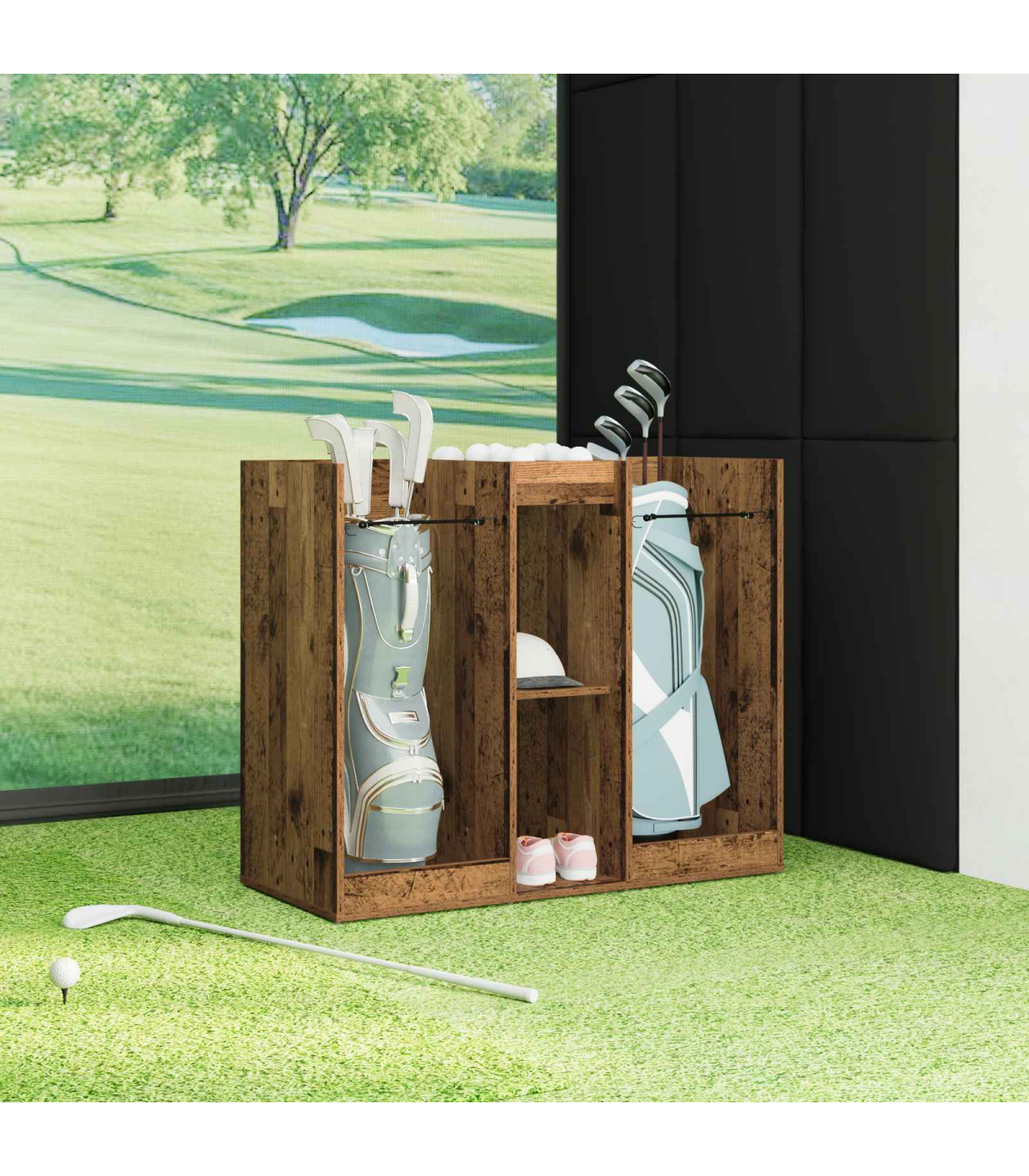 This Wooden Golf Cabinet is a refined choice for those seeking ample storage within a modern aesthetic. Expertly designed for indoor use, it brings a sophisticated touch to any garage or room setting. Sculpted to a simple rectangular shape, this piece boasts a smooth, opaque finish that complements its streamlined silhouette. With its substantial presence, it efficiently stores all your golfing essentials while maintaining a neat exterior, effortlessly blending style and functionality into one cohesive design. Materials: Crafted meticulously from wood, this golf cabinet serves as a robust and elegant storage solution. The natural wood material ensures a lasting presence while adding warmth and character to your interior space. This choice of material is lauded for its durability and sustainability, enhancing both the physical appearance and longevity of the unit. Included Components: Features free-standing shelves crafted from wood, providing reliable support for your belongings. The metal back offers a finished, presentable appearance, allowing for placement in any part of your interior where aesthetics matter. Powder-coated metal frame finishes enrich the cabinet's resilience, promising sturdiness while preventing common issues like . Features /Function /Design: Designed with ample storage capabilities, it encompasses numerous shelving options, perfect for organizing golf accessories and more. The opaque design ensures contents remain discreetly hidden, while its modern style aligns with varied home decors. It's a functional asset for maintaining order and highlighting sophisticated taste. Recommended Uses: Ideal for garages or any indoor space where versatile storage is needed. Whether used for organizing golfing gear or other equipment, it seamlessly integrates into rooms requiring modernist touches. Its utility extends beyond sports, accommodating various household storage needs. Care &Maintenance: To maintain its refined look, use a soft, dry cloth to clean the surface regularly. Avoid exposure to harsh chemicals, ensuring the wood retains its natural luster. Minimal maintenance preserves the cabinet's stylish appearance and structural integrity over time.