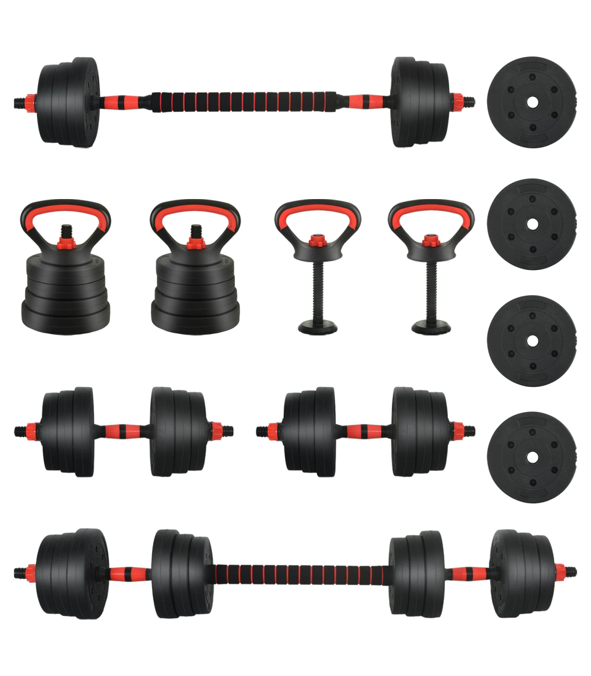 • 4 x Dumbbell plate (1.25 kg): Ø17 x 3 cm (Diameter x T); 4 x Dumbbell plate (1.5 kg): Ø18 x 3.3 cm (Diameter x T); 4 x Dumbbell plate (2 kg): Ø19 x 3.8 cm (Diameter x T); 4 x Dumbbell plate (2.5 kg): Ø21 x 3.8 cm (Diameter x T); 1 x Dumbbell bars (0.27 kg): Ø2.5 x 51 cm (Diameter x L); 1 x Barbell connection pipe: Ø4.15 x 39.5 cm (Diameter x L);