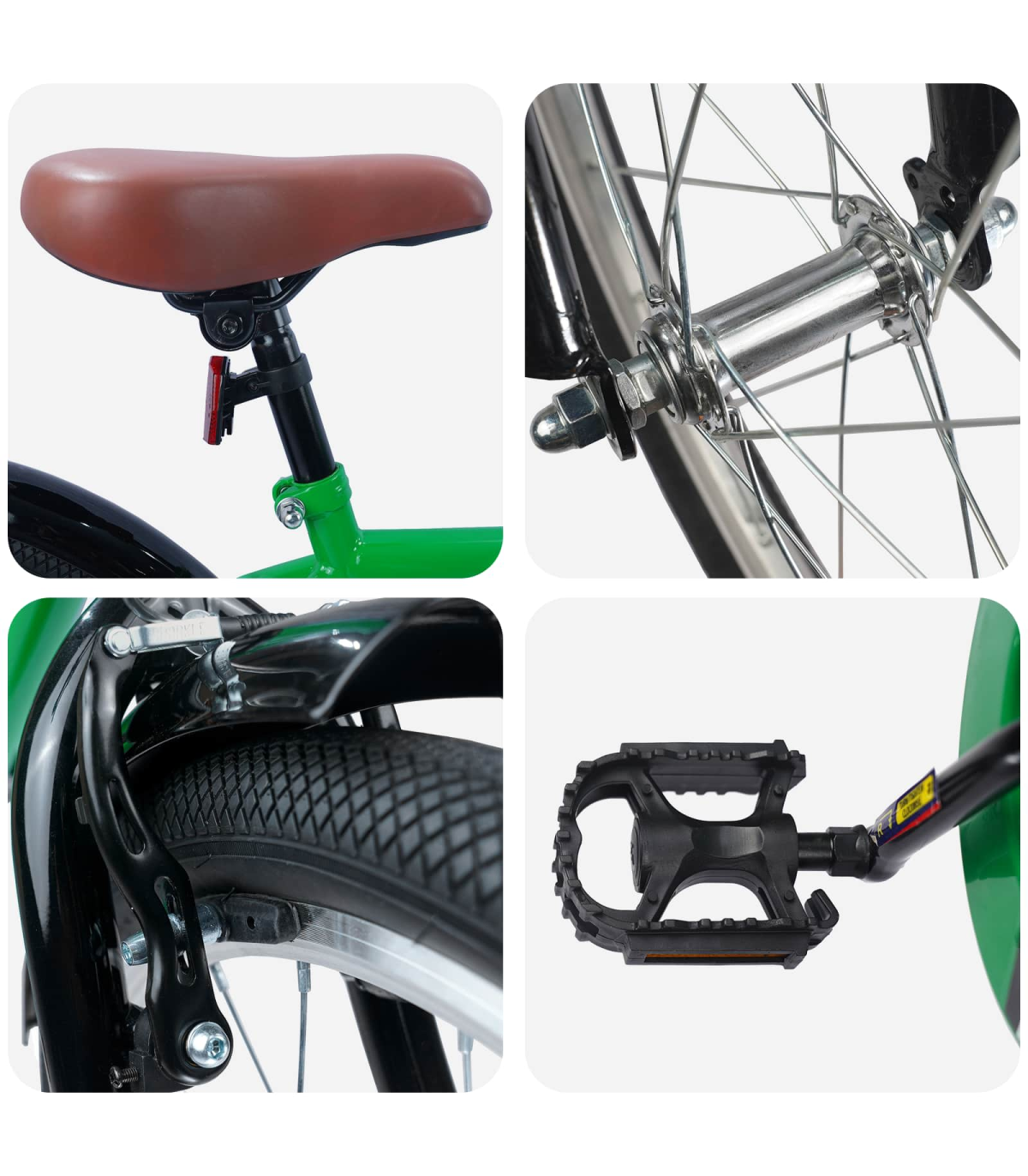 The Modern Kids Bike combines durability and style, making it an ideal choice for young riders exploring the outdoors. Its classic design blends traditional elegance with functional elements, ensuring a reliable and visually appealing ride for kids. Whether zooming through playground paths or cruising the neighborhood, this bike serves up a delightful experience with its sleek looks and robust build that's suited for children eager to ride. Durable Steel Frame: Built with a robust steel frame, this bike provides the foundational strength needed for reliable cycling. The steel material offers outstanding resilience against wear, making it perfect for youthful adventures and outdoor play. Its sturdy build ensures it withstands the demands of active use, promising longevity and consistent performance, so kids stay safe and secure. Adjustable Components: Featuring adjustable handlebars and seat, this bike grows with your child, accommodating different heights with ease. Customization helps secure a comfortable and ergonomic ride, reducing strain and maximizing riding enjoyment. From learning to ride to racing friends, adjustability ensures the bike remains a dependable companion. Single Speed Simplicity: The bike is designed with a single chainring, creating a straightforward riding experience for children. This feature minimizes the complexity of gear use, encouraging confidence in younger riders and simplifying maintenance. It's perfect for leisurely rides around the yard or park without gear distractions. Safety First Design: Equipped with a classic brake lever system, this bike offers effective stopping power crucial for safety. The intuitive design ensures kids can brake confidently, empowering them with control during their rides. Coupled with steel rims, it maintains reliable traction during sudden stops or wet conditions. Easy Maintenance and Care: Caring for this bike is simplified by its thoughtful design and resilient components. Store in a cool, dry location for optimal longevity, and occasionally check key screws and joints to keep it running smoothly. This ensures the bike remains in excellent condition, ready for its next adventure.