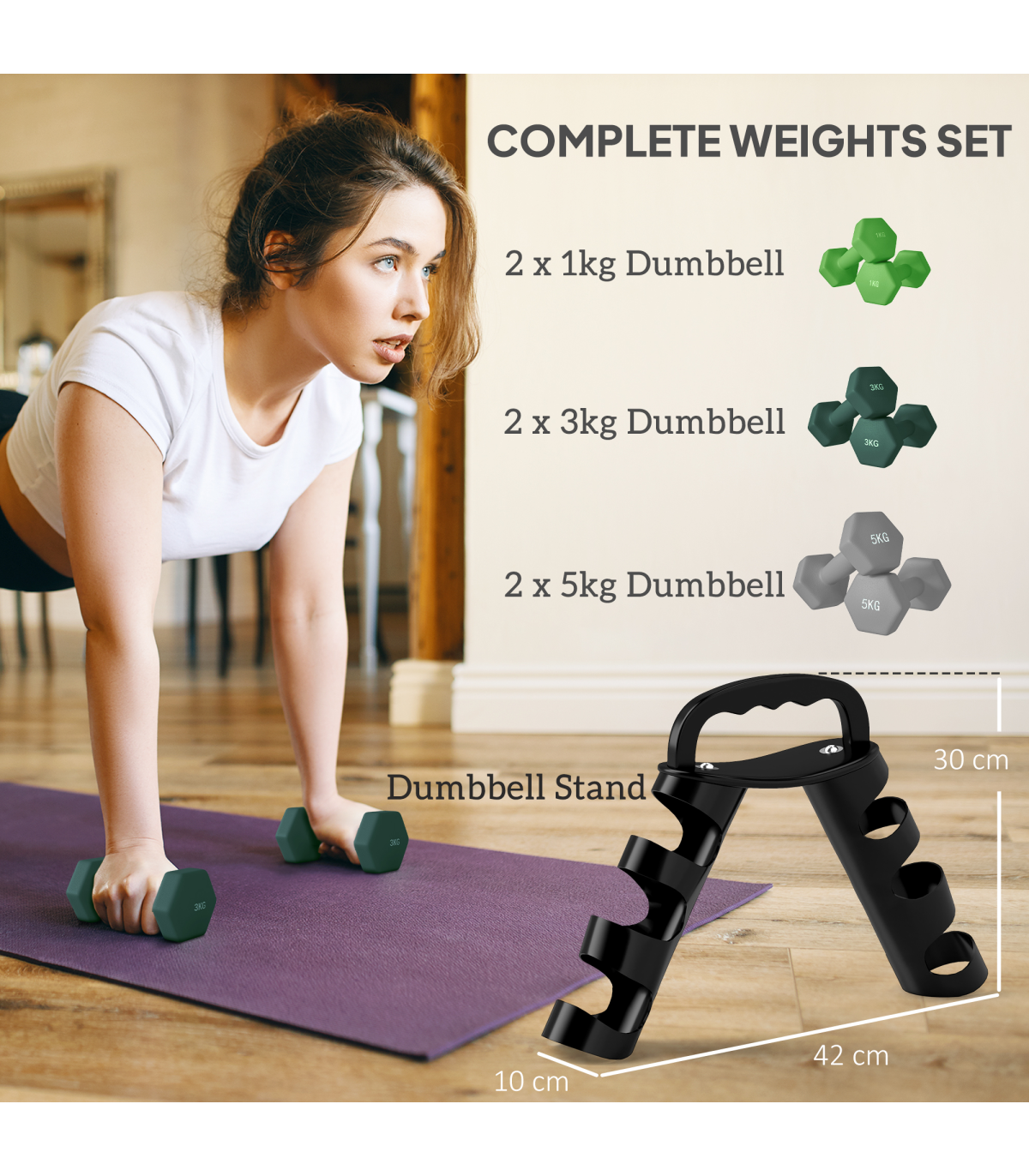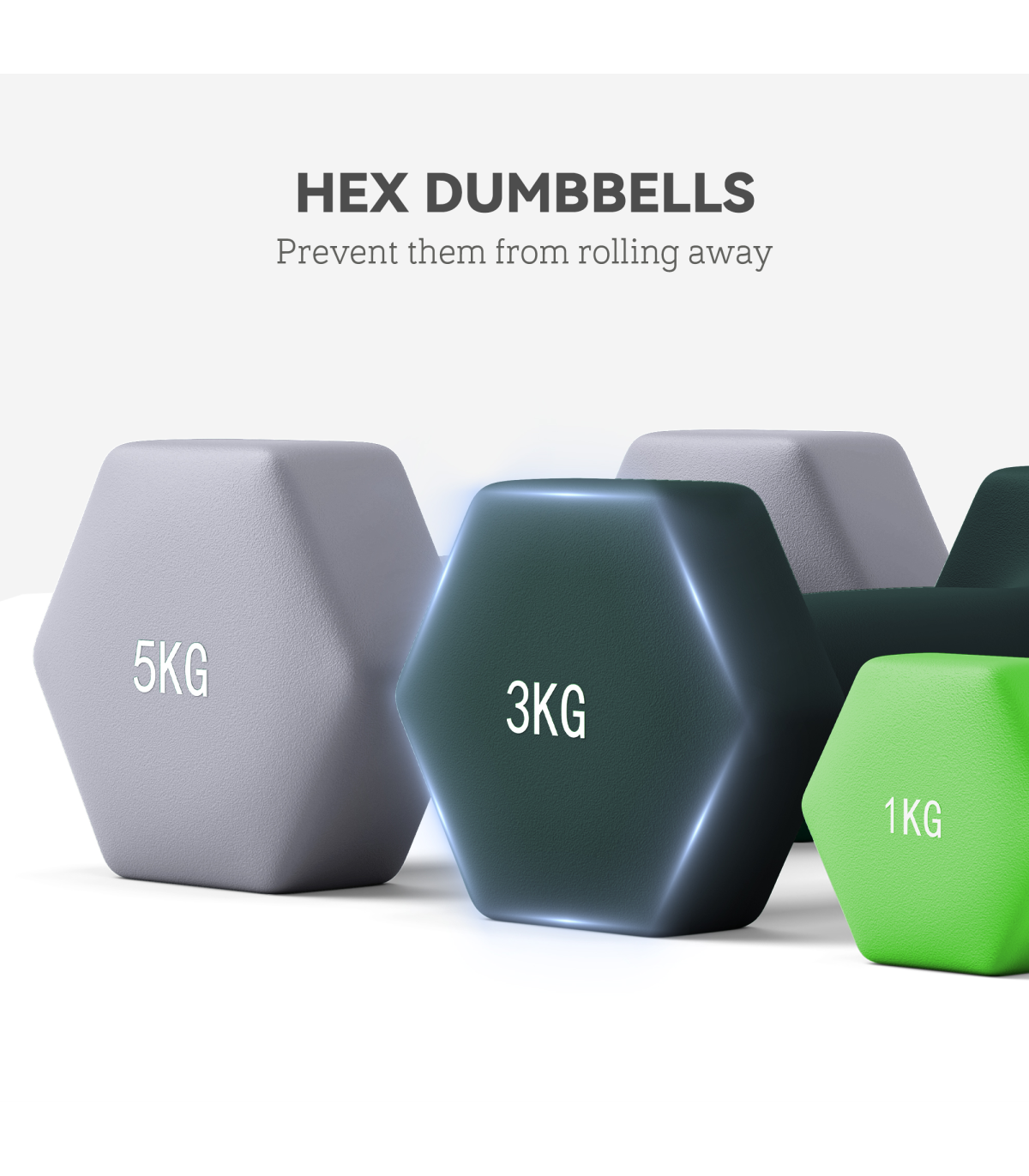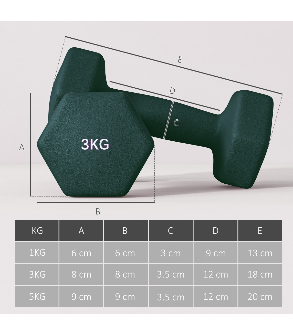 ? Dumbbell dimensions: 1kg: 6H x 13L x 6Wcm. 3kg: 8H x 18L x 8Wcm. 5kg: 9H x 20L x 9Wcm