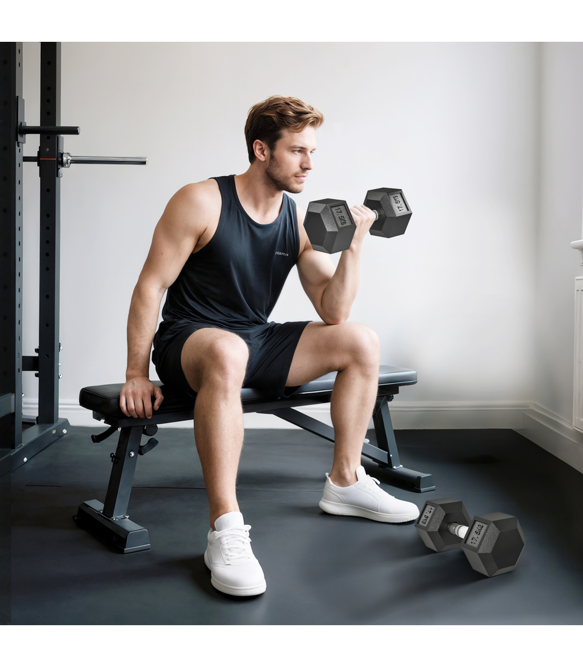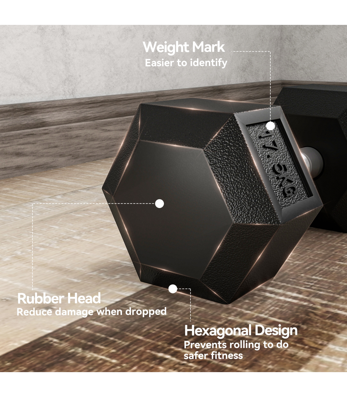 ● Rubber covered ends for safety when dropped, hexagon shape stops weight rolling