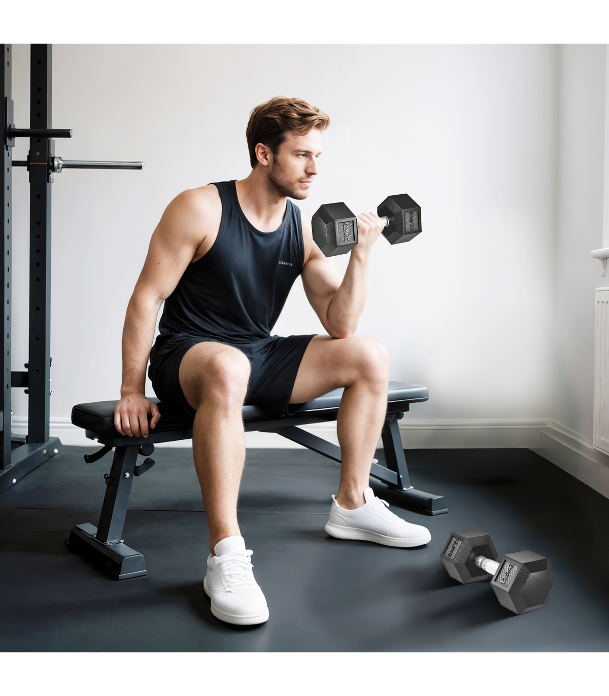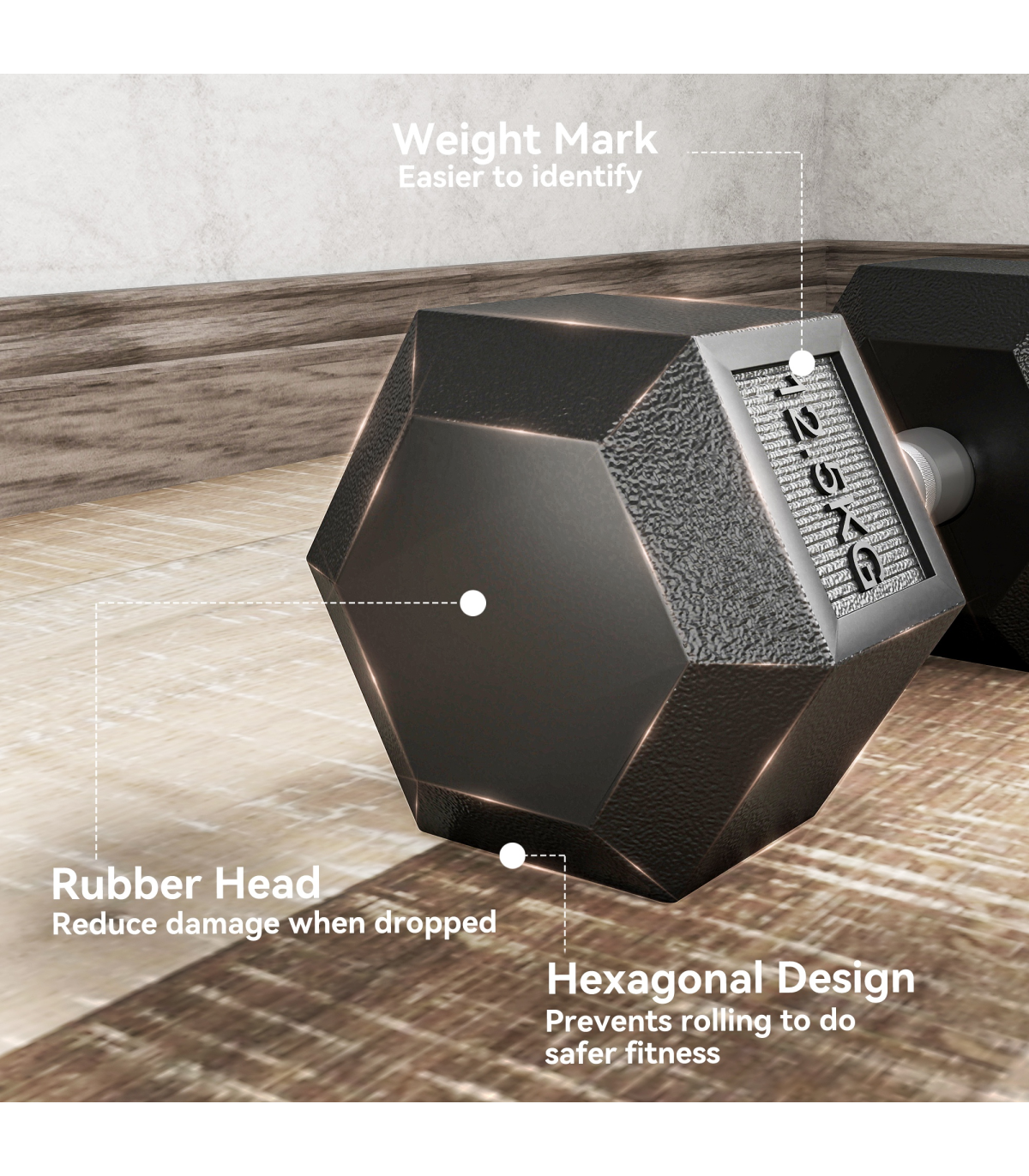 ● Rubber covered ends for safety when dropped, hexagon shape stops weight rolling