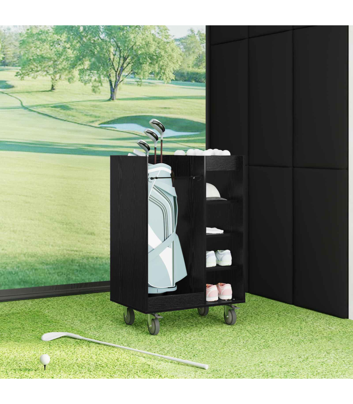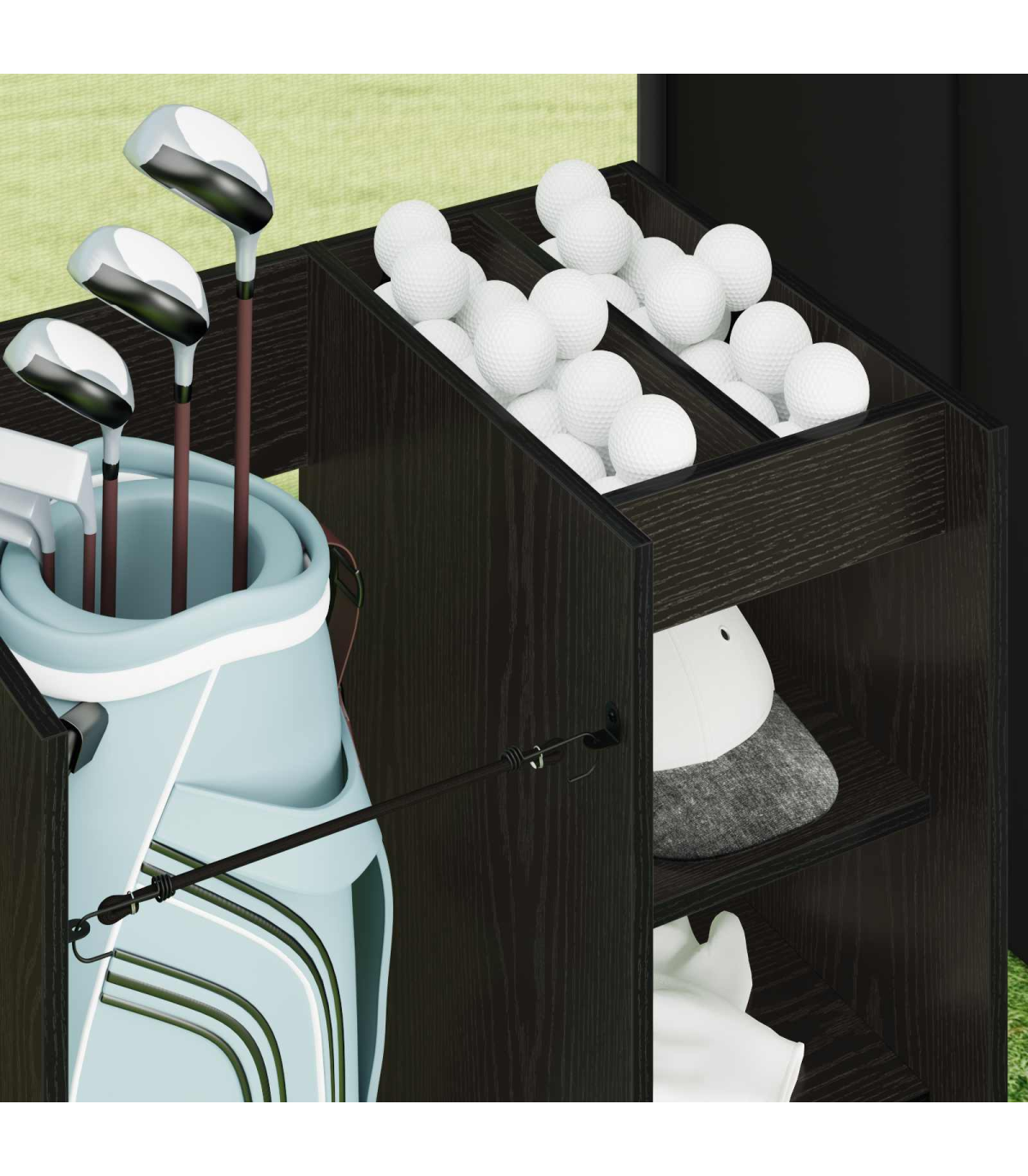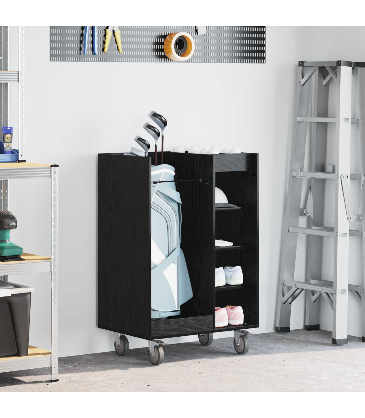 This Wooden Golf Cabinet is a refined choice for those seeking ample storage within a modern aesthetic. Expertly designed for indoor use, it brings a sophisticated touch to any garage or room setting. Sculpted to a simple rectangular shape, this piece boasts a smooth, opaque finish that complements its streamlined silhouette. With its substantial presence, it efficiently stores all your golfing essentials while maintaining a neat exterior, effortlessly blending style and functionality into one cohesive design. Materials: Crafted meticulously from wood, this golf cabinet serves as a robust and elegant storage solution. The natural wood material ensures a lasting presence while adding warmth and character to your interior space. This choice of material is lauded for its durability and sustainability, enhancing both the physical appearance and longevity of the unit. Included Components: Features free-standing shelves crafted from wood, providing reliable support for your belongings. The metal back offers a finished, presentable appearance, allowing for placement in any part of your interior where aesthetics matter. Powder-coated metal frame finishes enrich the cabinet's resilience, promising sturdiness while preventing common issues like . Features /Function /Design: Designed with ample storage capabilities, it encompasses numerous shelving options, perfect for organizing golf accessories and more. The opaque design ensures contents remain discreetly hidden, while its modern style aligns with varied home decors. It's a functional asset for maintaining order and highlighting sophisticated taste. Recommended Uses: Ideal for garages or any indoor space where versatile storage is needed. Whether used for organizing golfing gear or other equipment, it seamlessly integrates into rooms requiring modernist touches. Its utility extends beyond sports, accommodating various household storage needs. Care &Maintenance: To maintain its refined look, use a soft, dry cloth to clean the surface regularly. Avoid exposure to harsh chemicals, ensuring the wood retains its natural luster. Minimal maintenance preserves the cabinet's stylish appearance and structural integrity over time.
