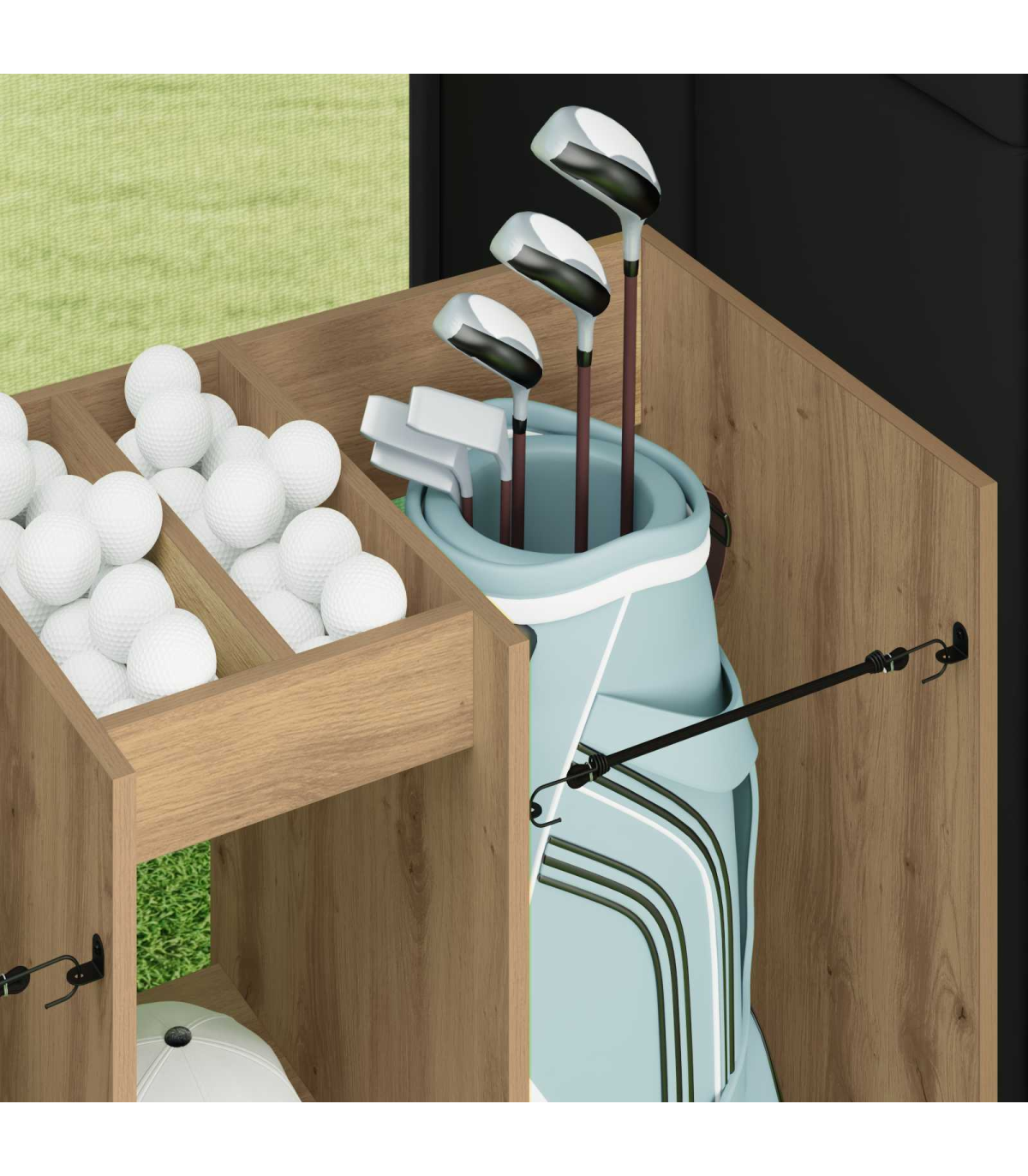 This Wooden Golf Cabinet is a refined choice for those seeking ample storage within a modern aesthetic. Expertly designed for indoor use, it brings a sophisticated touch to any garage or room setting. Sculpted to a simple rectangular shape, this piece boasts a smooth, opaque finish that complements its streamlined silhouette. With its substantial presence, it efficiently stores all your golfing essentials while maintaining a neat exterior, effortlessly blending style and functionality into one cohesive design. Materials: Crafted meticulously from wood, this golf cabinet serves as a robust and elegant storage solution. The natural wood material ensures a lasting presence while adding warmth and character to your interior space. This choice of material is lauded for its durability and sustainability, enhancing both the physical appearance and longevity of the unit. Included Components: Features free-standing shelves crafted from wood, providing reliable support for your belongings. The metal back offers a finished, presentable appearance, allowing for placement in any part of your interior where aesthetics matter. Powder-coated metal frame finishes enrich the cabinet's resilience, promising sturdiness while preventing common issues like . Features /Function /Design: Designed with ample storage capabilities, it encompasses numerous shelving options, perfect for organizing golf accessories and more. The opaque design ensures contents remain discreetly hidden, while its modern style aligns with varied home decors. It's a functional asset for maintaining order and highlighting sophisticated taste. Recommended Uses: Ideal for garages or any indoor space where versatile storage is needed. Whether used for organizing golfing gear or other equipment, it seamlessly integrates into rooms requiring modernist touches. Its utility extends beyond sports, accommodating various household storage needs. Care &Maintenance: To maintain its refined look, use a soft, dry cloth to clean the surface regularly. Avoid exposure to harsh chemicals, ensuring the wood retains its natural luster. Minimal maintenance preserves the cabinet's stylish appearance and structural integrity over time.