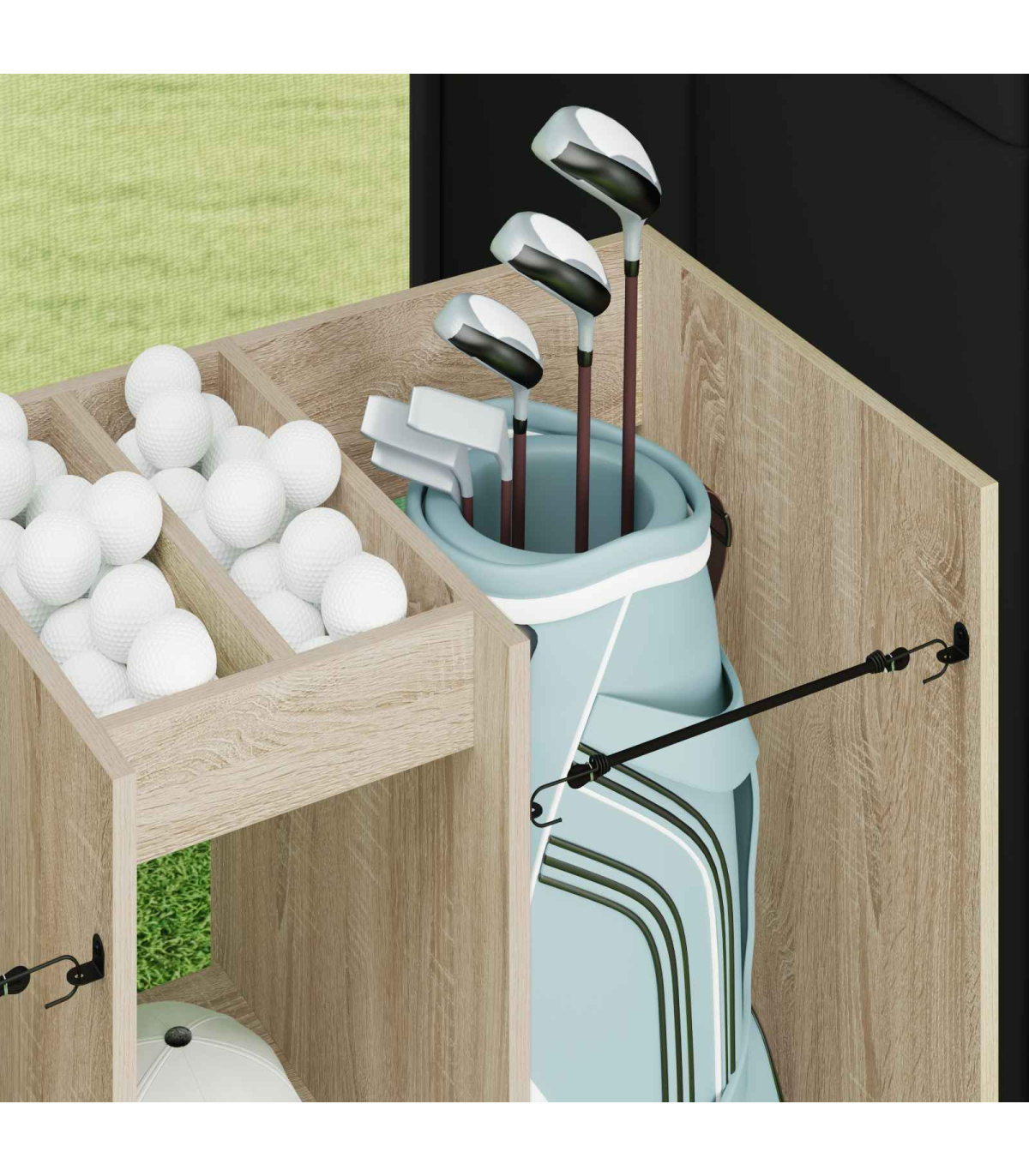 This Wooden Golf Cabinet is a refined choice for those seeking ample storage within a modern aesthetic. Expertly designed for indoor use, it brings a sophisticated touch to any garage or room setting. Sculpted to a simple rectangular shape, this piece boasts a smooth, opaque finish that complements its streamlined silhouette. With its substantial presence, it efficiently stores all your golfing essentials while maintaining a neat exterior, effortlessly blending style and functionality into one cohesive design. Materials: Crafted meticulously from wood, this golf cabinet serves as a robust and elegant storage solution. The natural wood material ensures a lasting presence while adding warmth and character to your interior space. This choice of material is lauded for its durability and sustainability, enhancing both the physical appearance and longevity of the unit. Included Components: Features free-standing shelves crafted from wood, providing reliable support for your belongings. The metal back offers a finished, presentable appearance, allowing for placement in any part of your interior where aesthetics matter. Powder-coated metal frame finishes enrich the cabinet's resilience, promising sturdiness while preventing common issues like . Features /Function /Design: Designed with ample storage capabilities, it encompasses numerous shelving options, perfect for organizing golf accessories and more. The opaque design ensures contents remain discreetly hidden, while its modern style aligns with varied home decors. It's a functional asset for maintaining order and highlighting sophisticated taste. Recommended Uses: Ideal for garages or any indoor space where versatile storage is needed. Whether used for organizing golfing gear or other equipment, it seamlessly integrates into rooms requiring modernist touches. Its utility extends beyond sports, accommodating various household storage needs. Care &Maintenance: To maintain its refined look, use a soft, dry cloth to clean the surface regularly. Avoid exposure to harsh chemicals, ensuring the wood retains its natural luster. Minimal maintenance preserves the cabinet's stylish appearance and structural integrity over time.