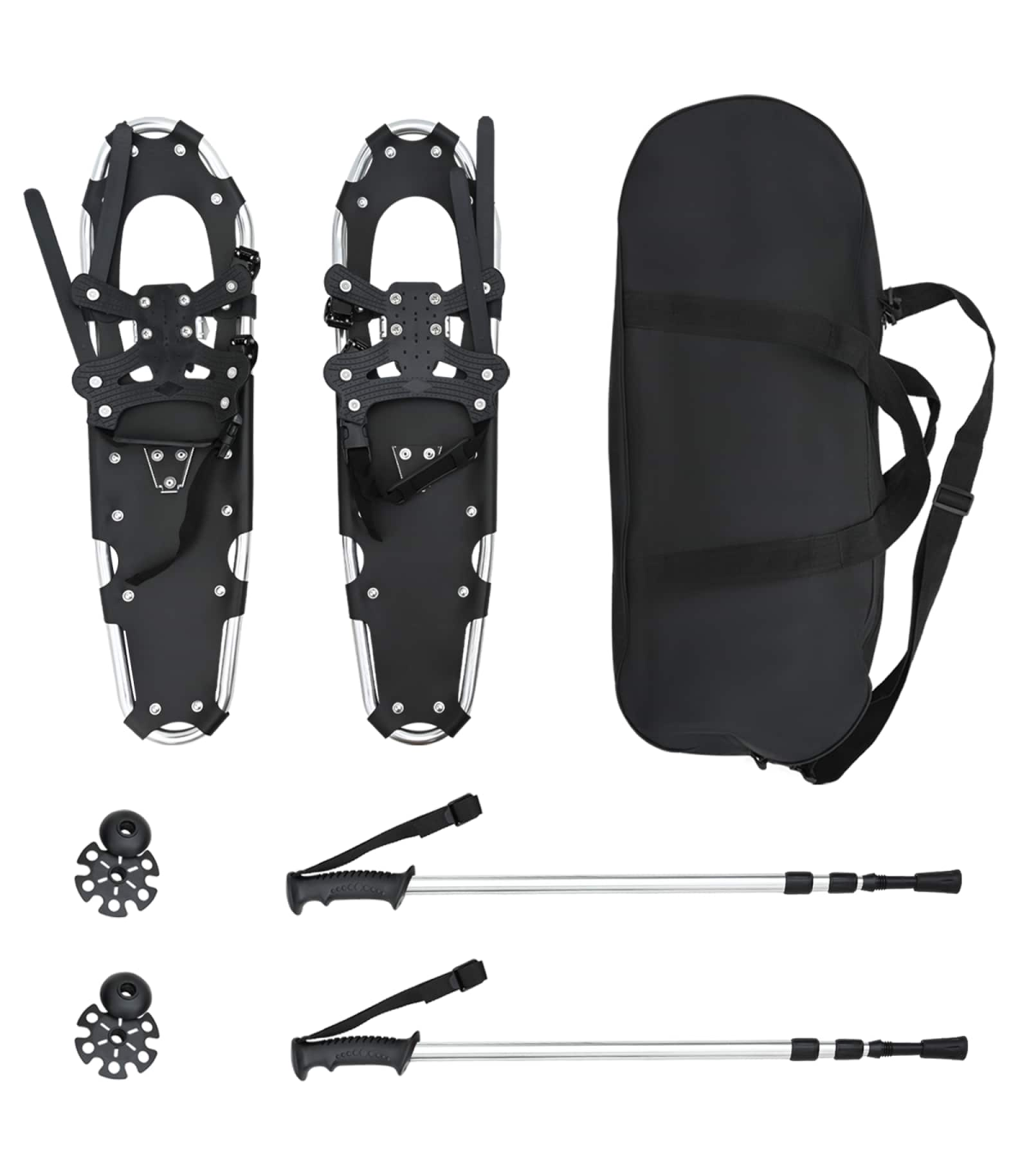 This 3 IN 1 Modern Snowshoe set with Hiking Poles is tailored for winter enthusiasts who crave adventure amidst snow. Emphasizing simplicity and functionality, it promises an effortless glide over snow-blanketed landscapes, making it perfect for outdoor aficionados. With its modern style, it attracts both beginner and expert snowshoe hikers looking for ease, agility, and thrilling winter expeditions. Aluminum Frame &Polyethylene Deck: Engineered for durability, the aluminum frame and polyethylene deck withstand the harsh outdoors, providing steadfast performance during snow hikes. Their resistance to cold ensures stability and strength, allowing enthusiasts to navigate through snow effortlessly. Complete Set: The package comes with a pair of snowshoes, two adjustable hiking poles, and a carrying bag, making it ideal for those seeking a full snow trekking kit in one purchase. Each component is designed for ease of transport and storage, ensuring you are adventure-ready at all times. Cold-resistant Features: The HDPE deck is crafted for cold settings, while the adjustable heel strap offers perfect foot alignment. This ensures your feet remain in place at all times for uninterrupted trekking, thus promoting safety and control on all terrains. Versatile Uses: Whether scaling mountaintops or trailing through secluded woods, it's built to accommodate shoe sizes 38 to 48 with a ratchet system for readjustment, lending flexibility to multiple users. Easy Maintenance: Store the gear in cool, dry places and wipe it with a dry cloth to maintain its pristine condition. Avoid pavement walks to preserve deck integrity and inspect before each seasonal use for sustained functionality.