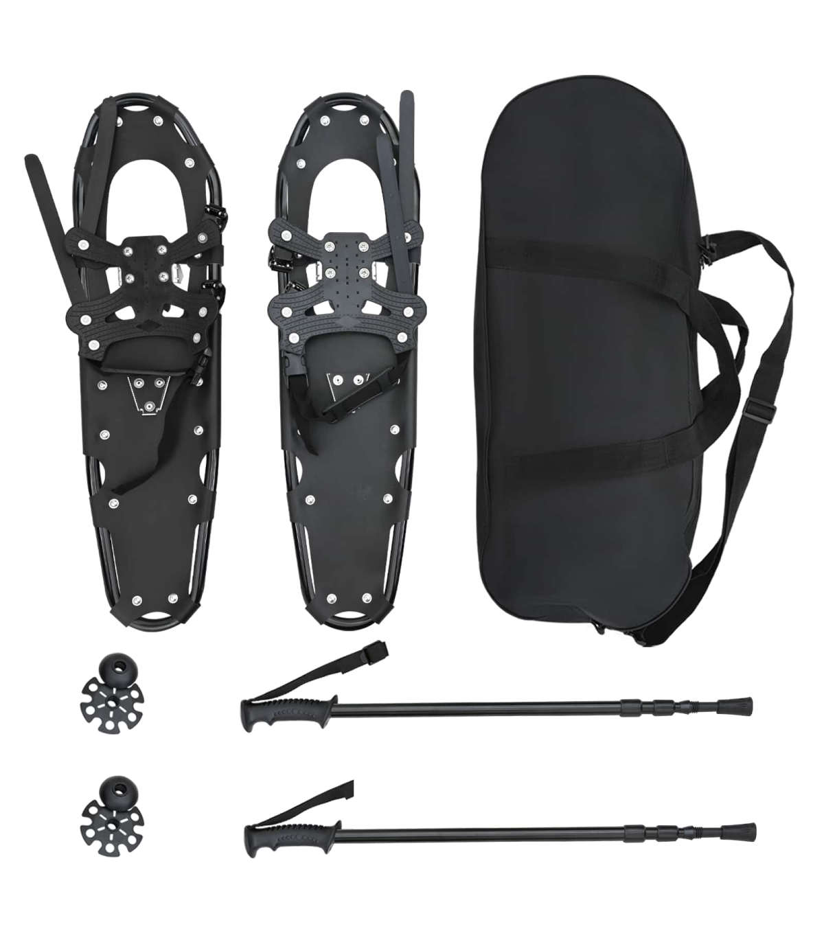 This 3 IN 1 Modern Snowshoe set with Hiking Poles is tailored for winter enthusiasts who crave adventure amidst snow. Emphasizing simplicity and functionality, it promises an effortless glide over snow-blanketed landscapes, making it perfect for outdoor aficionados. With its modern style, it attracts both beginner and expert snowshoe hikers looking for ease, agility, and thrilling winter expeditions. Aluminum Frame &Polyethylene Deck: Engineered for durability, the aluminum frame and polyethylene deck withstand the harsh outdoors, providing steadfast performance during snow hikes. Their resistance to cold ensures stability and strength, allowing enthusiasts to navigate through snow effortlessly. Complete Set: The package comes with a pair of snowshoes, two adjustable hiking poles, and a carrying bag, making it ideal for those seeking a full snow trekking kit in one purchase. Each component is designed for ease of transport and storage, ensuring you are adventure-ready at all times. Cold-resistant Features: The HDPE deck is crafted for cold settings, while the adjustable heel strap offers perfect foot alignment. This ensures your feet remain in place at all times for uninterrupted trekking, thus promoting safety and control on all terrains. Versatile Uses: Whether scaling mountaintops or trailing through secluded woods, it's built to accommodate shoe sizes 38 to 48 with a ratchet system for readjustment, lending flexibility to multiple users. Easy Maintenance: Store the gear in cool, dry places and wipe it with a dry cloth to maintain its pristine condition. Avoid pavement walks to preserve deck integrity and inspect before each seasonal use for sustained functionality.