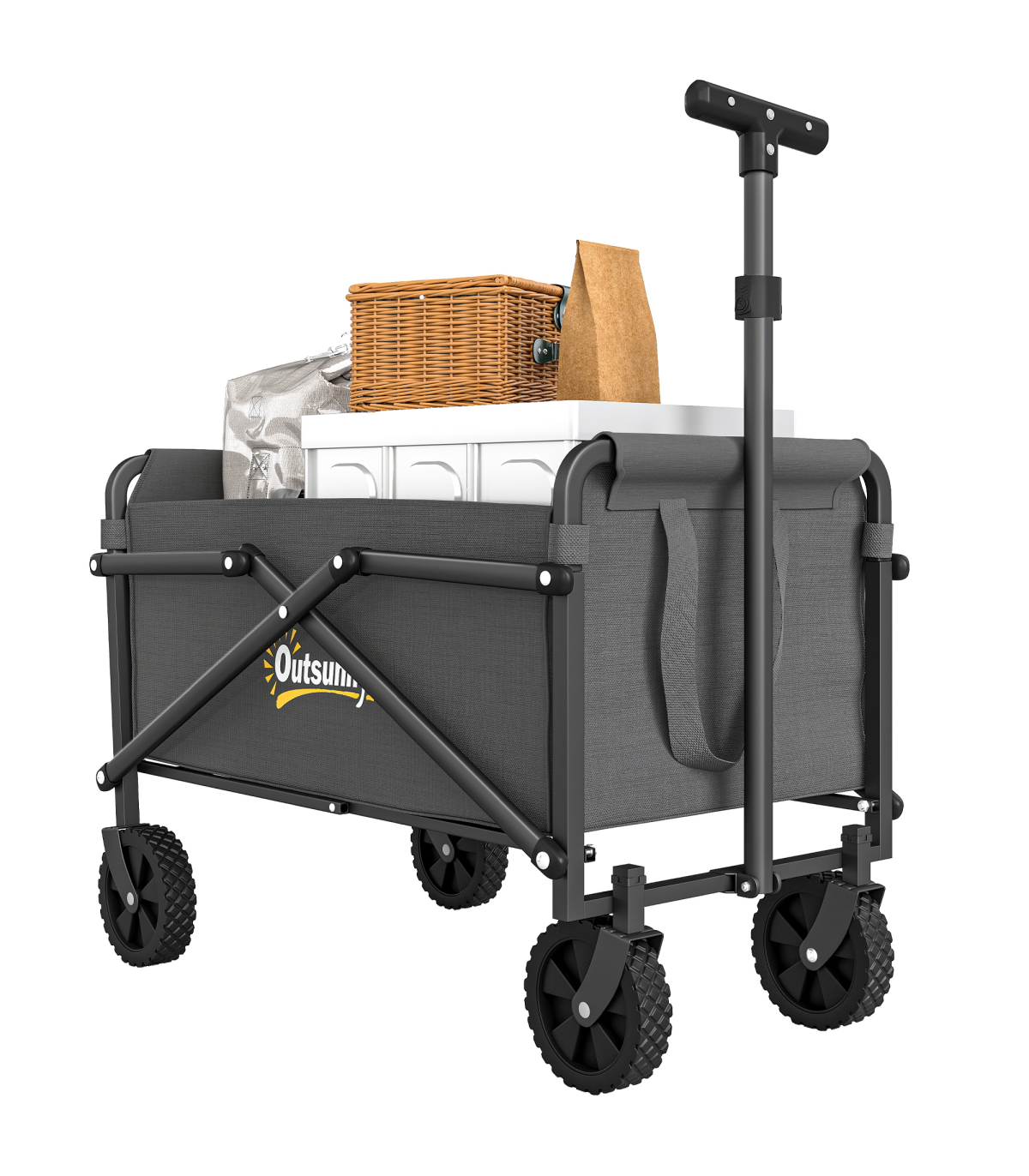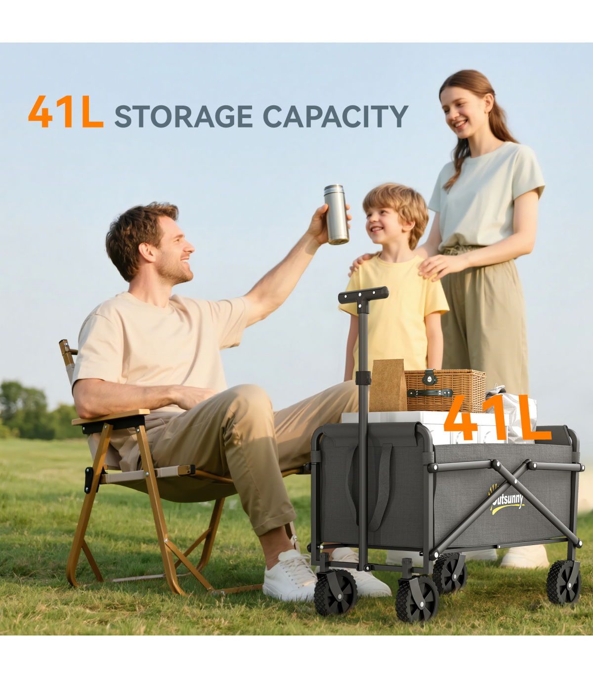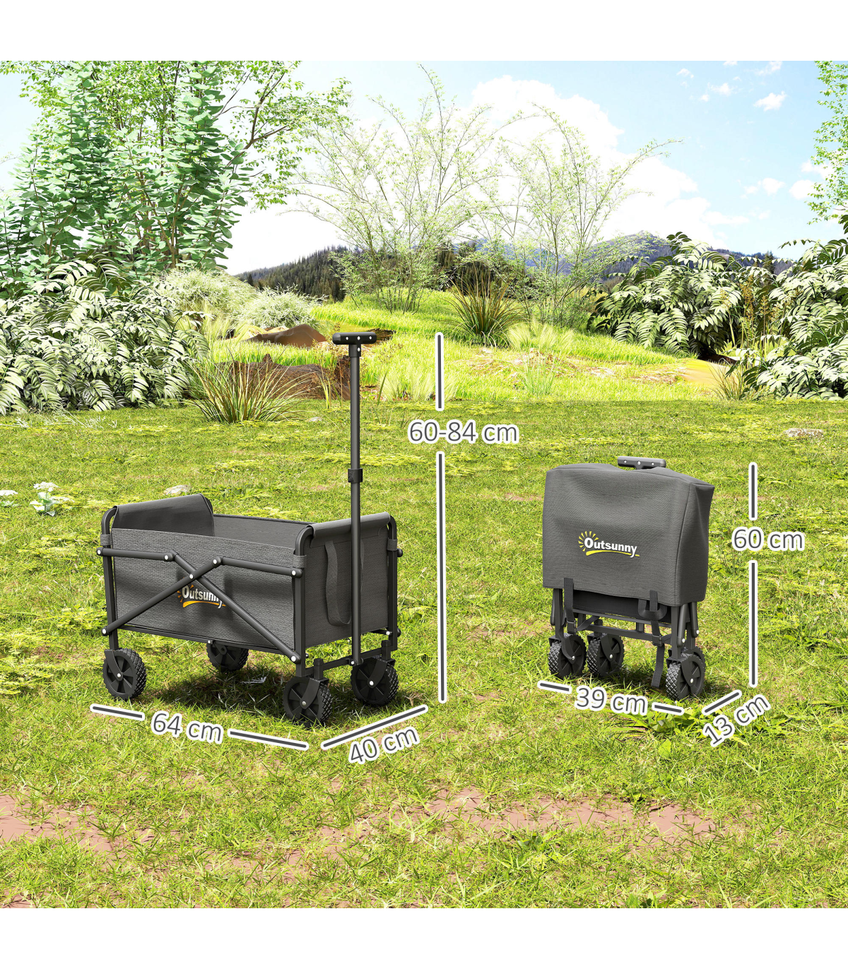 Discover the convenience of the Outsunny Garden Cart, a versatile trolley on wheels designed for every outdoor adventure. With a spacious 41 L cargo bag and robust 60 kg capacity, it's great as a festival trolley or camping trolley. Crafted from splash-resistant Oxford fabric and a powder-coated frame, this foldable cart is built for durability and ease.