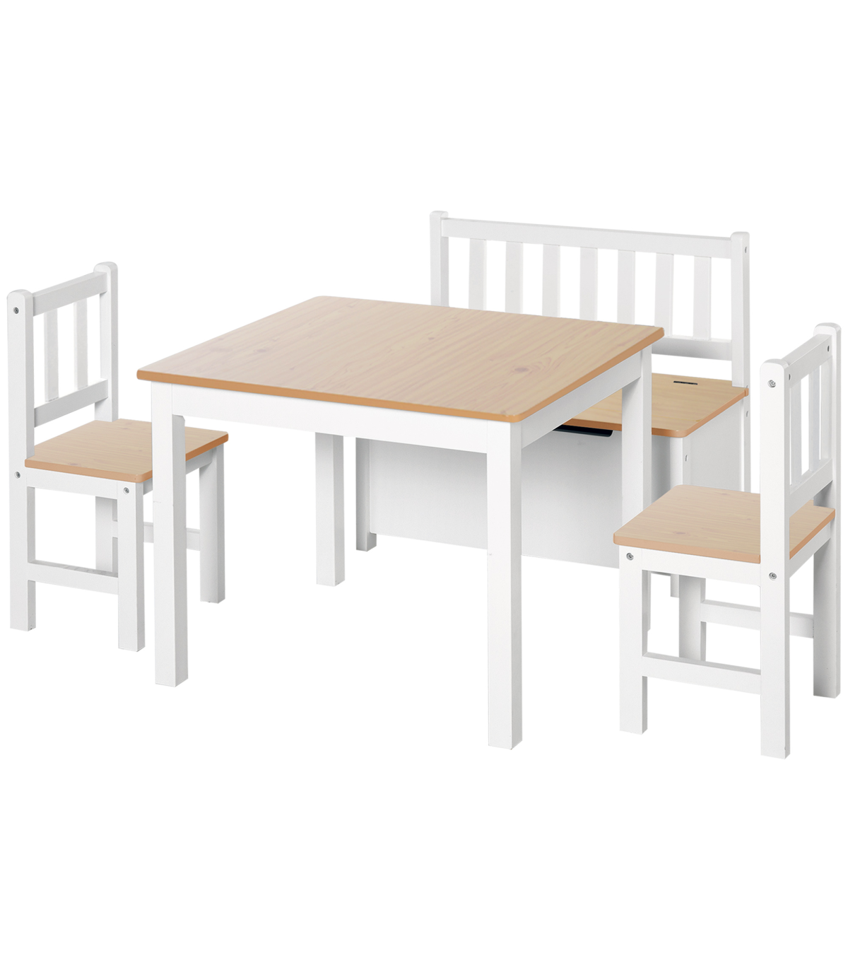 This HOMCOM Kids table and chair set will be a great addition to a kids bedroom. Comes complete with 2 chairs, a table, and a storage bench, it is designed in a great colour combination of white with natural wood table top and seating. Made from Pine wood and MDF for strength, and has a classic design. The storage bench can be very useful as it can store items under the lift up seat. This will be a great addition to any kids room décor.