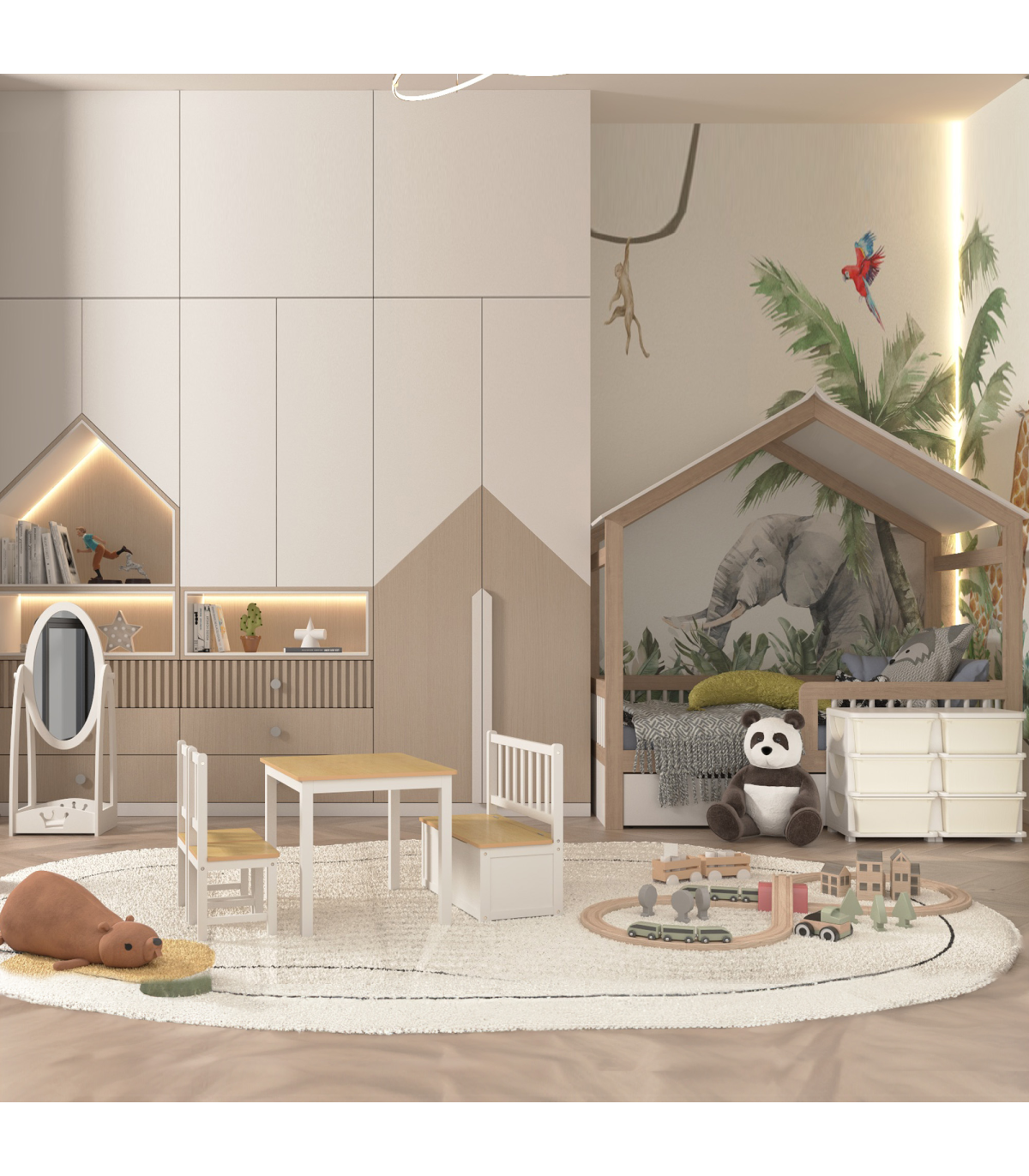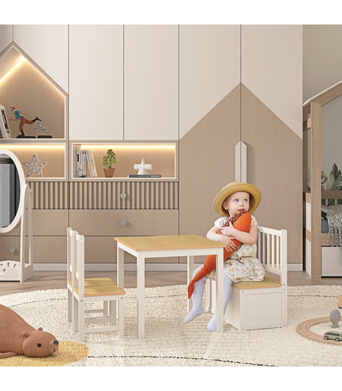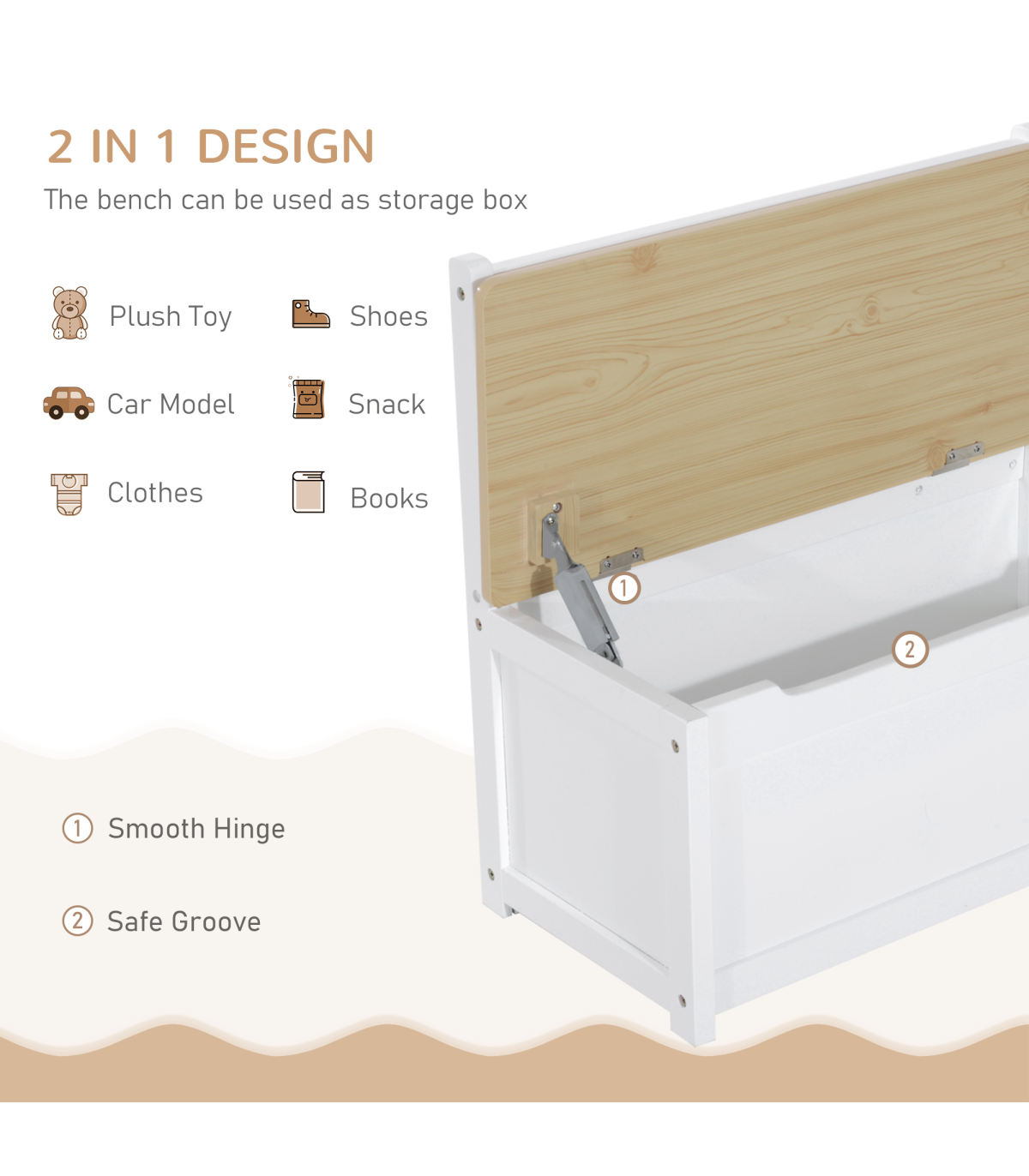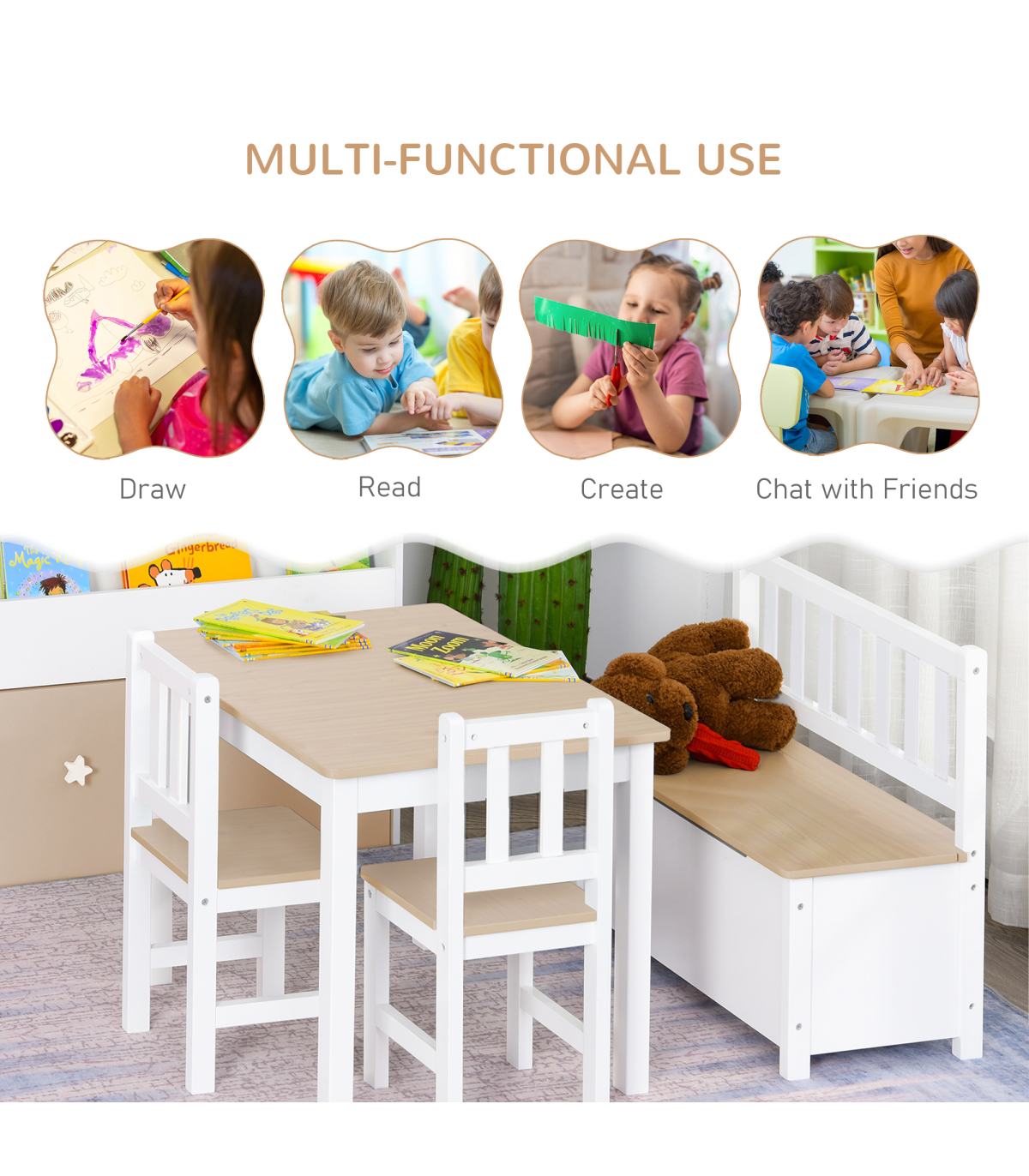 - Storage function in bench for toys, snacks, and books