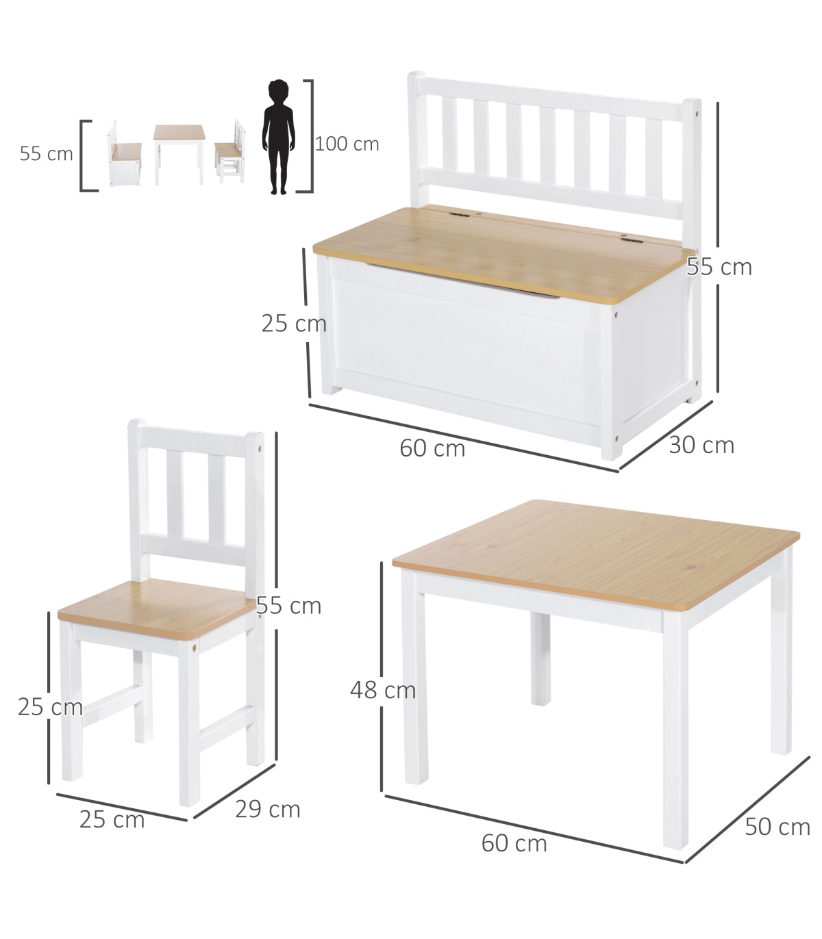 - Storage Bench: 60 L x 30 W x 55 H cm