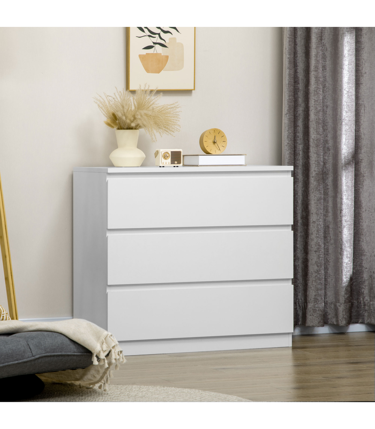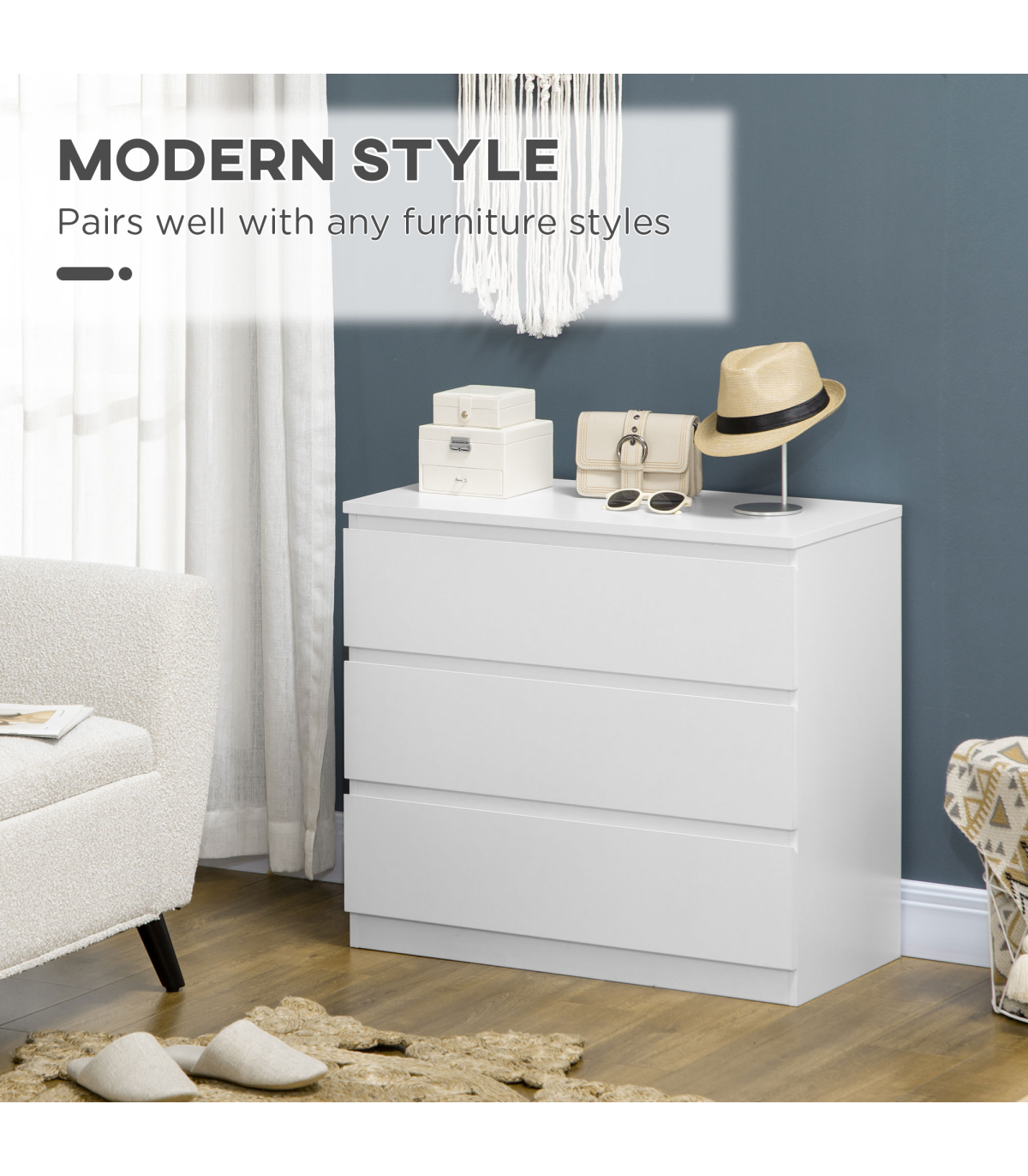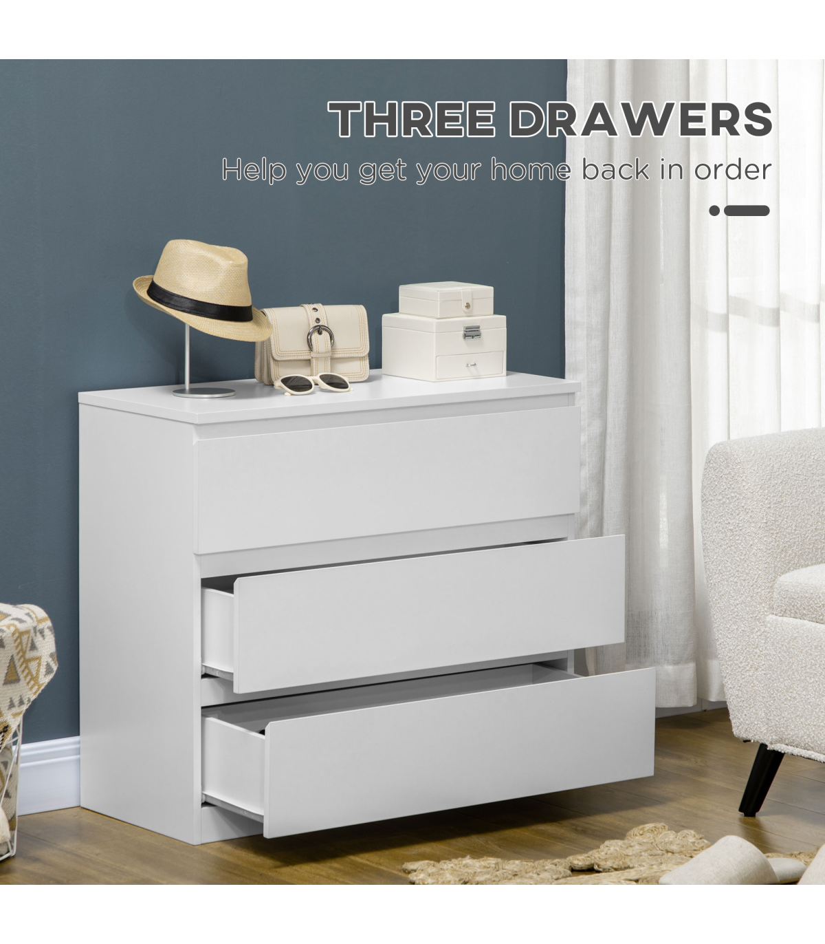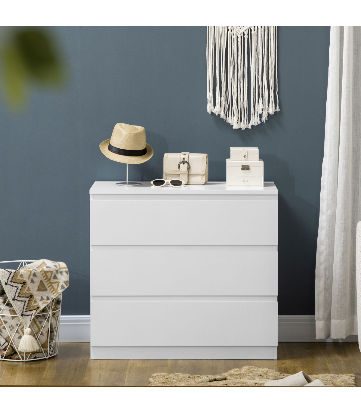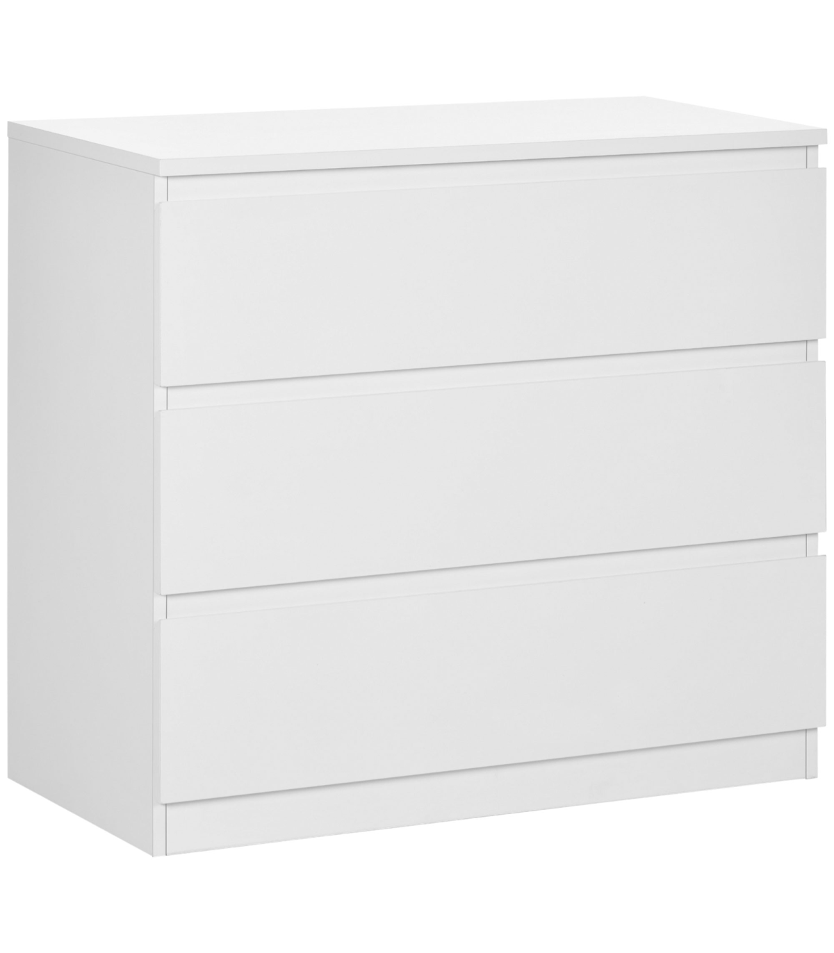 Features: - Three storage drawers for keeping clothing neatly stored - Simple, classic design in versatile white - Made from sturdy particle board - Anti-tipping hardware for safety - Dimensions: 73H x 80W x 39Dcm - Maximum load capacity: 36kg - Assembly required Product Description: The White 3-Drawer Dresser Storage Organiser is a versatile piece that offers ample storage space for your clothing. With three spacious drawers, this dresser is perfect for keeping your clothes organized. The simple and classic design in white makes it suitable for various home interior styles. Made from sturdy particle board, this dresser is durable and can withstand everyday use. For added safety, the dresser comes with anti-tipping hardware to secure it to the wall. With dimensions of 73H x 80W x 39Dcm, this dresser has a maximum load capacity of 36kg. Assembly is required. Specifications: - Dimensions: 73H x 80W x 39Dcm - Weight: 57.95kg - Colour: White
