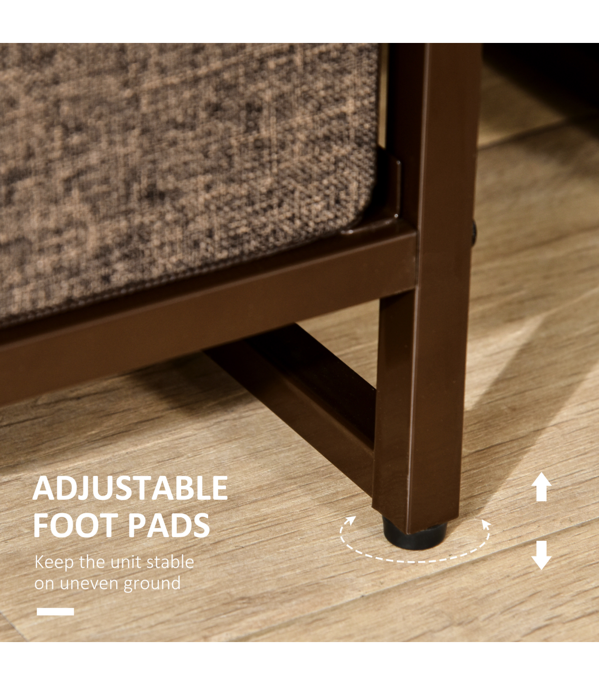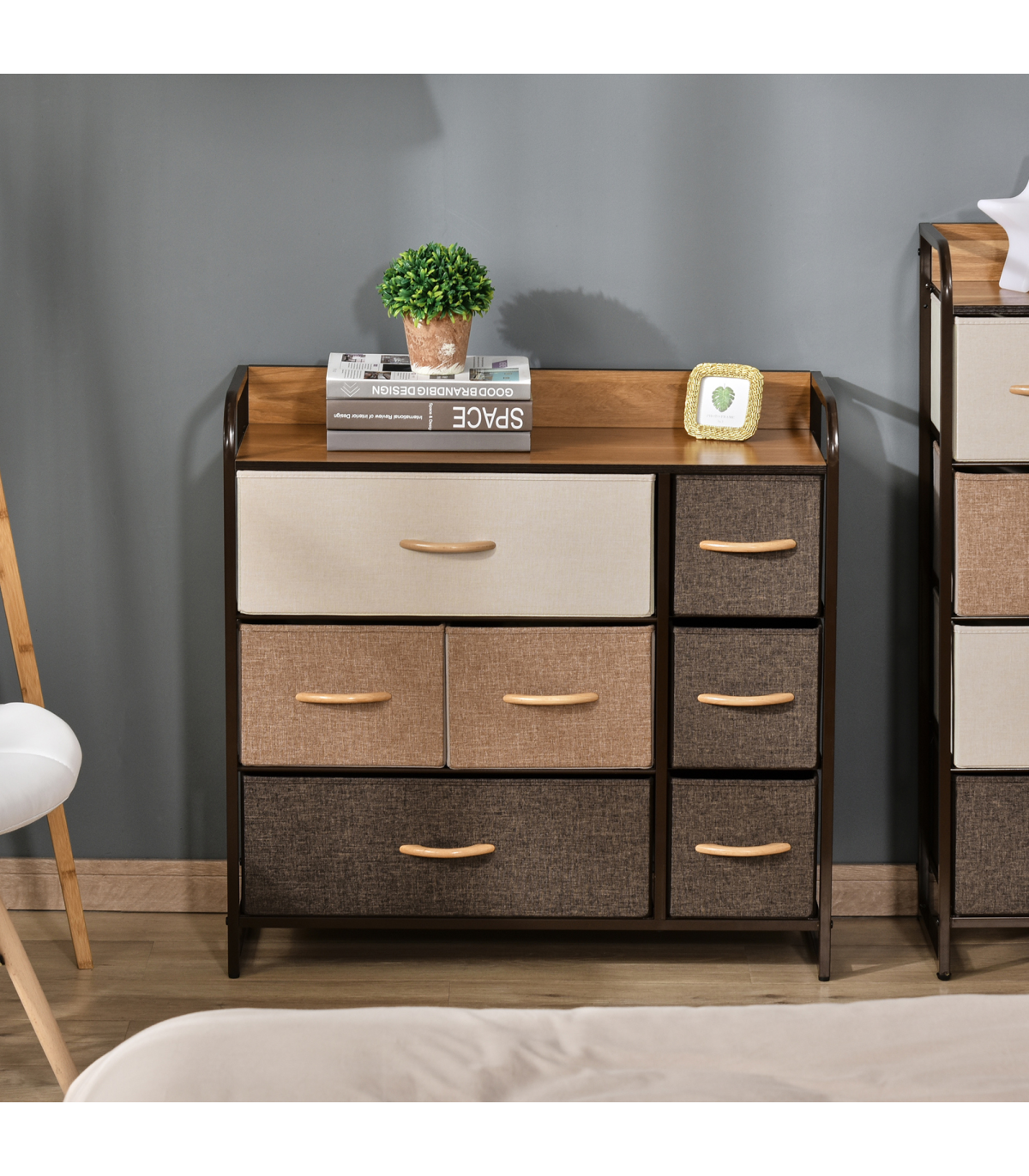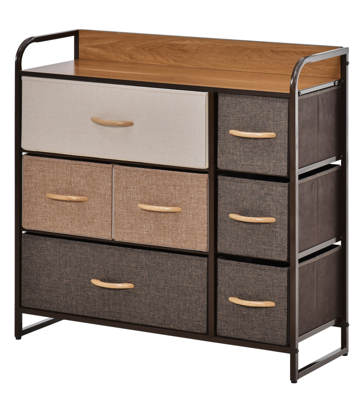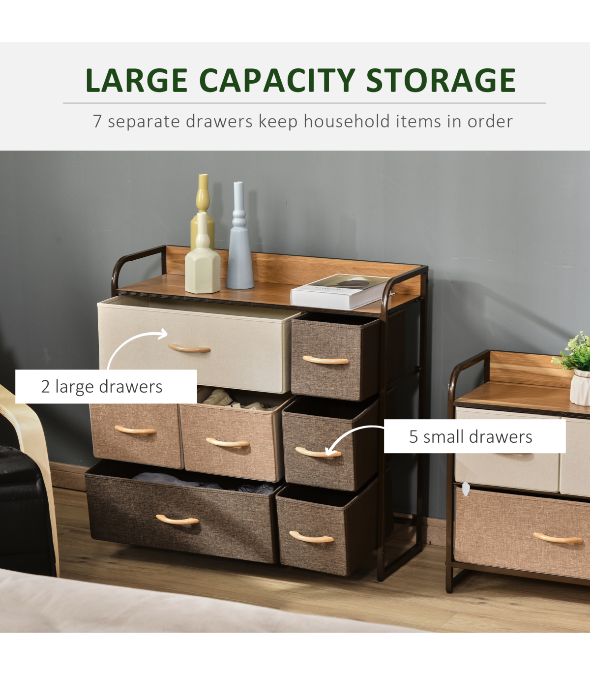 Enhance your home storage with the HOMCOM 7-Drawer Dresser, a perfect blend of style and functionality. This fabric chest of drawers features a unique multi-colored design that adds a pop of color to any room. With two large, two medium, and three small drawers, it offers versatile storage solutions for your clothes, accessories, and other essentials. The top shelf, crafted from MDF in a wood effect, provides additional display space that's both attractive and easy to maintain. The sturdy metal frame ensures long-lasting support, while adjustable feet keep the dresser balanced on uneven floors. Whether in your bedroom, living room, or hallway, this storage organizer is designed to keep your space tidy and stylish.