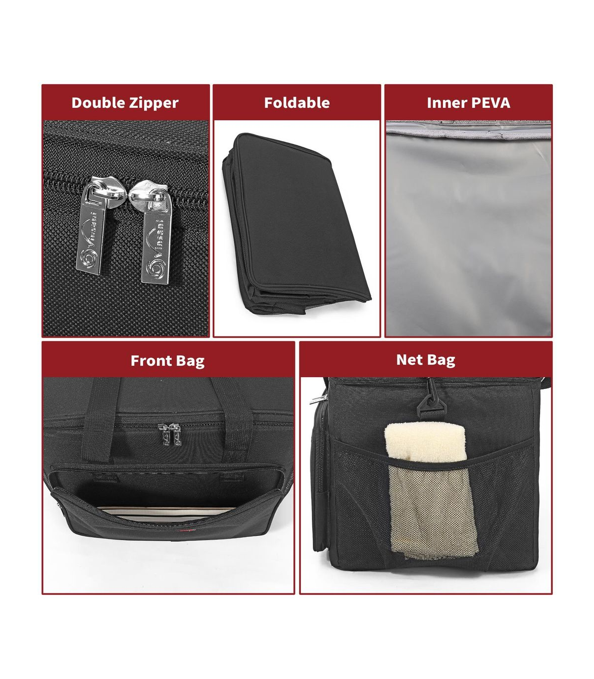 - Wide opening, double zipper, side net pockets, and front bag for storage