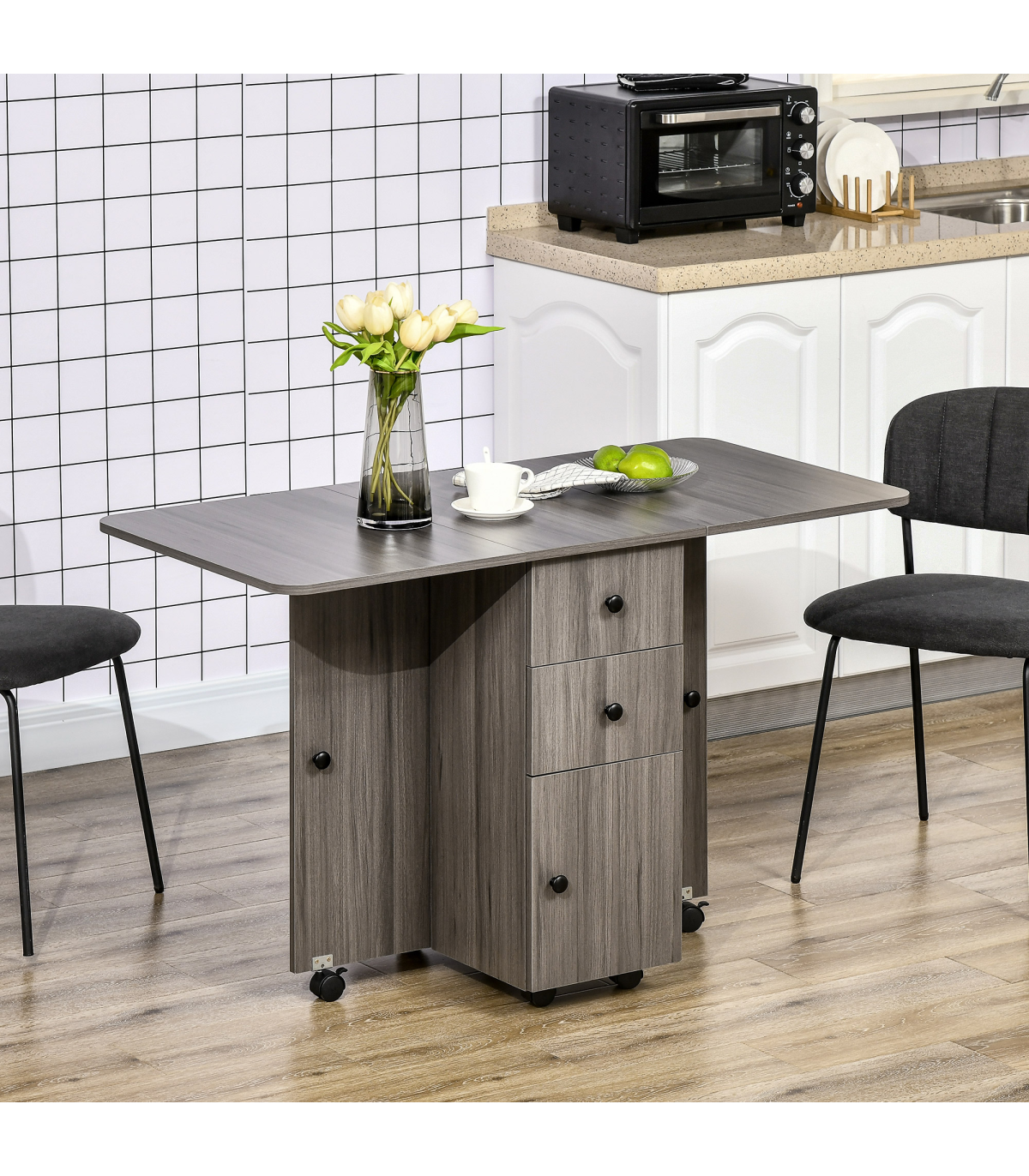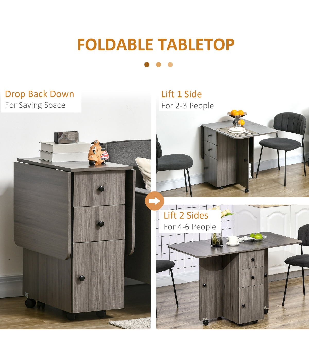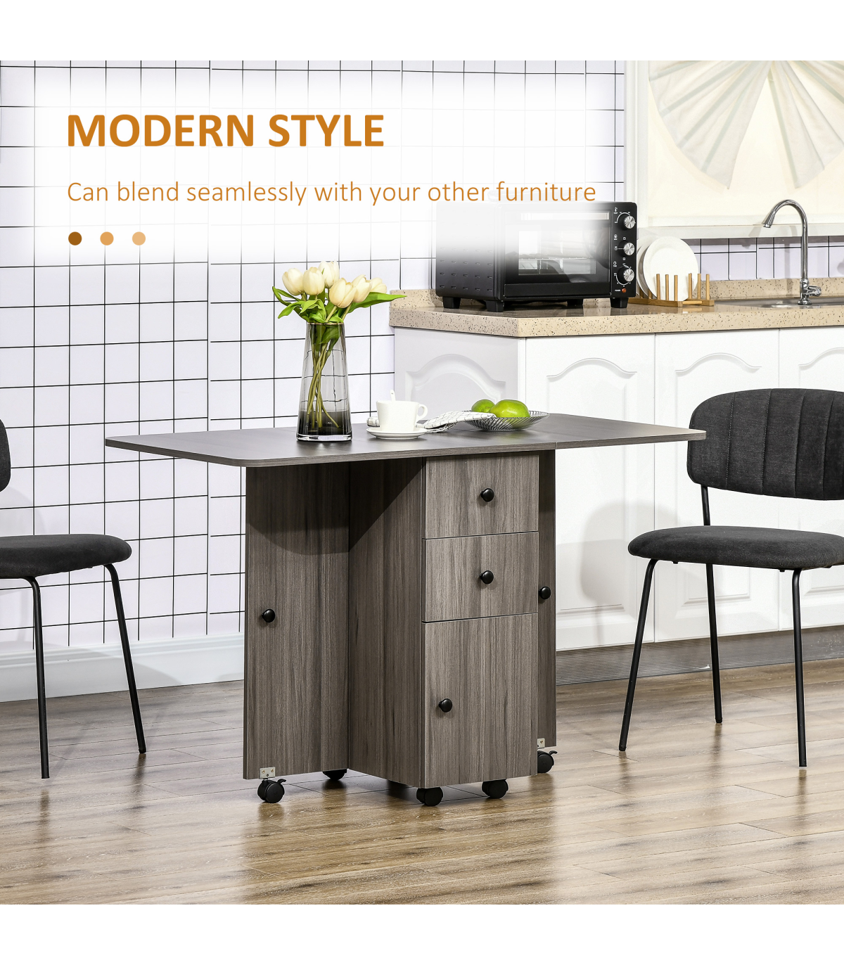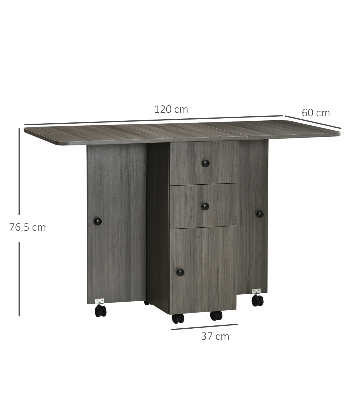 Maximize your dining and storage space with the HOMCOM Folding Dining Table. This versatile piece is perfect for smaller living spaces, offering a compact design with expandable features. The drop leaf design allows you to adjust the table size according to your needs, making it ideal for both intimate dinners and larger gatherings. It comes equipped with two drawers, a cupboard, and an open back shelf, providing ample storage for your kitchenware and dining essentials. The table is constructed from sturdy particle board and finished with a smooth, protective melamine coating, ensuring durability and ease of maintenance. With six wheels for effortless movement (four of which have brakes for added stability), this dining table combines functionality with style in a sleek grey finish.