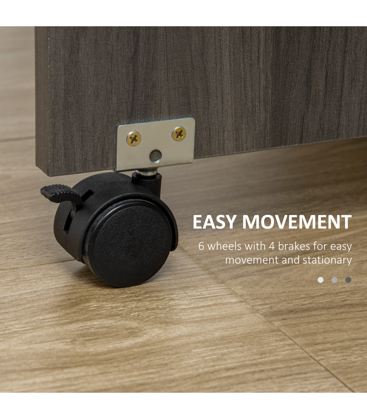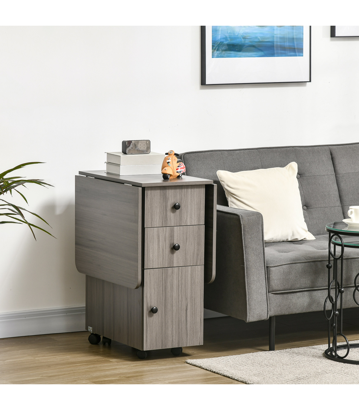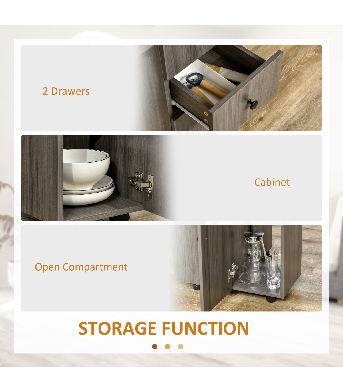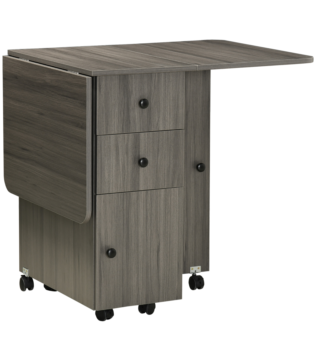 Maximize your dining and storage space with the HOMCOM Folding Dining Table. This versatile piece is perfect for smaller living spaces, offering a compact design with expandable features. The drop leaf design allows you to adjust the table size according to your needs, making it ideal for both intimate dinners and larger gatherings. It comes equipped with two drawers, a cupboard, and an open back shelf, providing ample storage for your kitchenware and dining essentials. The table is constructed from sturdy particle board and finished with a smooth, protective melamine coating, ensuring durability and ease of maintenance. With six wheels for effortless movement (four of which have brakes for added stability), this dining table combines functionality with style in a sleek grey finish.