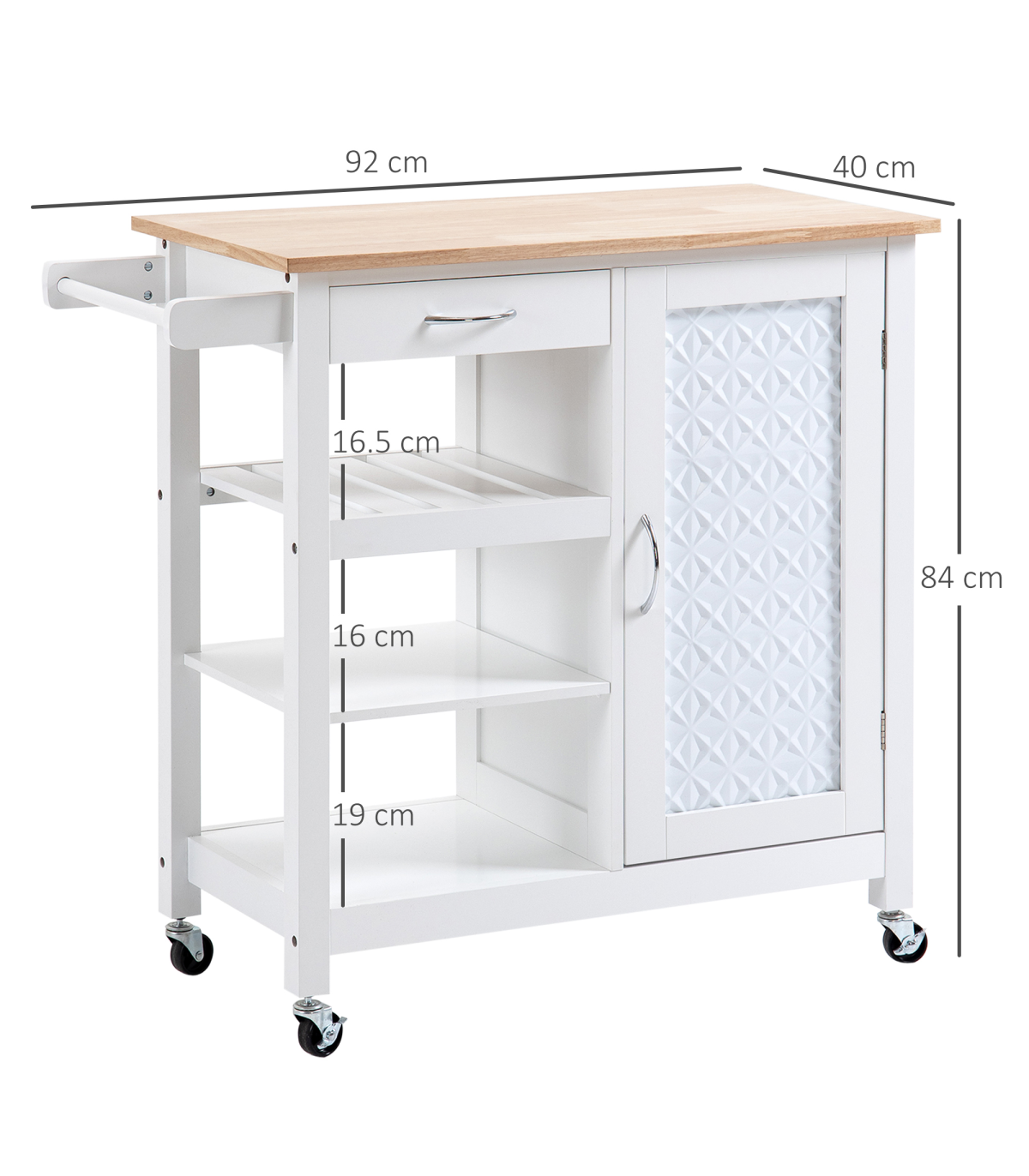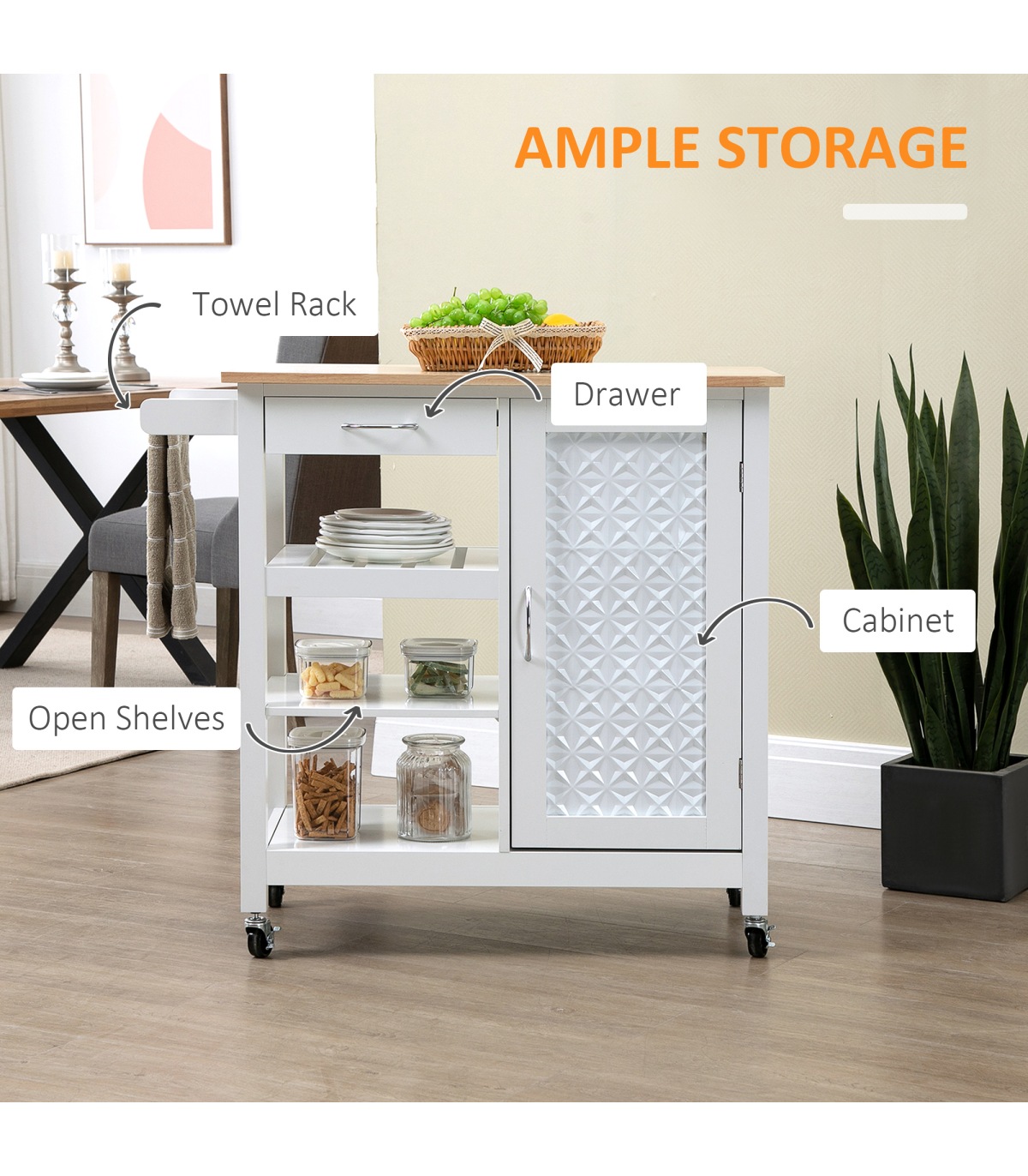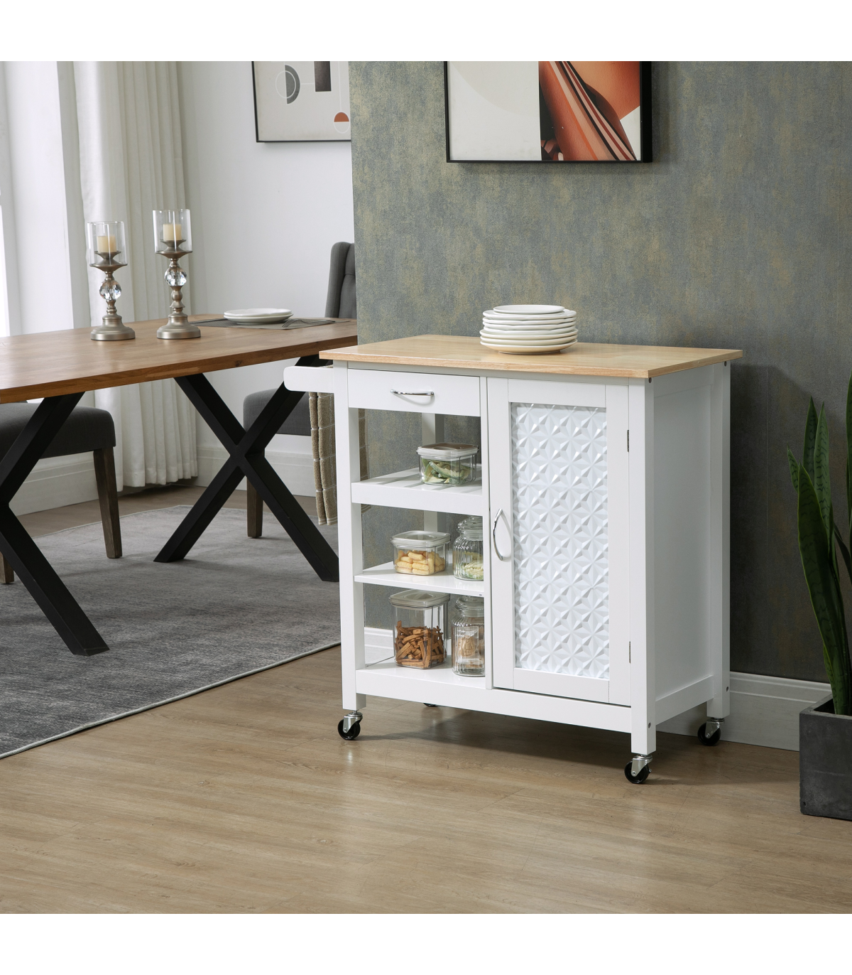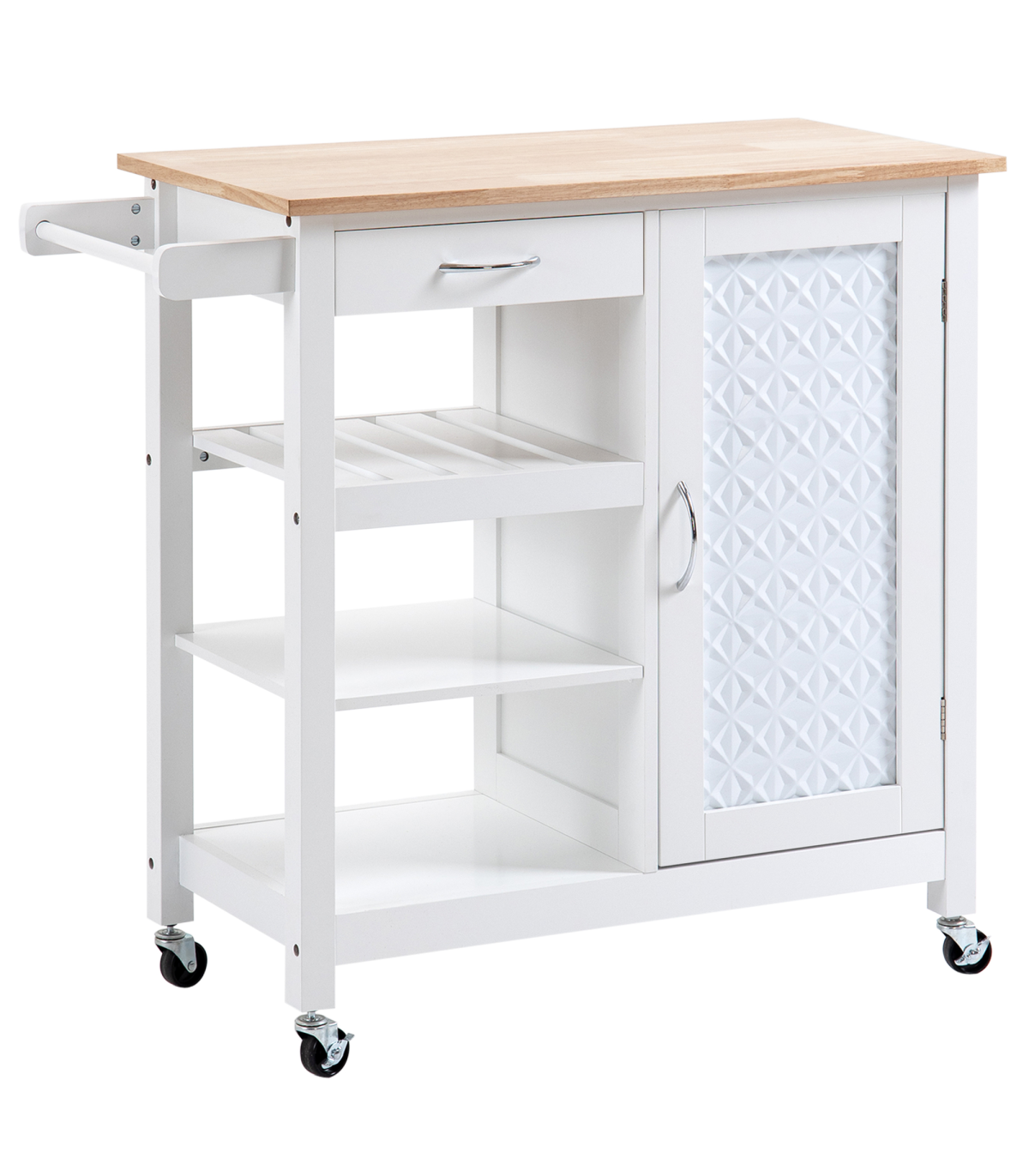 Enhance your kitchen's functionality and aesthetics with this versatile White Kitchen Cart Island. Designed to cater to your storage and mobility needs, this cart features a spacious drawer, a concealed cabinet, and a 3-tier open shelf, providing ample space for your kitchen and dining essentials. The embossed door panel and white finish add a touch of elegance, creating a focal point in your space. Whether you're hosting a party or need extra space for your kitchenware, this cart's smooth-rolling wheels allow for effortless movement throughout your home. The adjustable shelf within the cabinet allows for customized storage solutions, making it easier to organize your items. Constructed from durable MDF and metal, this kitchen cart is built to last and requires minimal maintenance. Assembly is required, but the result is a functional and stylish addition to your kitchen.