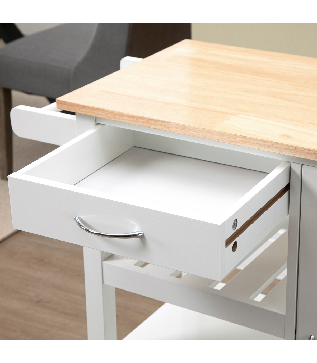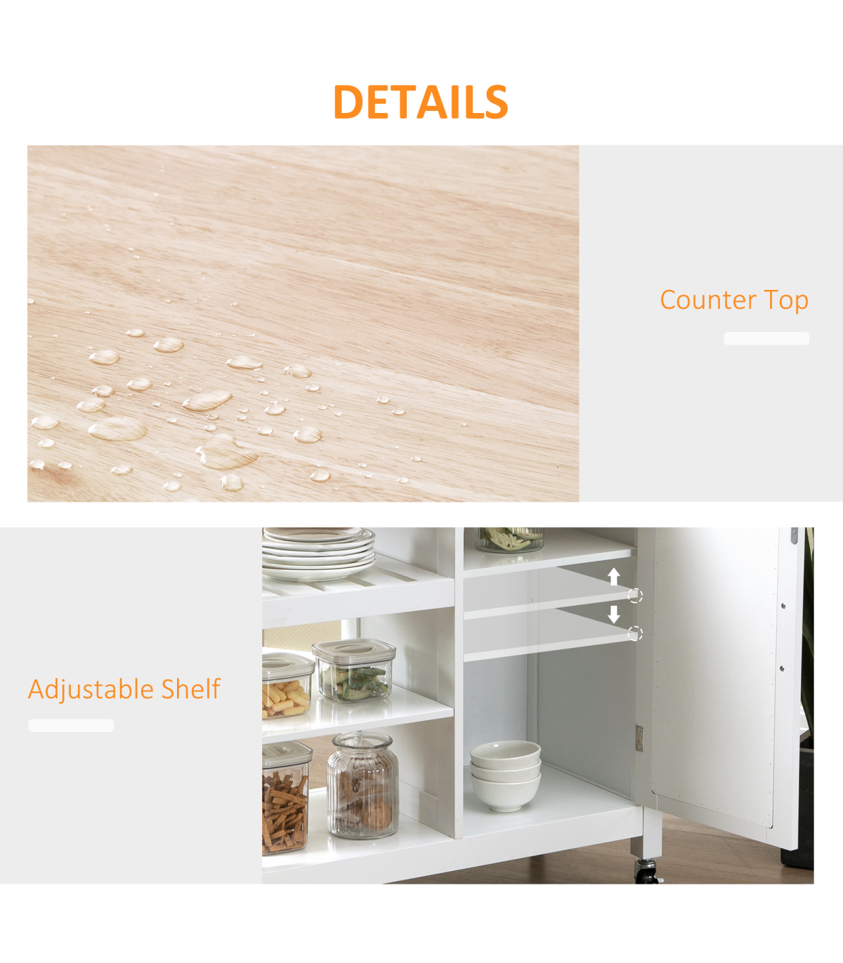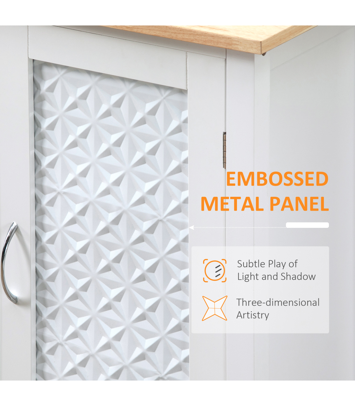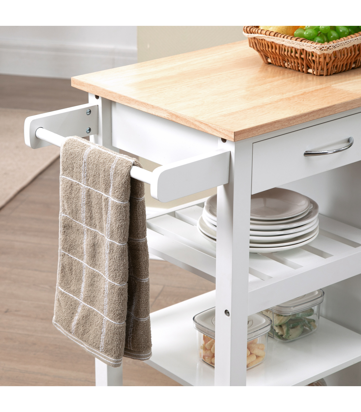 Enhance your kitchen's functionality and aesthetics with this versatile White Kitchen Cart Island. Designed to cater to your storage and mobility needs, this cart features a spacious drawer, a concealed cabinet, and a 3-tier open shelf, providing ample space for your kitchen and dining essentials. The embossed door panel and white finish add a touch of elegance, creating a focal point in your space. Whether you're hosting a party or need extra space for your kitchenware, this cart's smooth-rolling wheels allow for effortless movement throughout your home. The adjustable shelf within the cabinet allows for customized storage solutions, making it easier to organize your items. Constructed from durable MDF and metal, this kitchen cart is built to last and requires minimal maintenance. Assembly is required, but the result is a functional and stylish addition to your kitchen.