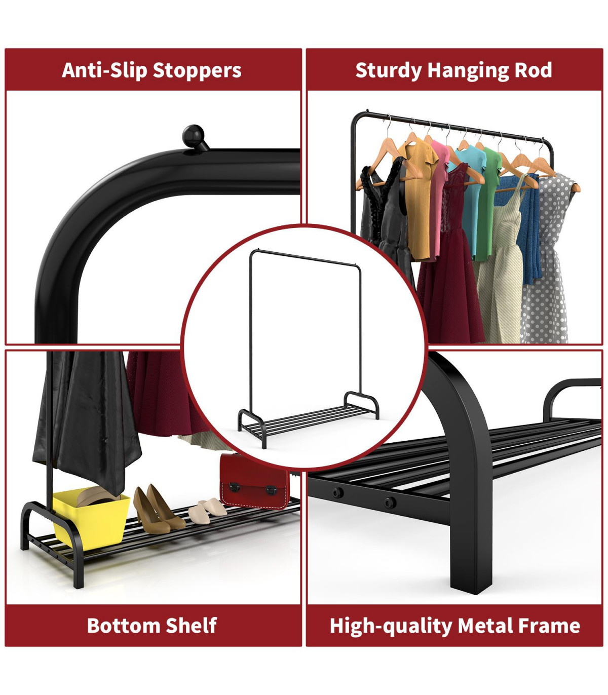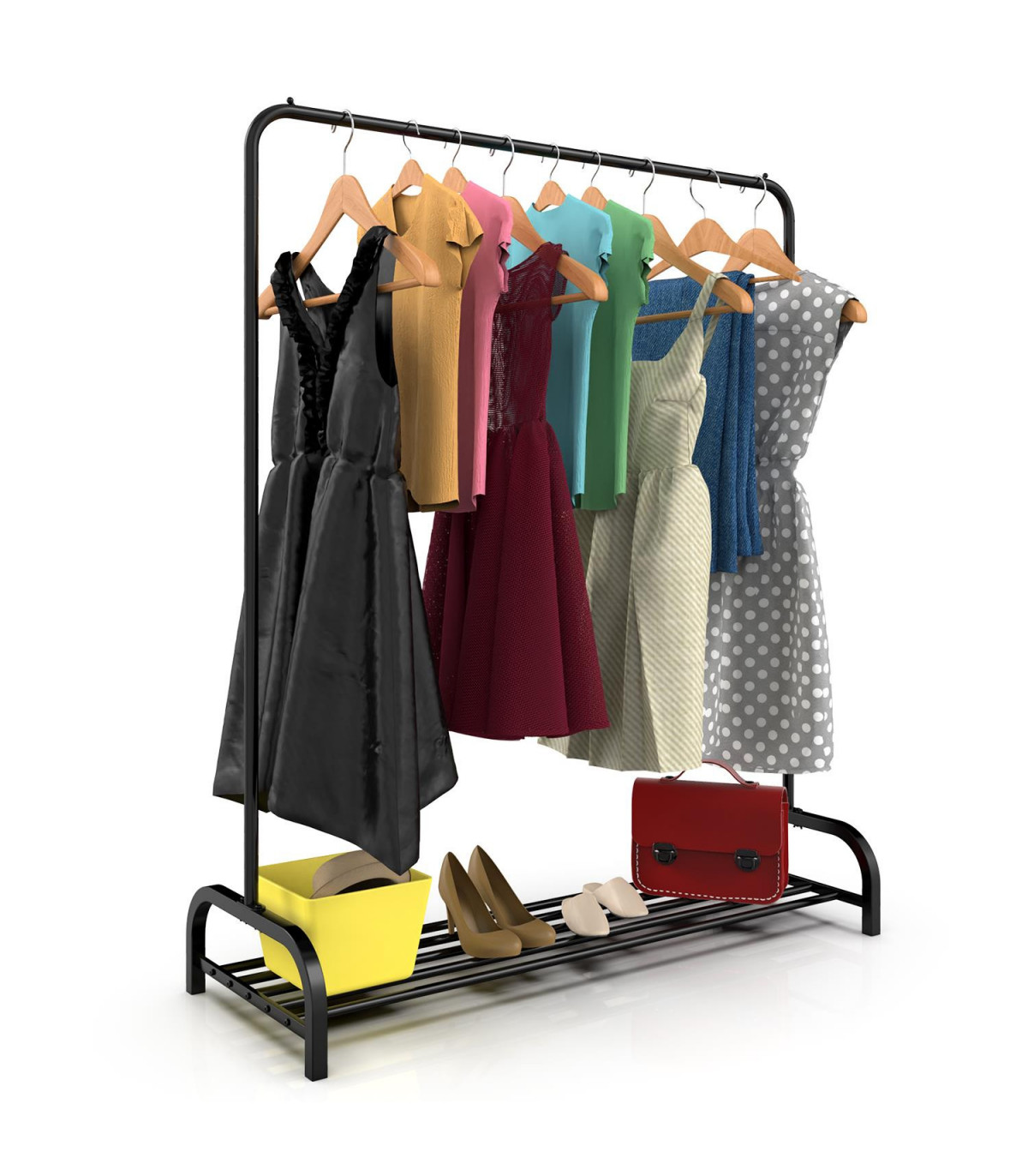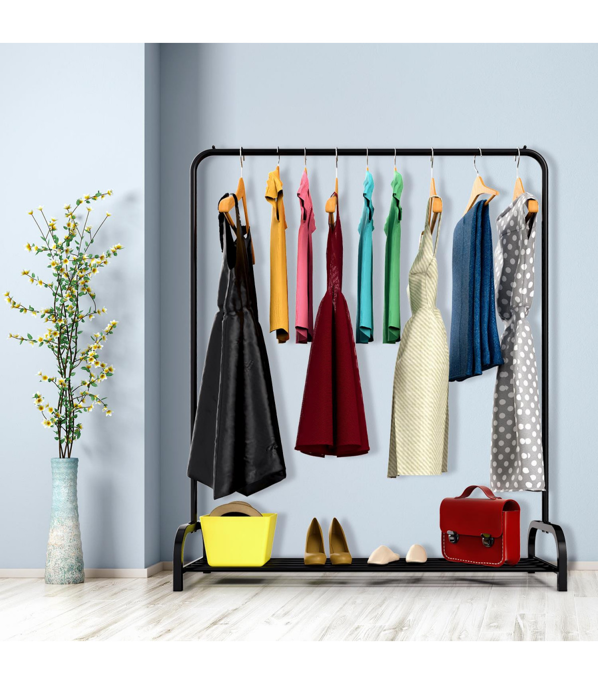Keep your home tidy with this elegant Black Metal Clothes Rail Stand. The perfect addition to your hallway, entryway, or balcony, this stand will help you stay organized and clutter-free. The combination of clothes rail and shoe rack makes it a versatile storage solution for your everyday outfits or seasonal favorites. The side stoppers prevent clothes from falling, while the bottom shelf with 7 bars can hold shoes, boots, or other accessories. Made from premium quality varnish metal, this stand is durable and sturdy, capable of holding up to 40kg of evenly distributed weight (20kg on the hanging rail and 20kg on the lower shelf). Assembly is a breeze with easy-to-follow instructions and uncomplicated parts that can be put together in minutes. Product dimensions are approximately 160 x 45 x 120 cm.