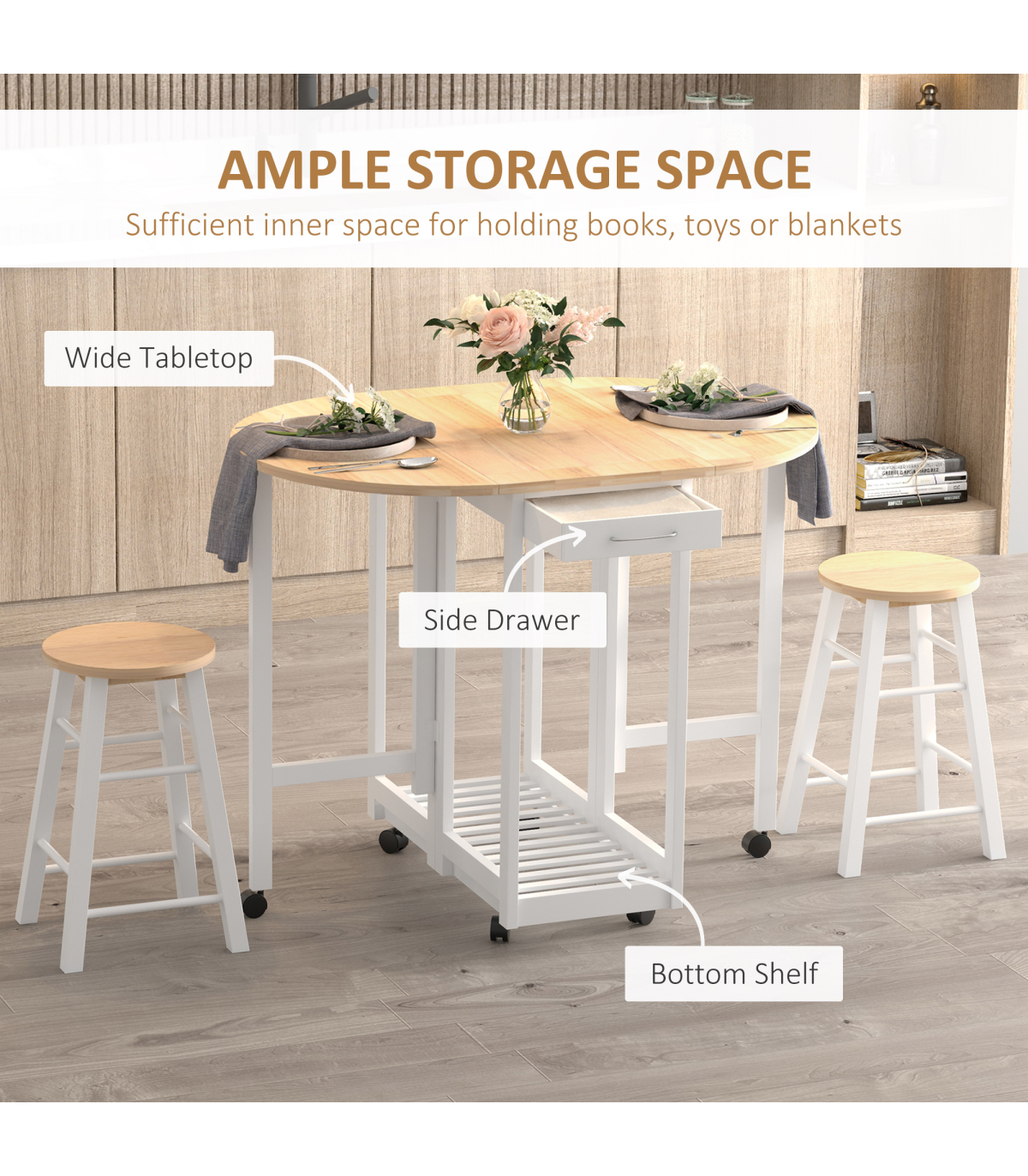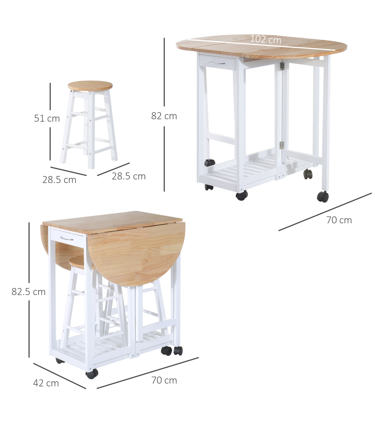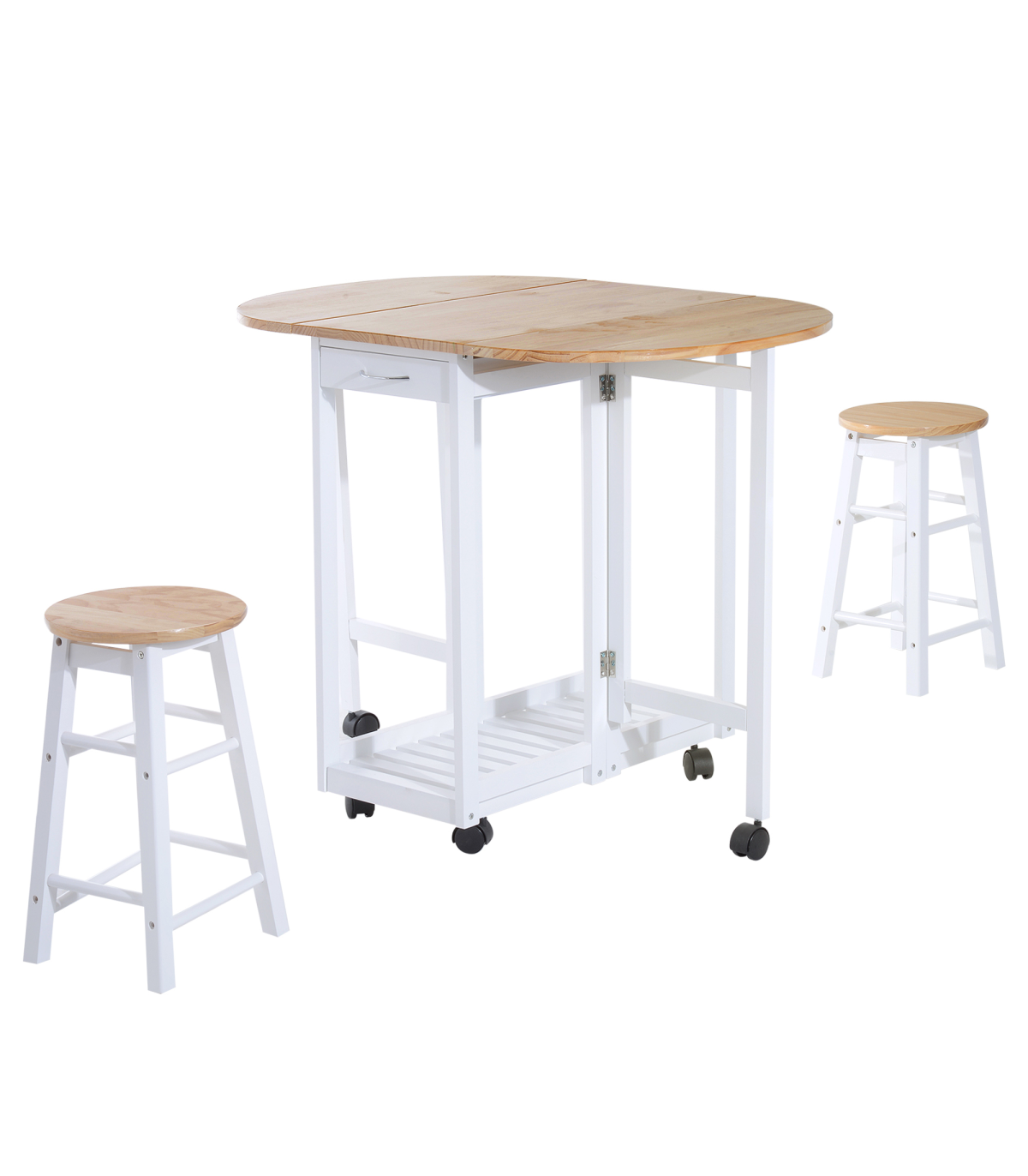 Enhance your home with our White 3pc Wooden Kitchen Cart Set, a perfect blend of style and functionality. Designed for compact spaces, this set features a modern bar table and two folding stools. The drop-leaf tabletop can be adjusted to your needs, offering a versatile dining or working space. Stools can be neatly tucked under the table, maximizing your space. The smooth pinewood top and bottom slat storage shelf are not only stylish but also practical, providing extra storage and easy maintenance. With 6 smooth rolling casters, this cart can be easily moved around, making it a convenient addition to any room. Whether for dining, working, or as an extra storage solution, this set is sure to impress.