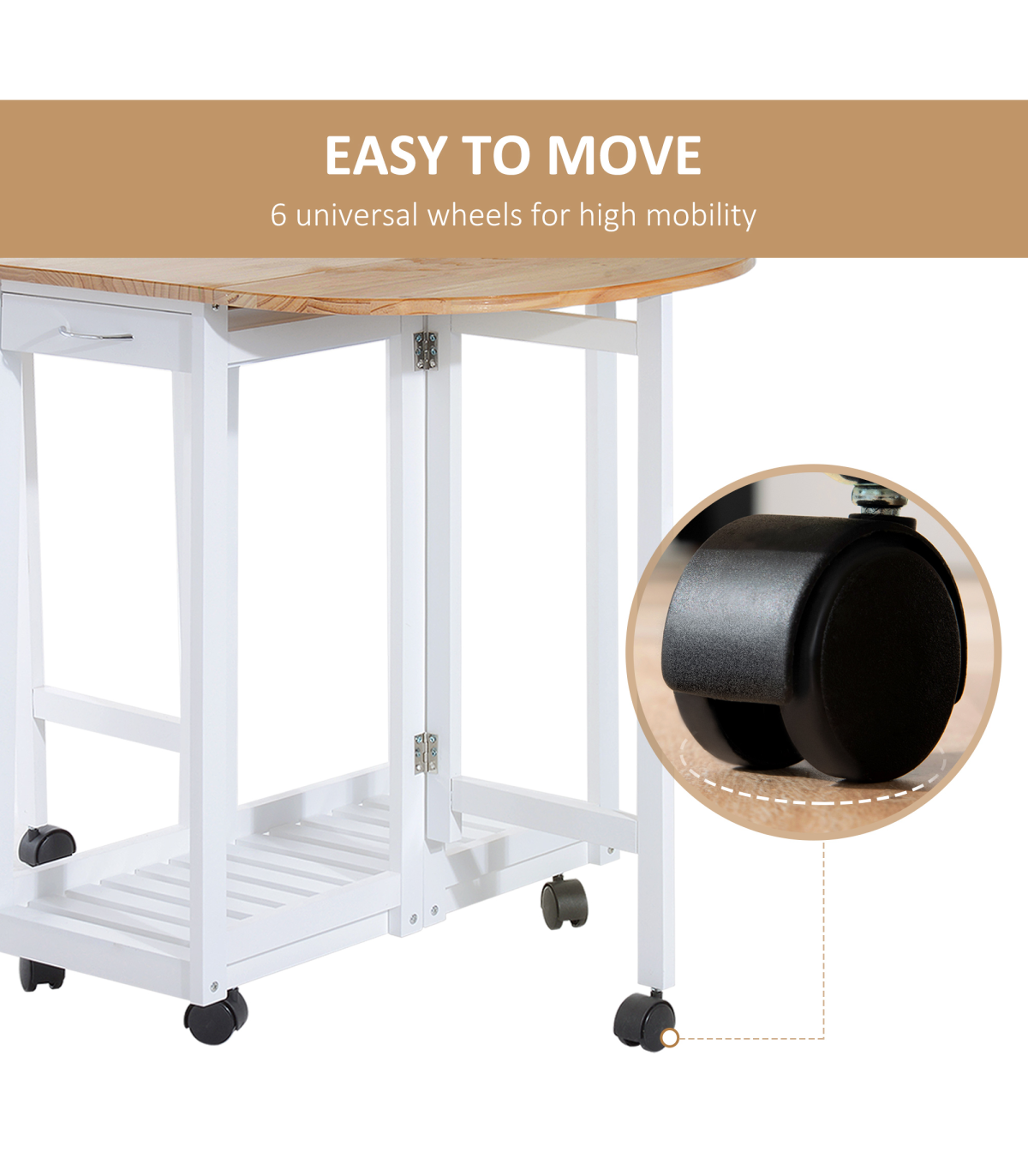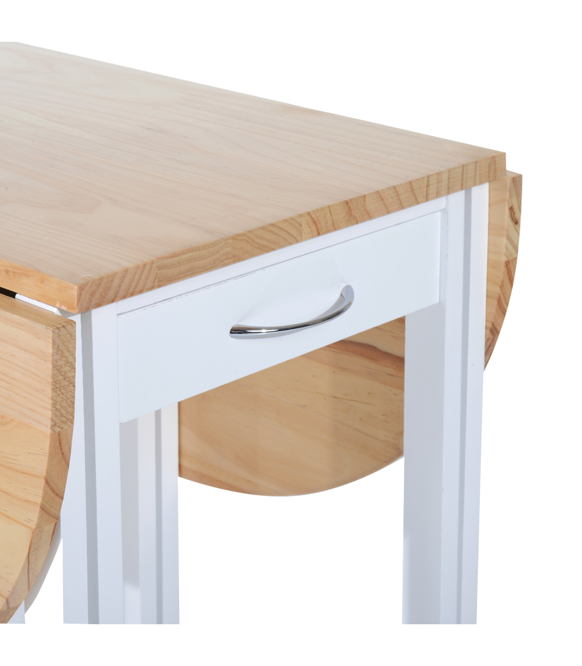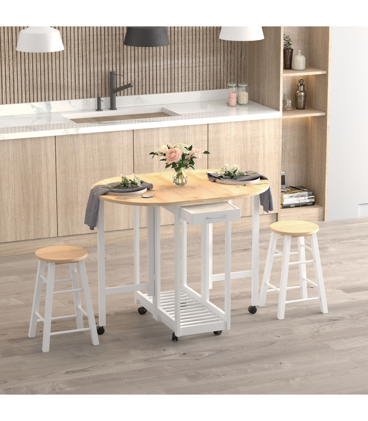 Enhance your home with our White 3pc Wooden Kitchen Cart Set, a perfect blend of style and functionality. Designed for compact spaces, this set features a modern bar table and two folding stools. The drop-leaf tabletop can be adjusted to your needs, offering a versatile dining or working space. Stools can be neatly tucked under the table, maximizing your space. The smooth pinewood top and bottom slat storage shelf are not only stylish but also practical, providing extra storage and easy maintenance. With 6 smooth rolling casters, this cart can be easily moved around, making it a convenient addition to any room. Whether for dining, working, or as an extra storage solution, this set is sure to impress.