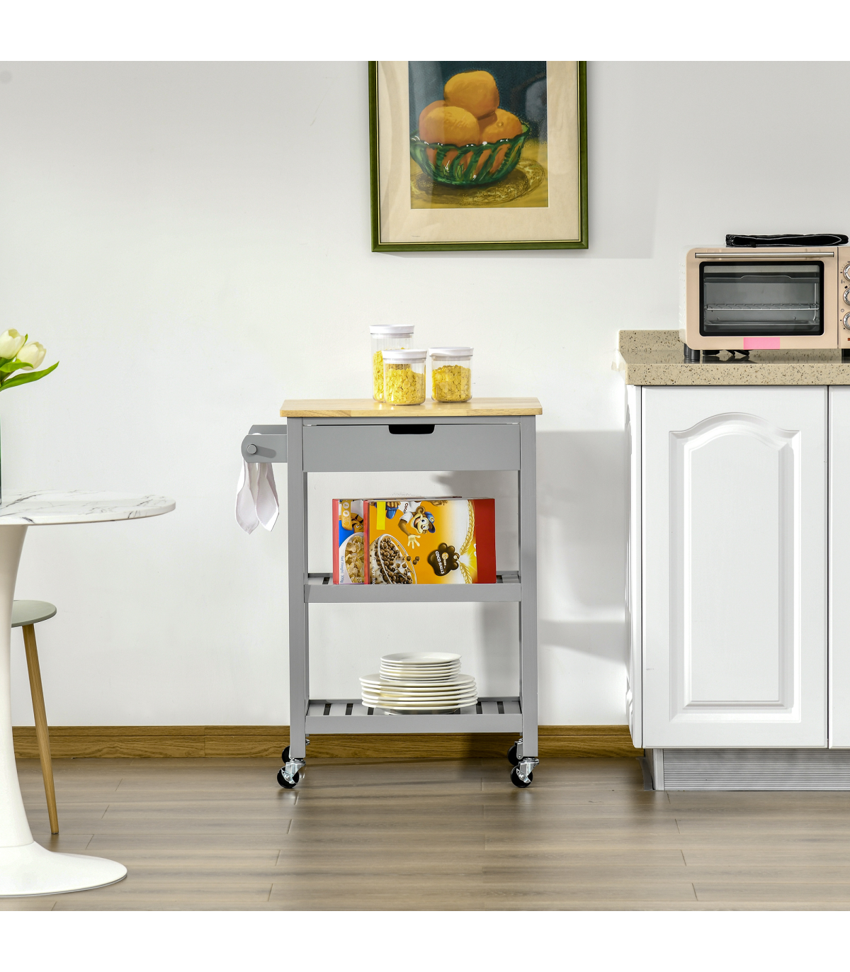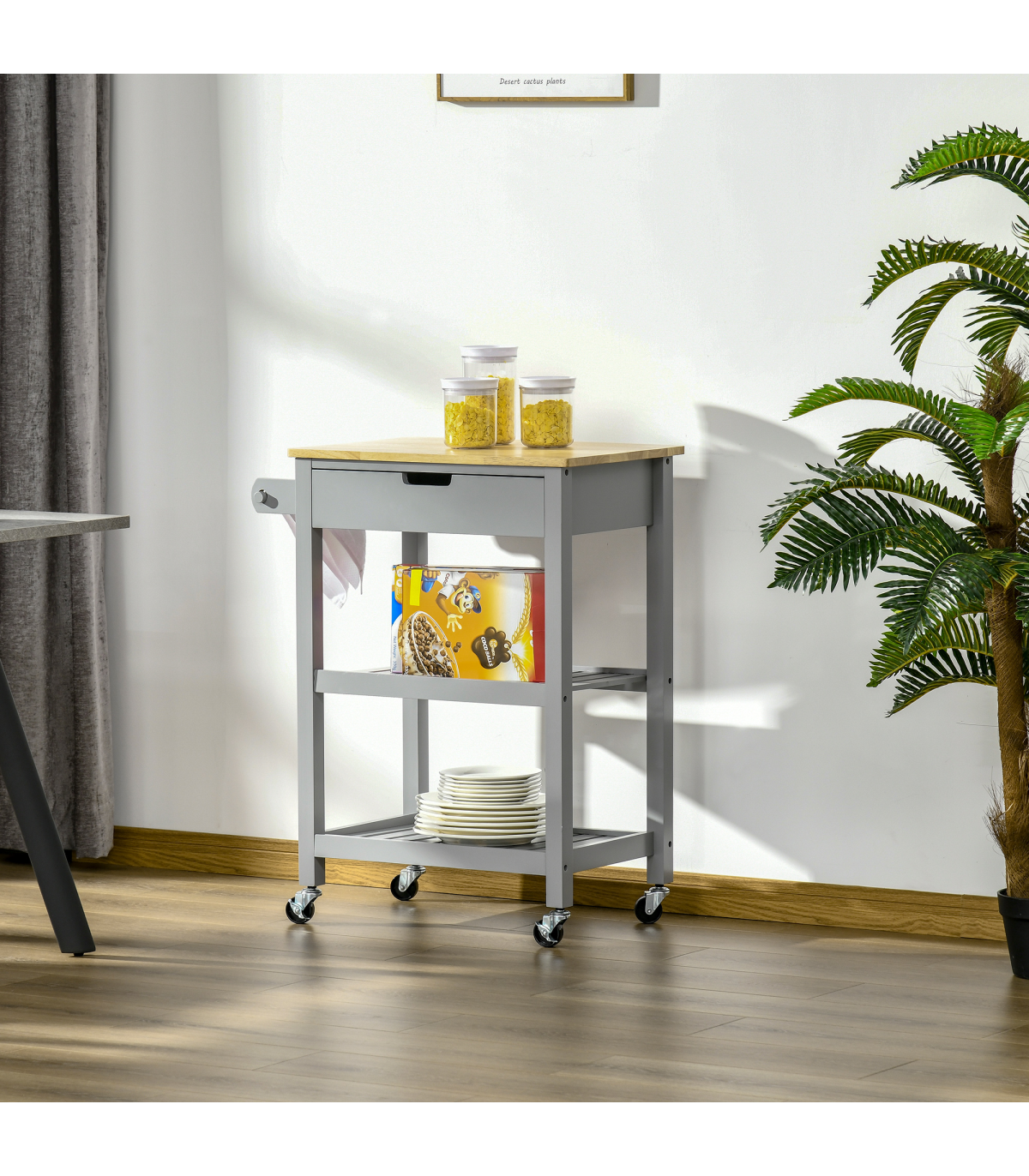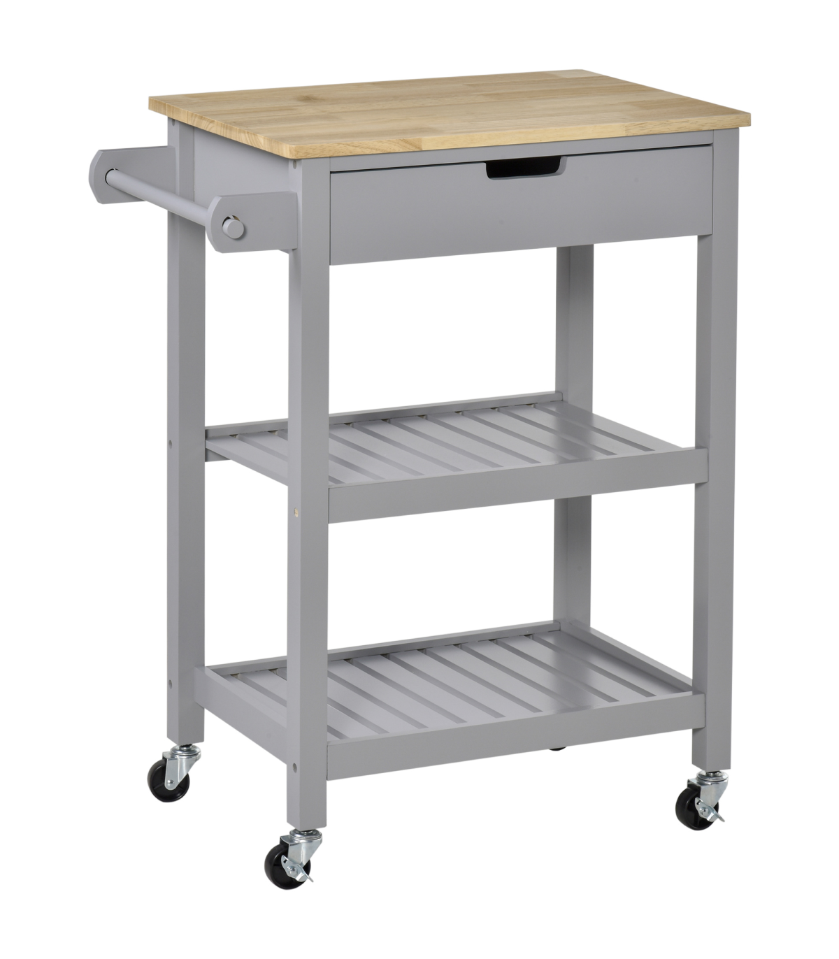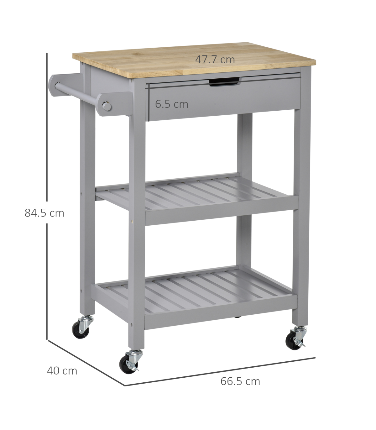 Features: - Storage included: drawer, two shelves, and towel rack - Gaps in shelves prevent liquids from building up - Four castor wheels for easy pushing, two with brakes - Wooden top for preparation with a protective top coat - Durable MDF body that can be easily wiped clean - Assembly required Product Description: Whether you need a helping hand at parties or extra space in the kitchen every day, this island cabinet from HOMCOM is the perfect solution. The trolley cart is equipped with four wheels for easy mobility and features a drawer, two open shelves, and a towel rack for ample storage space for food, crockery, and bottles. The rubberwood top provides a sturdy and convenient preparation area. Dimensions: - Length: 66.5cm - Width: 40cm - Height: 84.5cm - Weight: 73kg - Colour: Grey