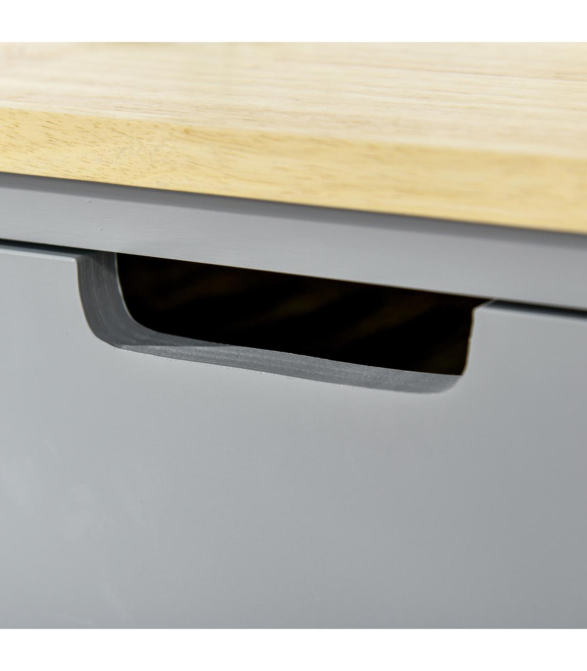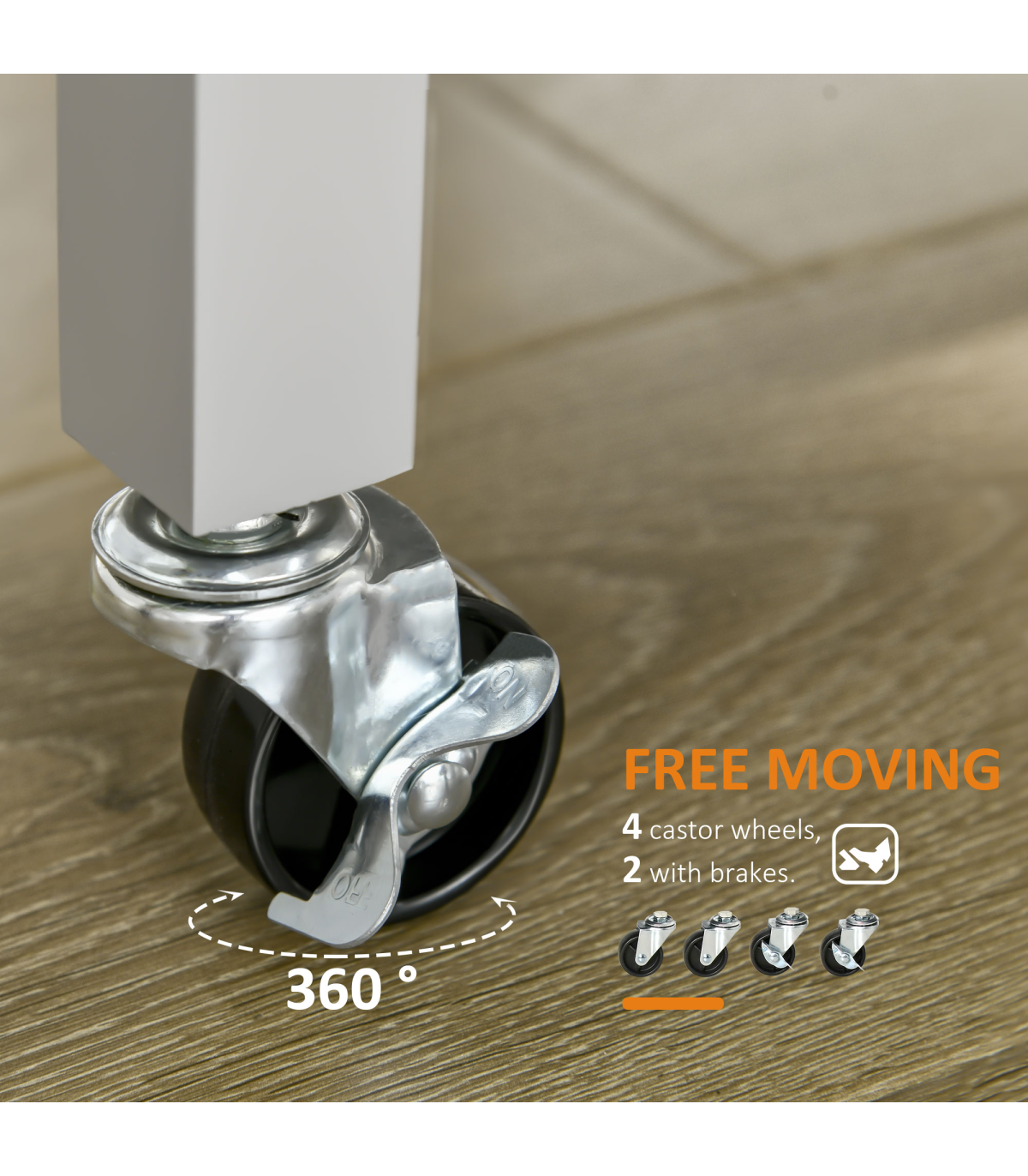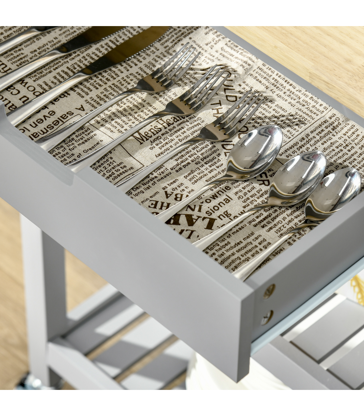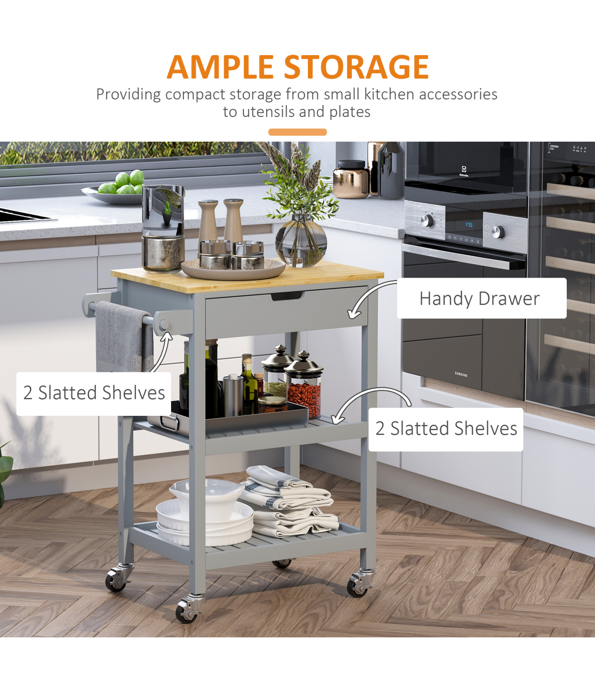 Features: - Storage included: drawer, two shelves, and towel rack - Gaps in shelves prevent liquids from building up - Four castor wheels for easy pushing, two with brakes - Wooden top for preparation with a protective top coat - Durable MDF body that can be easily wiped clean - Assembly required Product Description: Whether you need a helping hand at parties or extra space in the kitchen every day, this island cabinet from HOMCOM is the perfect solution. The trolley cart is equipped with four wheels for easy mobility and features a drawer, two open shelves, and a towel rack for ample storage space for food, crockery, and bottles. The rubberwood top provides a sturdy and convenient preparation area. Dimensions: - Length: 66.5cm - Width: 40cm - Height: 84.5cm - Weight: 73kg - Colour: Grey