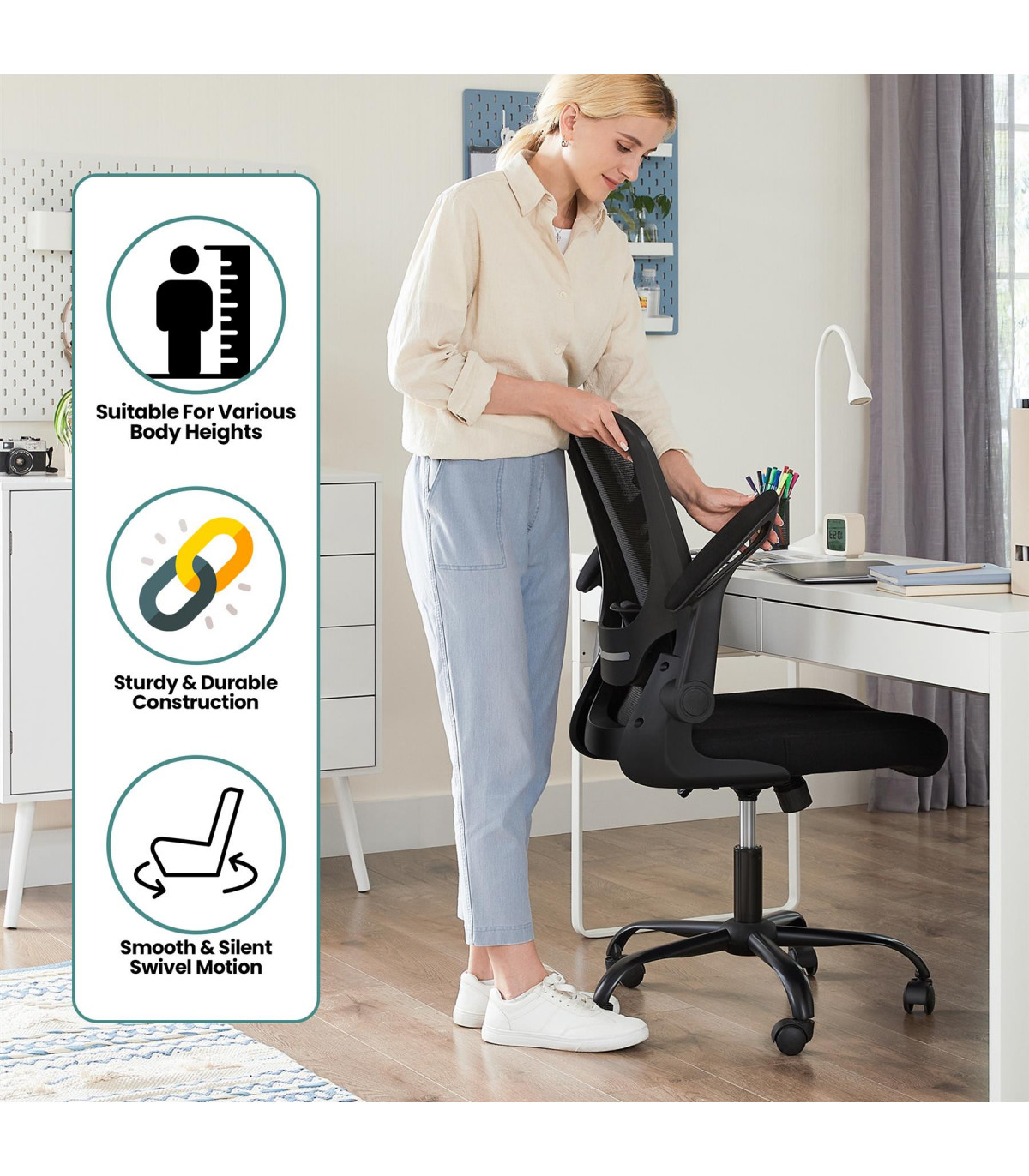 - Superior Comfort and High-density Foam Padded Seat for Added Comfort - Lumbar Feature Supports Your Lower Back and Enhances the Natural Curve of Your Spine - 360° Swivel Wheels for Easy Mobility - Convenient Design to Avoid Getting Up Often - Adjustable Seat Height for Extra Comfort - Flip-up Armrest Design to Save Space - Breathable Mesh Back for Comfort - Stable Frame for Durability This Drafting Chair offers superior comfort with padded support and a lumbar feature to enhance your posture. The 360° swivel wheels provide easy mobility, while the adjustable seat height and flip-up armrest design add convenience. The chair is designed for long-term use with a breathable mesh back and stable frame. Dimensions: - Overall: Diameter - 64cm, Height: 99-107cm - Seat Size: Length: 53cm, Width: 53cm - Back Size: Width: 51cm, Height: 53cm - Weight: 13kg - Colour: NA