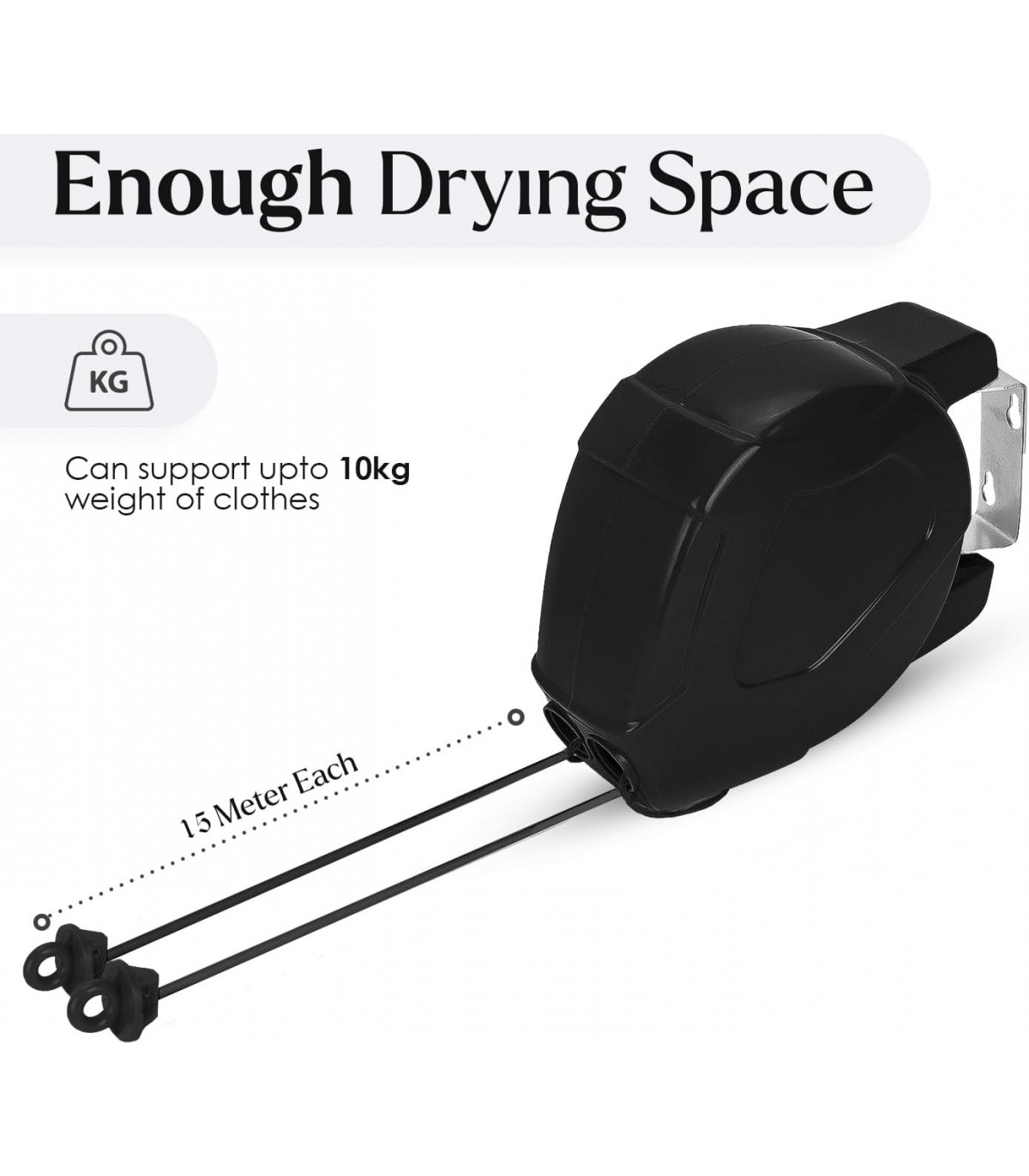 Features: - Double retractable cloth lines - Metal construction - Independently retractable lines - Fitting device to keep lines tight and secure - Automatic retraction system - Ideal for indoor and outdoor use The 30M Retractable Washing Line with Peg Bag in Black is the perfect solution for drying clothes both indoors and outdoors. The metal construction ensures durability and stability, while the double retractable cloth lines provide ample drying space. The lines can be used independently, allowing for customization based on the laundry load. The fitting device keeps the lines tight and secure at the desired distance, and the automatic retraction system makes rewinding easy and efficient. When not in use, both lines can be neatly folded back against the wall. This washing line is ideal for outdoor gardens and patio areas, providing a convenient and space-saving drying solution. Dimensions: - Weight: 20.00 kg - Length: 30M - Colour: Black