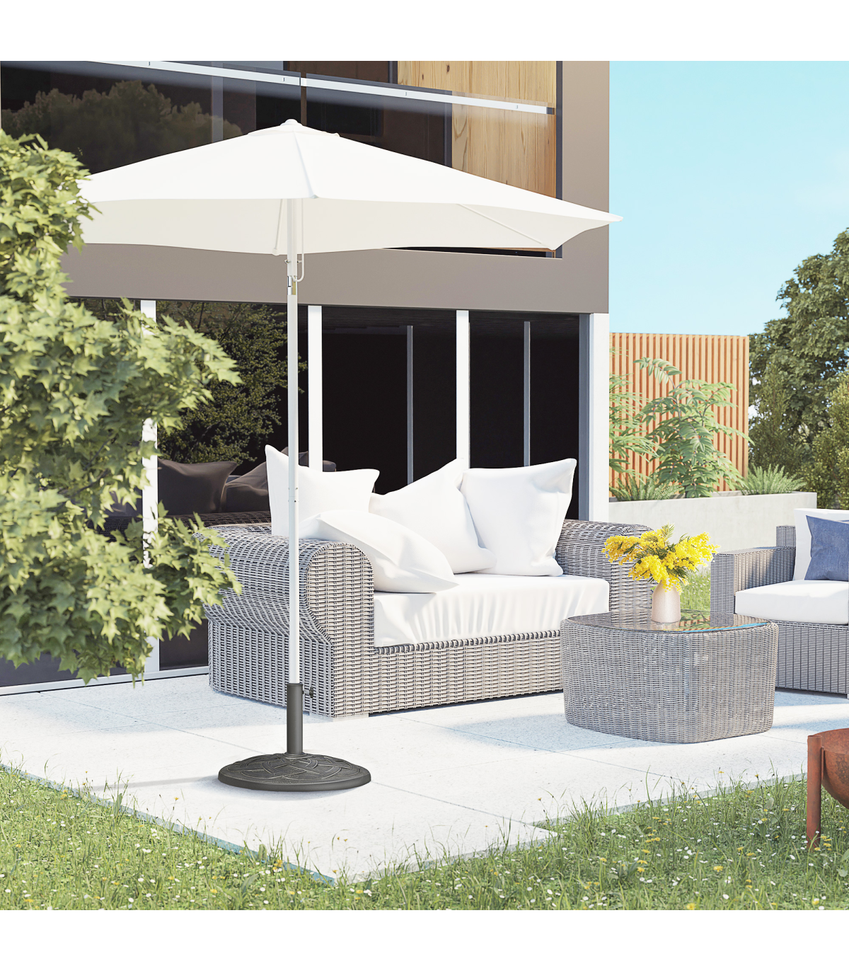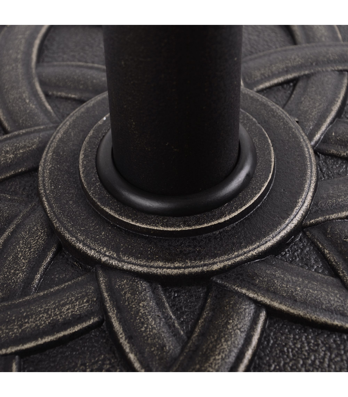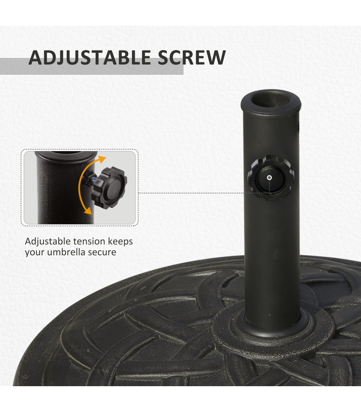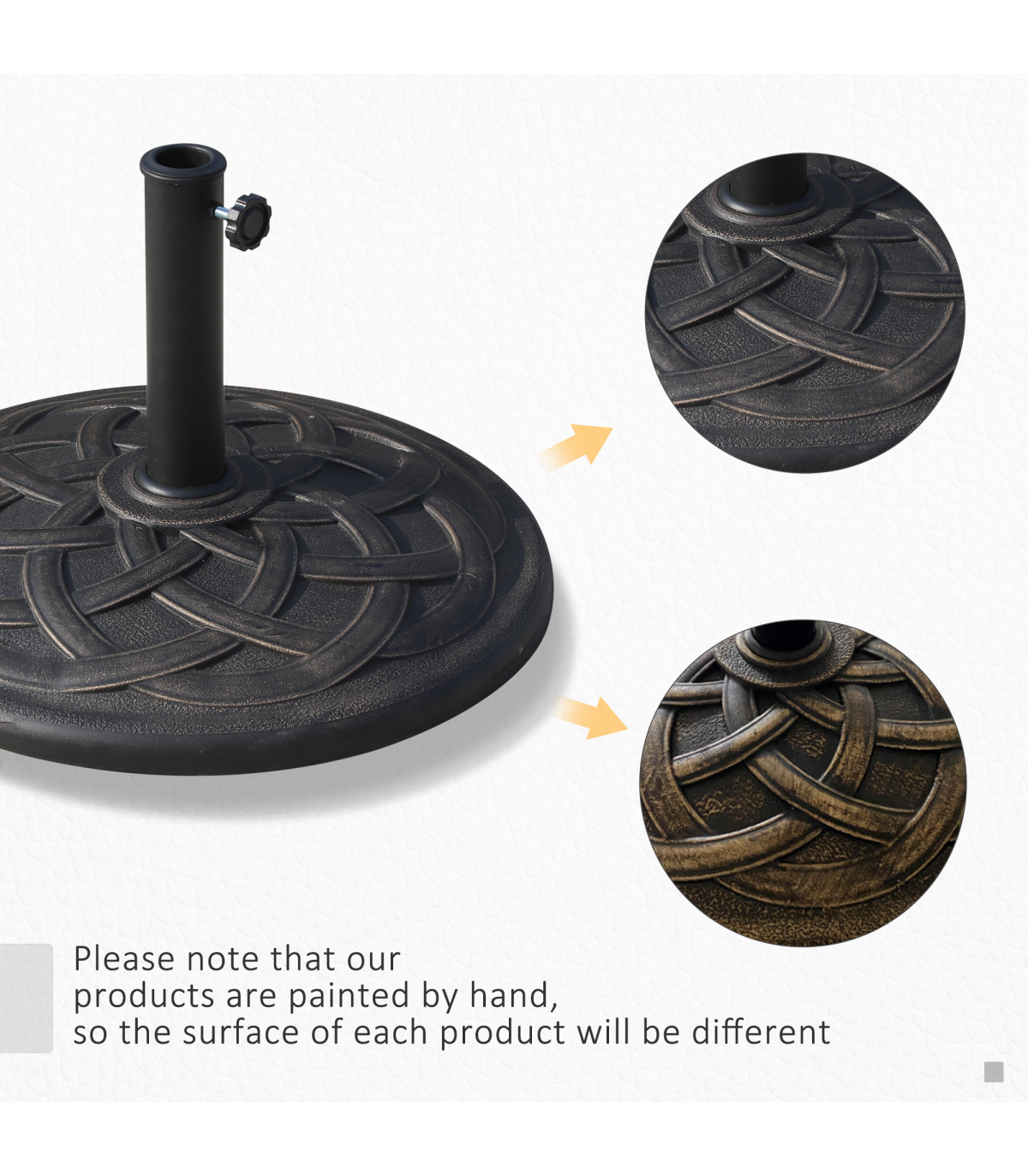This Outsunny brand circular umbrella base stand, offers a decorative, high-end touch to your outdoor living area while holding your umbrella in place. With a suttle finish, the base is designed to add charm and elegance to most backyard patio space. Made from resin, steel and plastic, this base is rust-resistant and made to last for years.