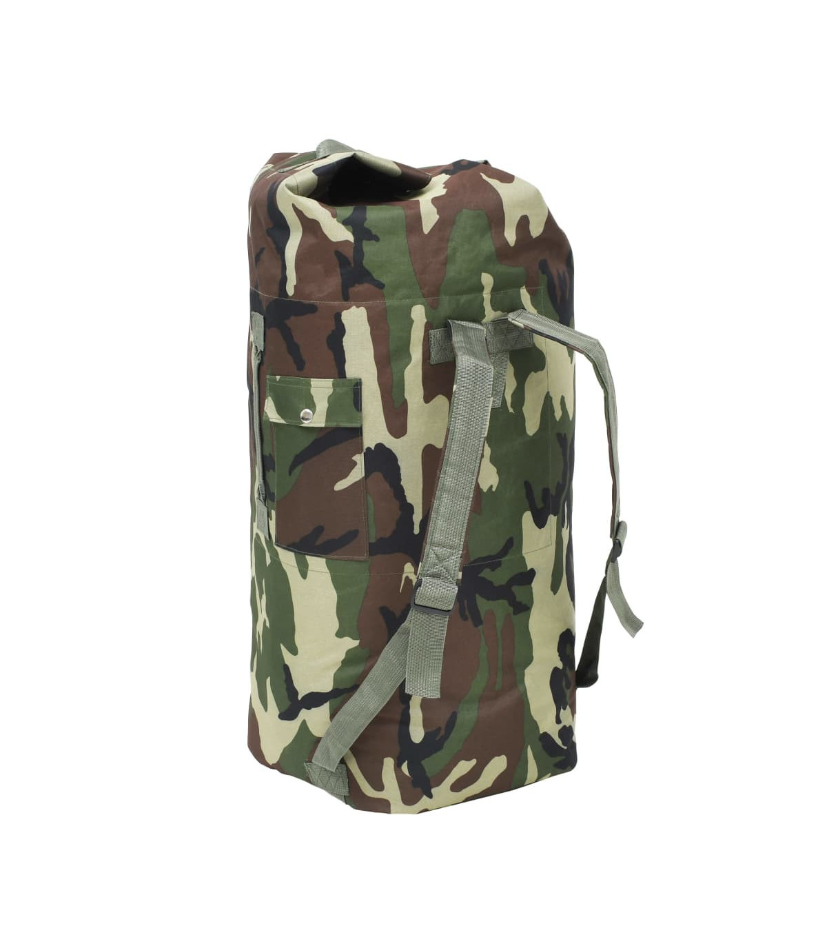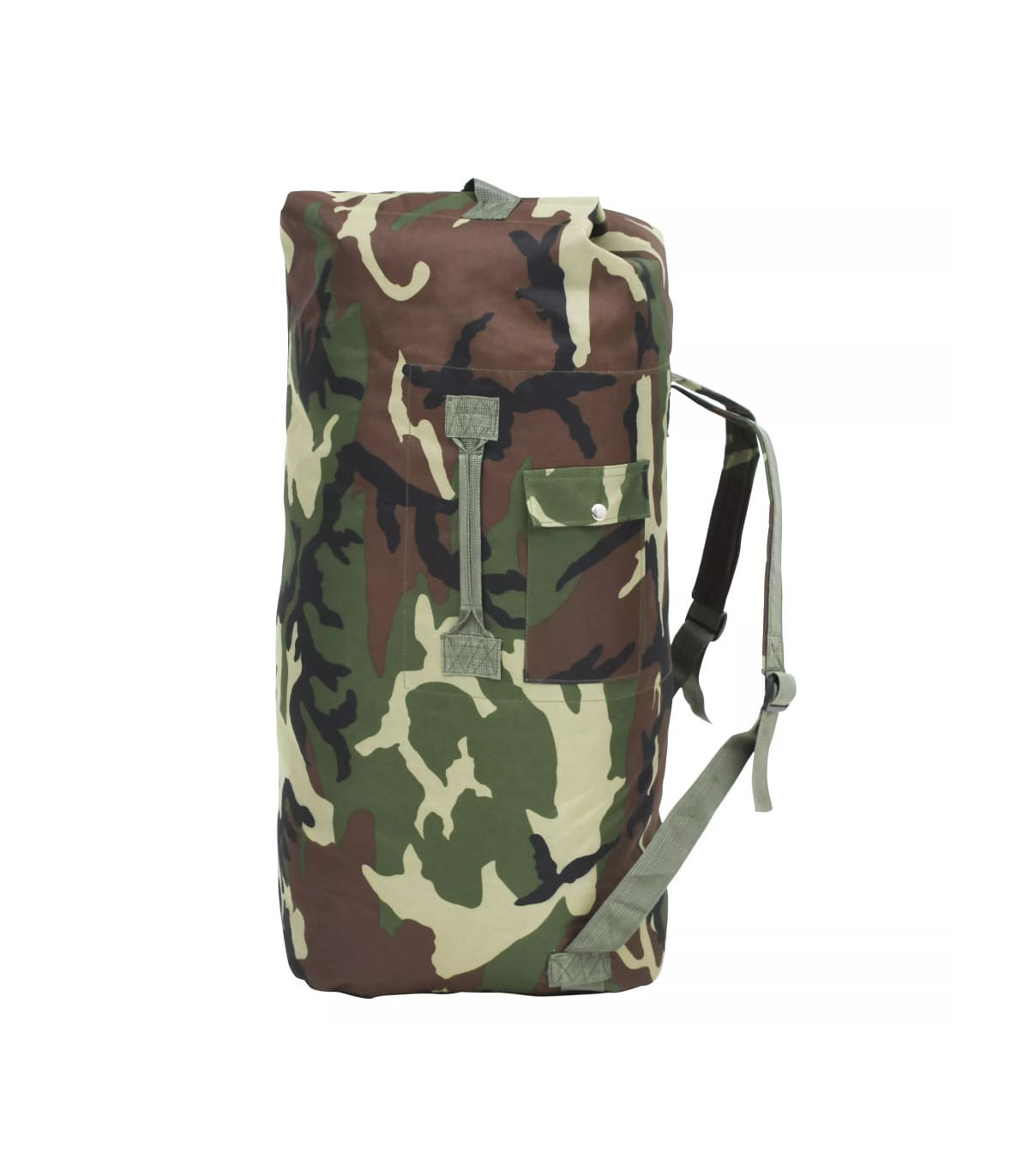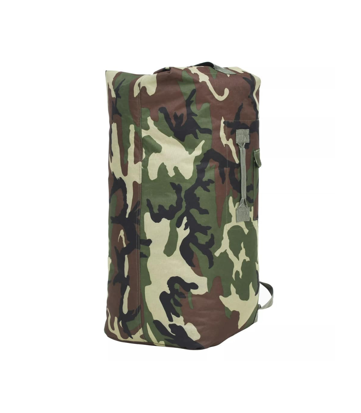 Our comfortable and practical army-style duffle bag is the ideal companion for travellers, but also for scouts, hunters, hikers and outdoor enthusiasts. Made of high-quality coated oxford fabric, this duffel bag is tear resistant, weather resistant and hardwearing. The army-style backpack features two soft, adjustable shoulder straps, a side carrying handle and a snap hook closure. The rucksack has a large capacity of 85 litres so you can pack everything you need on your outdoor adventures. The large main compartment can be used to store your big items and a small side pocket provides extra space for safely and conveniently storing the items you need close at hand, such as knives, glasses, etc.