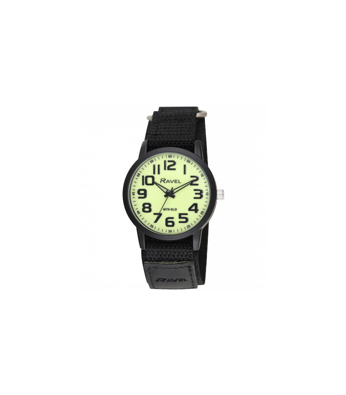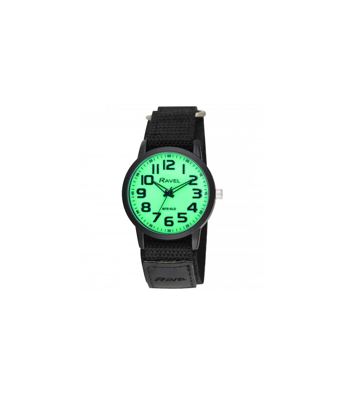 The Ravel Mens Nite Glo velcro provides the perfect watch for work and play. The clear Nite Glo dial with black bold arabic numbers makes telling the time easy and quick. The R1601 Velcro strap fits on the wrist comfortably whilst also being robust. Consistently good sellers!