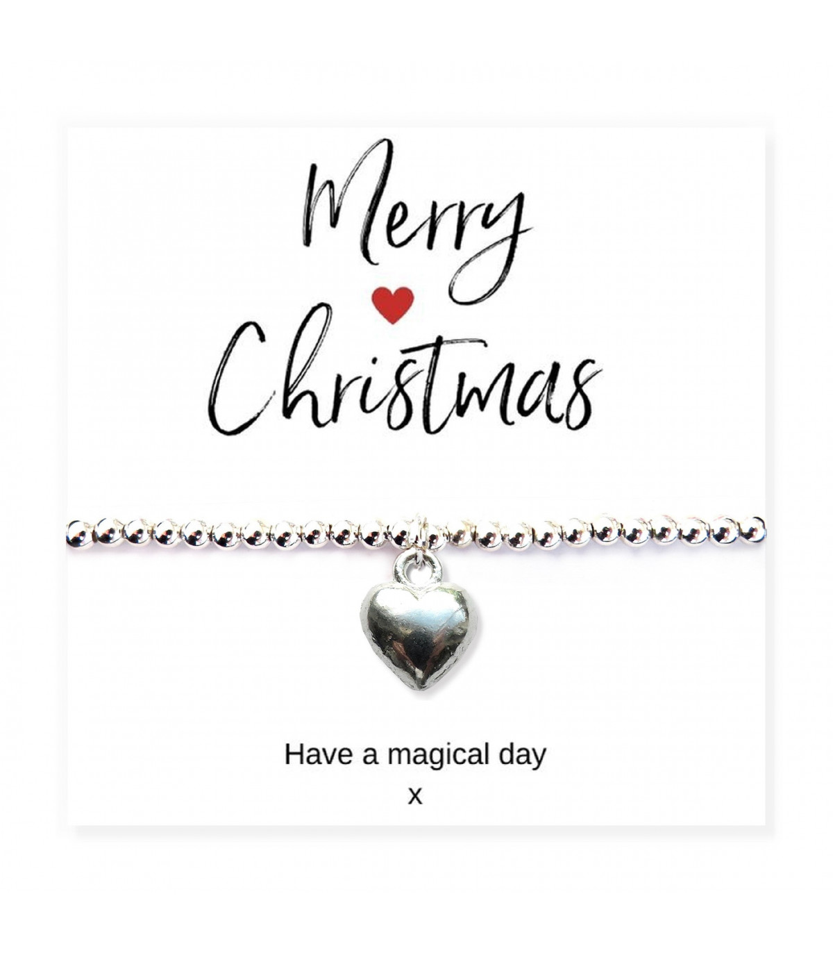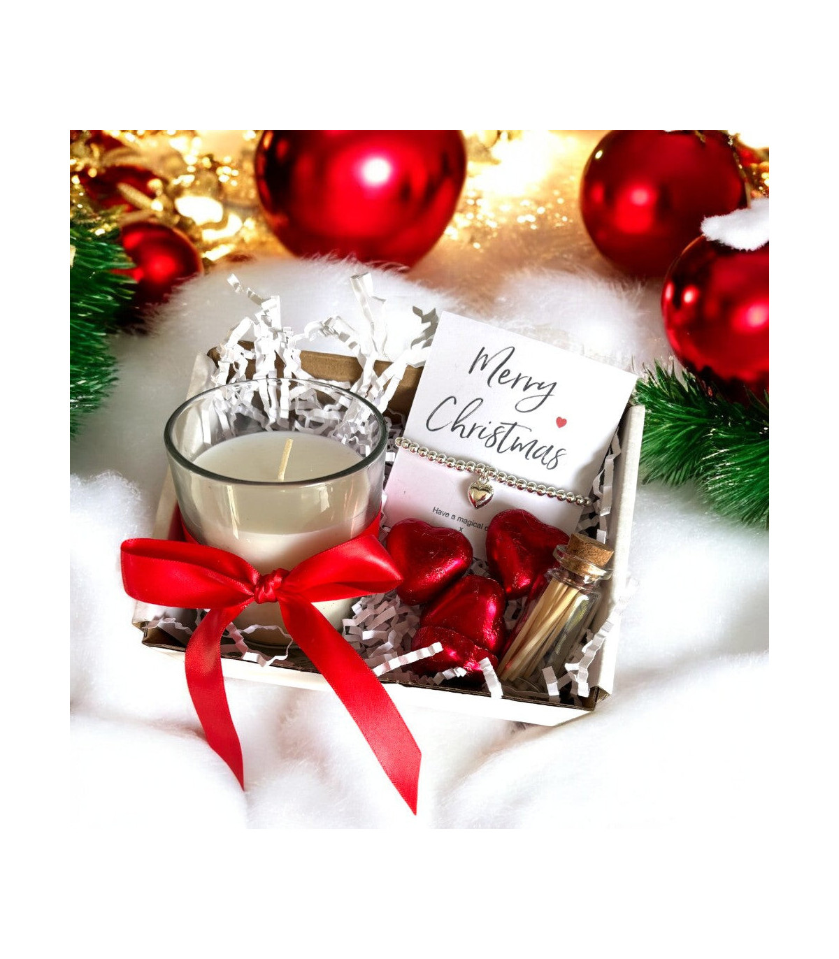 This lovely mini Christmas gift hamper includes heart-shaped silver plated bracelet, presented on a message card with the phrase "Merry Christmas Have magical day x". Additionally, the set comes with a beautiful linen scented candle with matches and four delicious milk chocolate hearts filled with creamy caramel centre. Perfect for mothers, sisters, daughters, aunts, or grandmothers, this delightful gift offers a small section for a personal note or the choice to keep it blank.