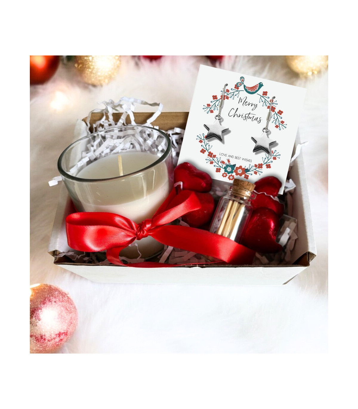 This festive Christmas gift hamper includes a star drop earrings, presented on a message card with the phrase "Merry Christmas, Love and Best Wishes". Additionally, the set comes with a beautiful linen scented candle with matches and four delicious milk chocolate hearts filled with creamy caramel centre. Perfect for mothers, sisters, daughters, aunts, or grandmothers, this delightful gift offers a small section for a personal note or the choice to keep it blank.