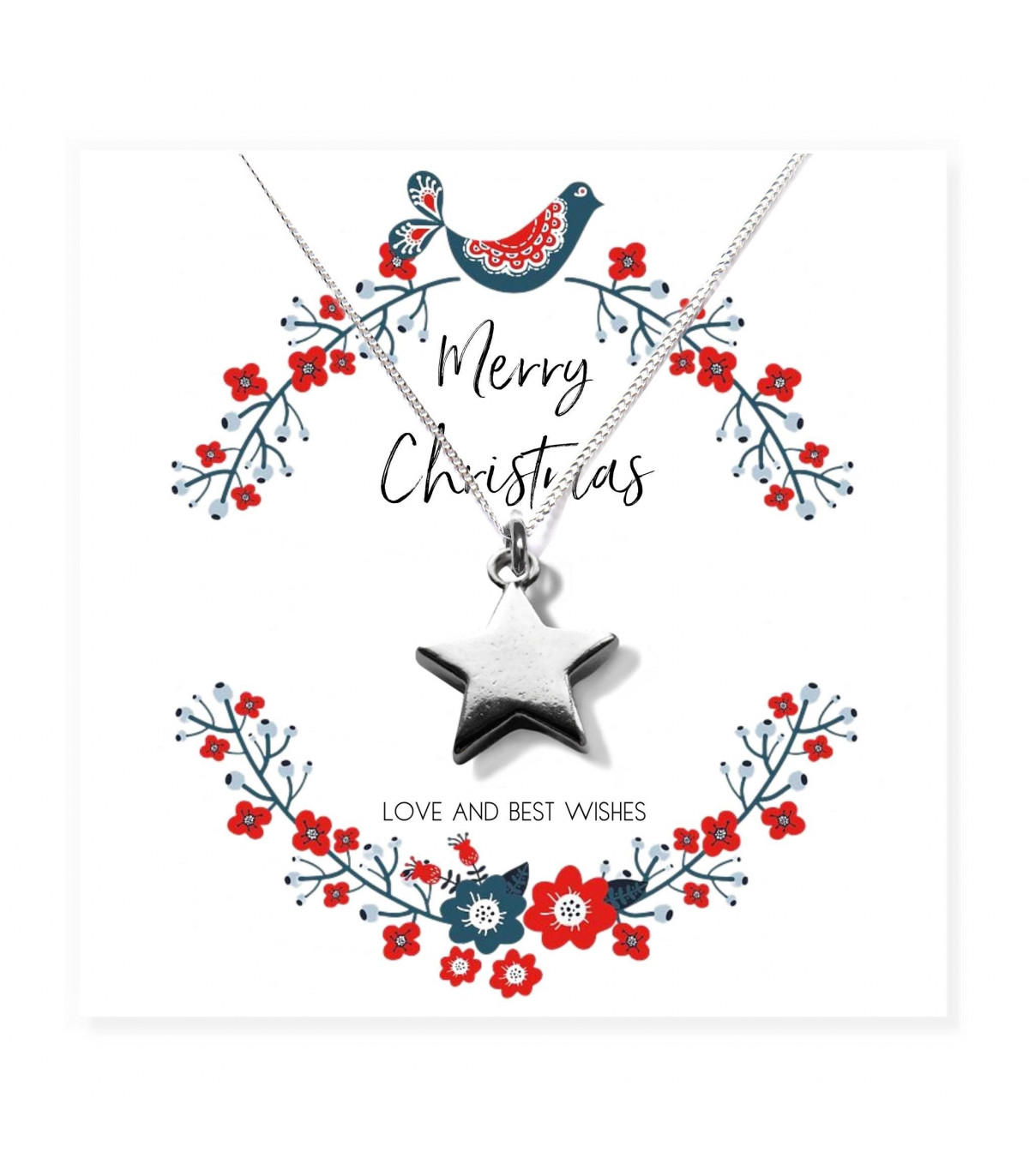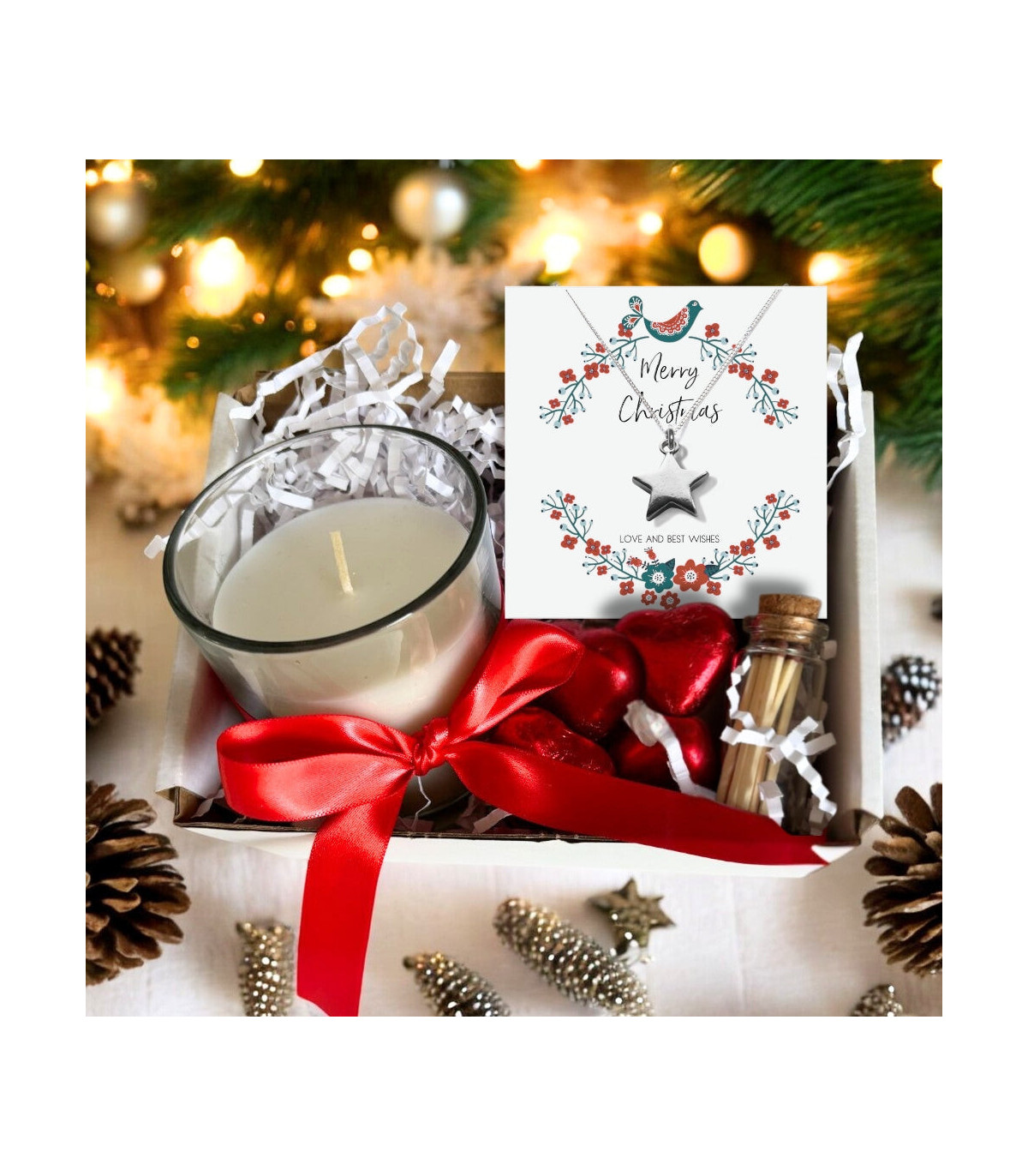 This festive Christmas gift hamper includes a sterling silver star necklace, presented on a message card with the phrase "Merry Christmas, Love and Best Wishes". Additionally, the set comes with a beautiful linen scented candle with matches and four delicious milk chocolate hearts filled with creamy caramel centre. Perfect for mothers, sisters, daughters, aunts, or grandmothers, this delightful gift offers a small section for a personal note or the choice to keep it blank.