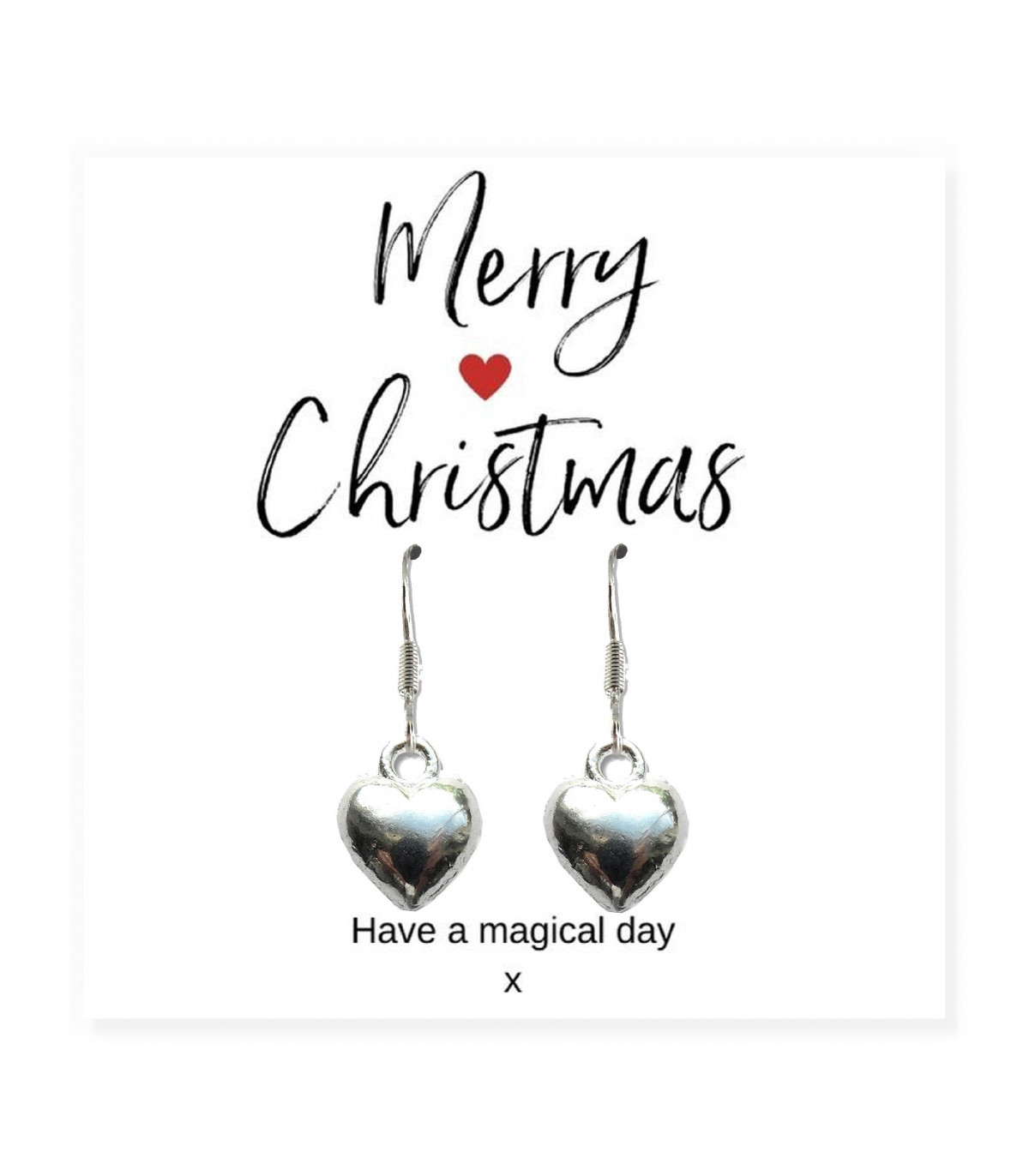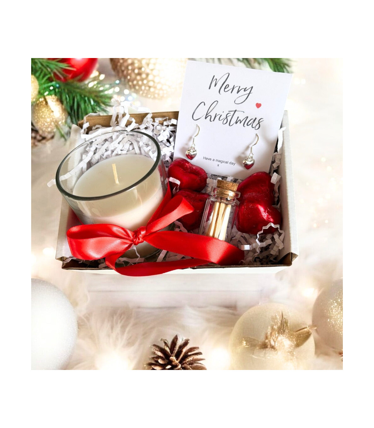 This elegant mini Christmas gift hamper includes heart-shaped silver plated earrings, presented on a message card with the phrase "Merry Christmas Have a magical day x". Additionally, the set comes with a lovely smelling linen scented candle with matches and four delicious milk chocolate hearts filled with creamy caramel centre. Perfect for mums, a sister, daughter, aunty, or grandmother, this pretty gift offers a small section for a personal note or the choice to keep it blank.